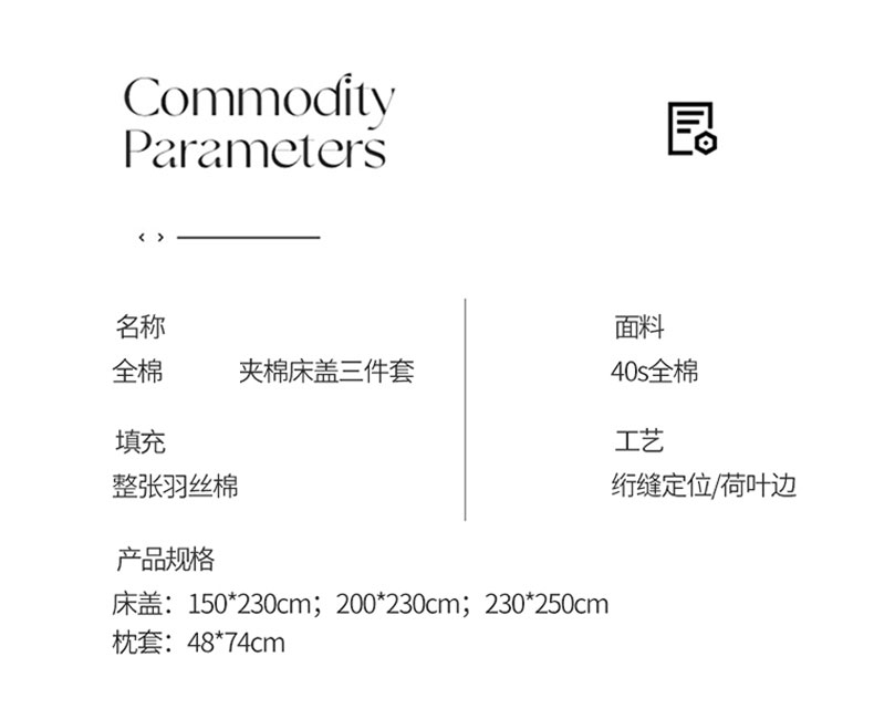 [{"sp_id":11,"sp_name":"\u989c\u8272","sp_format":2,"sp_list":[{"sp_value_id":1664,"sp_value_name":"\u8354\u679d\u7c89","sp_value_image":{"id":999,"path":"https:\/\/img3.91jf.com\/ghelp\/2026\/20260407\/20260407100839_607040.jpg"},"sp_value_video":{"id":0,"img":"","path":"","time":0,"download_num":0,"play_num":0},"price":"75.00","storage":3500,"weight":"1.000","is_check_weight":0,"plus_price":"","sp_sort":0}]},{"sp_id":24,"sp_name":"\u5c3a\u5bf8","sp_format":1,"sp_list":[{"sp_value_id":1674,"sp_value_name":"150*230cm\u5355\u5e8a\u76d6","sp_value_image":{"id":0,"path":""},"sp_value_video":{"id":0,"img":"","path":"","time":0,"download_num":0,"play_num":0},"price":"75.00","storage":500,"weight":"1.000","is_check_weight":0,"plus_price":"","sp_sort":0},{"sp_value_id":1675,"sp_value_name":"200*230cm\u5355\u5e8a\u76d6","sp_value_image":{"id":0,"path":""},"sp_value_video":{"id":0,"img":"","path":"","time":0,"download_num":0,"play_num":0},"price":"85.00","storage":500,"weight":"1.000","is_check_weight":0,"plus_price":"","sp_sort":0},{"sp_value_id":1676,"sp_value_name":"230*250cm\u5355\u5e8a\u76d6","sp_value_image":{"id":0,"path":""},"sp_value_video":{"id":0,"img":"","path":"","time":0,"download_num":0,"play_num":0},"price":"95.00","storage":500,"weight":"1.000","is_check_weight":0,"plus_price":"","sp_sort":0},{"sp_value_id":1677,"sp_value_name":"150*230cm\u5e8a\u76d6\u4e09\u4ef6\u5957","sp_value_image":{"id":0,"path":""},"sp_value_video":{"id":0,"img":"","path":"","time":0,"download_num":0,"play_num":0},"price":"105.00","storage":500,"weight":"2.000","is_check_weight":0,"plus_price":"","sp_sort":0},{"sp_value_id":1678,"sp_value_name":"200*230cm\u5e8a\u76d6\u4e09\u4ef6\u5957","sp_value_image":{"id":0,"path":""},"sp_value_video":{"id":0,"img":"","path":"","time":0,"download_num":0,"play_num":0},"price":"115.00","storage":500,"weight":"2.000","is_check_weight":0,"plus_price":"","sp_sort":0},{"sp_value_id":1679,"sp_value_name":"230*250cm\u5e8a\u76d6\u4e09\u4ef6\u5957","sp_value_image":{"id":0,"path":""},"sp_value_video":{"id":0,"img":"","path":"","time":0,"download_num":0,"play_num":0},"price":"125.00","storage":500,"weight":"2.000","is_check_weight":0,"plus_price":"","sp_sort":0},{"sp_value_id":1680,"sp_value_name":"\u6795\u5957\u4e00\u5bf9","sp_value_image":{"id":0,"path":""},"sp_value_video":{"id":0,"img":"","path":"","time":0,"download_num":0,"play_num":0},"price":"30.00","storage":500,"weight":"0.500","is_check_weight":0,"plus_price":"","sp_sort":0}]}]