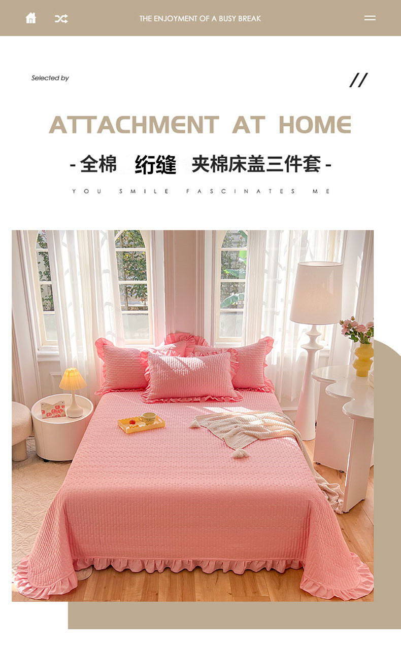 当前位置: 91家纺网 > 商品网购 > 床上用品 > 床盖 > 花香四季家纺 2026新款13376全棉夹棉床盖三件套13372纯棉纯色床盖花边公主风(可定制任意尺寸) 荔枝粉