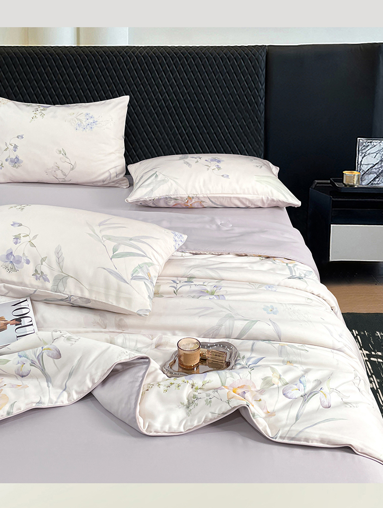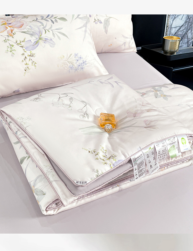 • 91家纺网 家纺一手货源 找家纺 尊妙被业 2026春夏新款莱赛尔天丝夏被蚕蛹蛋白夏被夏凉被空调被四件套-印花款 林屿间-粉