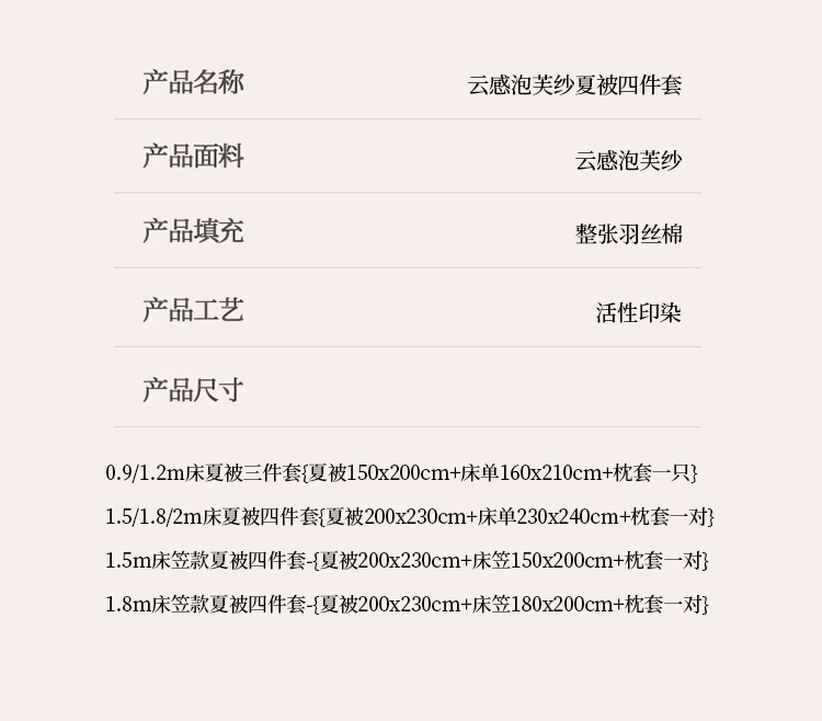 [{"sp_id":1,"sp_name":"\u989c\u8272","sp_format":2,"sp_list":[{"sp_value_id":660,"sp_value_name":"\u7c89\u8272\u661f\u661f","sp_value_image":{"id":999,"path":"https:\/\/img3.91jf.com\/ghelp\/2026\/20260417\/20260417105858_854140.jpeg"},"sp_value_video":{"id":0,"img":"","path":"","time":0,"download_num":0,"play_num":0},"price":"48.00","storage":1500,"weight":"3.000","is_check_weight":0,"plus_price":"","sp_sort":18}]},{"sp_id":27,"sp_name":"\u5c3a\u5bf8","sp_format":1,"sp_list":[{"sp_value_id":302,"sp_value_name":"150x200cm\u5355\u590f\u88ab+\u5e8a\u5355+\u6795\u5957\u4e00\u53ea","sp_value_image":{"id":0,"path":""},"sp_value_video":{"id":0,"img":"","path":"","time":0,"download_num":0,"play_num":0},"price":"48.00","storage":0,"weight":"3.000","is_check_weight":0,"plus_price":"","sp_sort":5},{"sp_value_id":303,"sp_value_name":"200x230cm\u5355\u590f\u88ab+\u5e8a\u5355+\u6795\u5957\u4e00\u5bf9","sp_value_image":{"id":0,"path":""},"sp_value_video":{"id":0,"img":"","path":"","time":0,"download_num":0,"play_num":0},"price":"56.00","storage":500,"weight":"3.000","is_check_weight":0,"plus_price":"","sp_sort":6},{"sp_value_id":304,"sp_value_name":"200x230cm\u5355\u590f\u88ab+1.5\u5e8a\u7b20+\u6795\u5957\u4e00\u5bf9","sp_value_image":{"id":0,"path":""},"sp_value_video":{"id":0,"img":"","path":"","time":0,"download_num":0,"play_num":0},"price":"60.00","storage":500,"weight":"3.000","is_check_weight":0,"plus_price":"","sp_sort":7},{"sp_value_id":305,"sp_value_name":"200x230cm\u5355\u590f\u88ab+1.8\u5e8a\u7b20+\u6795\u5957\u4e00\u5bf9","sp_value_image":{"id":0,"path":""},"sp_value_video":{"id":0,"img":"","path":"","time":0,"download_num":0,"play_num":0},"price":"62.00","storage":500,"weight":"3.000","is_check_weight":0,"plus_price":"","sp_sort":8}]}]