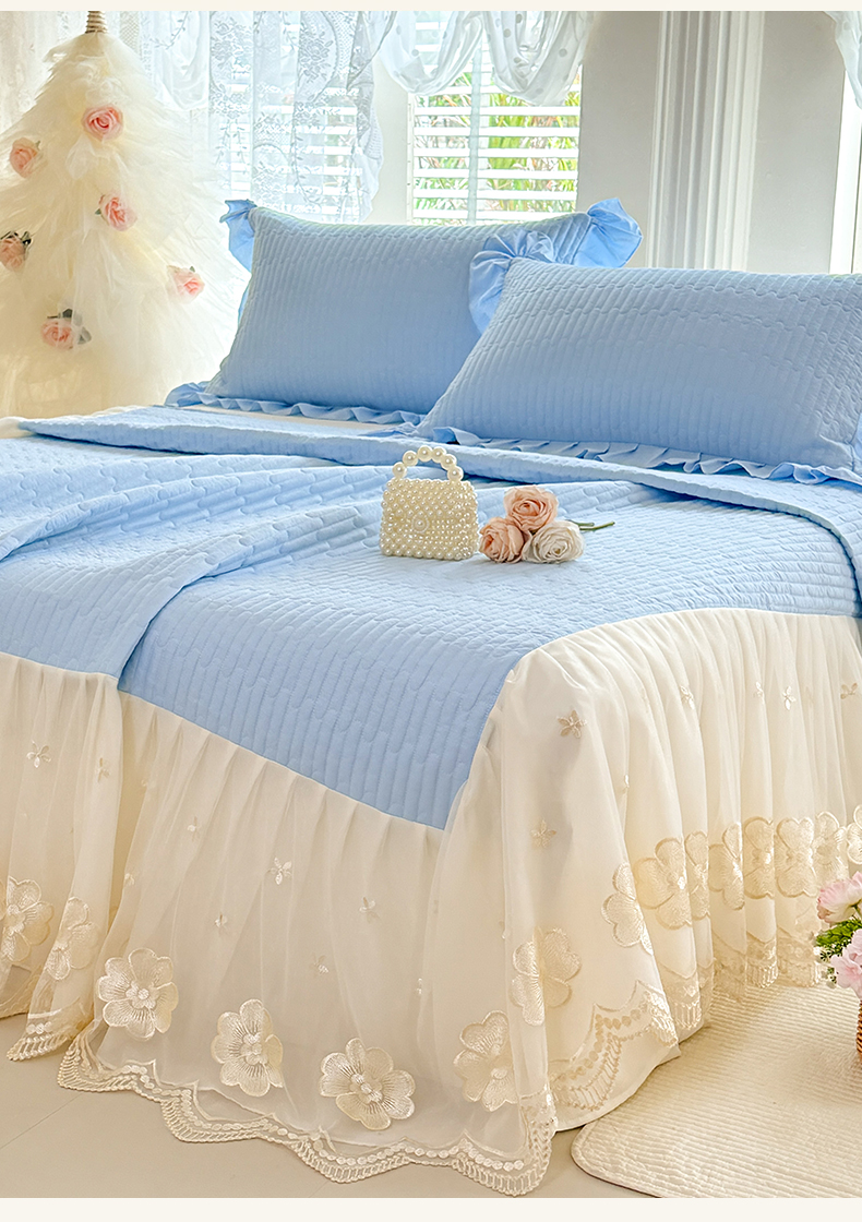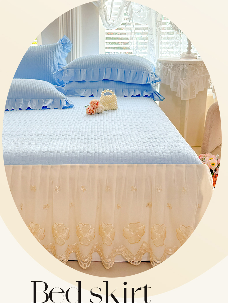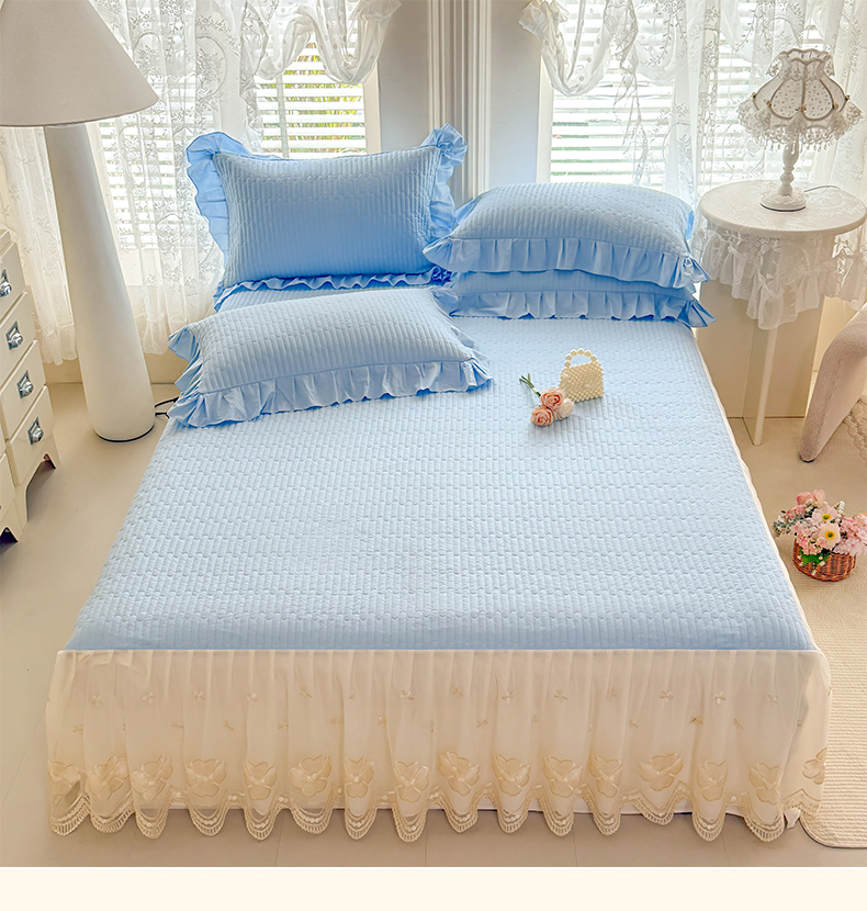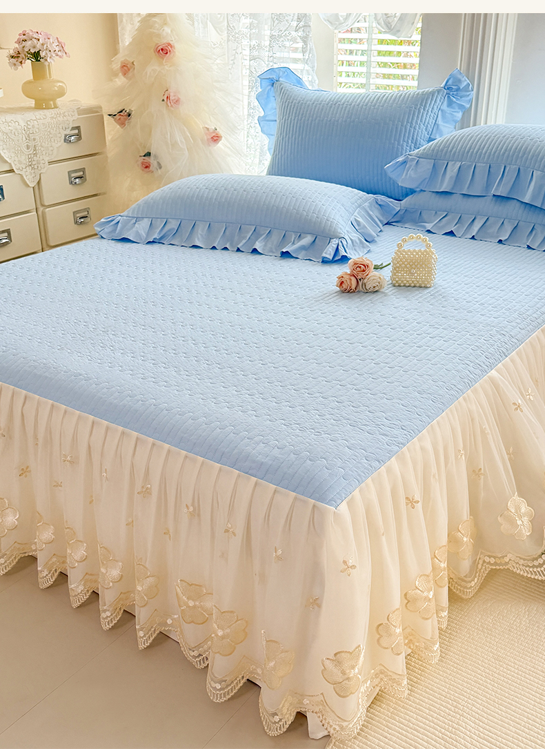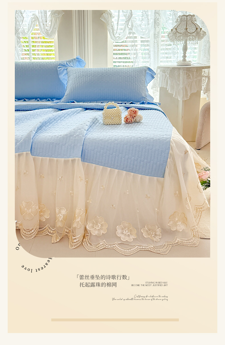 • 91家纺网 家纺一手货源 找家纺 花香四季家纺 2026新款全棉夹棉绗缝床裙三件套纯棉纯色蕾丝公主风床裙单件-蕾丝小姐 蕾丝小姐-海盐蓝