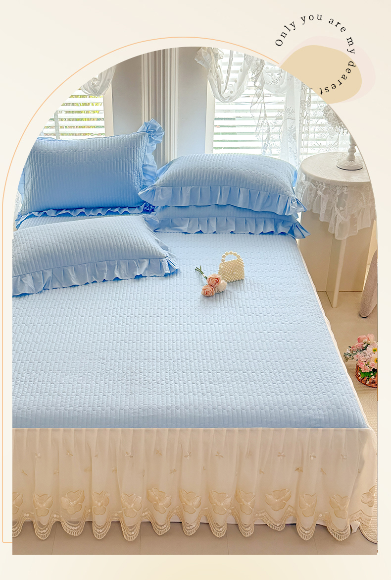 花香四季家纺 2026新款全棉夹棉绗缝床裙三件套纯棉纯色蕾丝公主风床裙单件-蕾丝小姐 蕾丝小姐-海盐蓝
