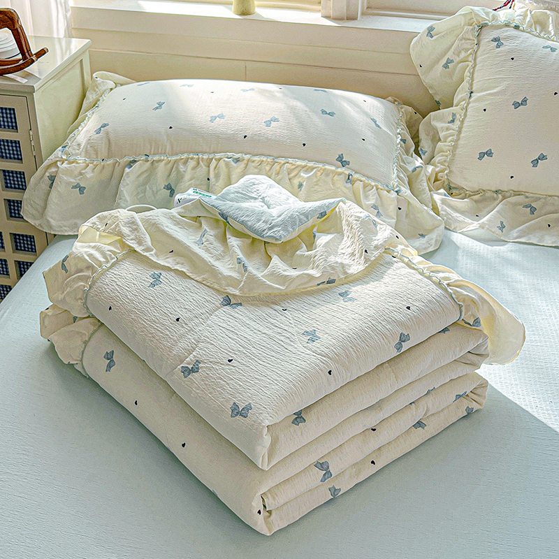 一比一家纺 2026春夏新款法式大花边木棉皱皱纱夏被夏凉被空调被四件套 芝士奶盖