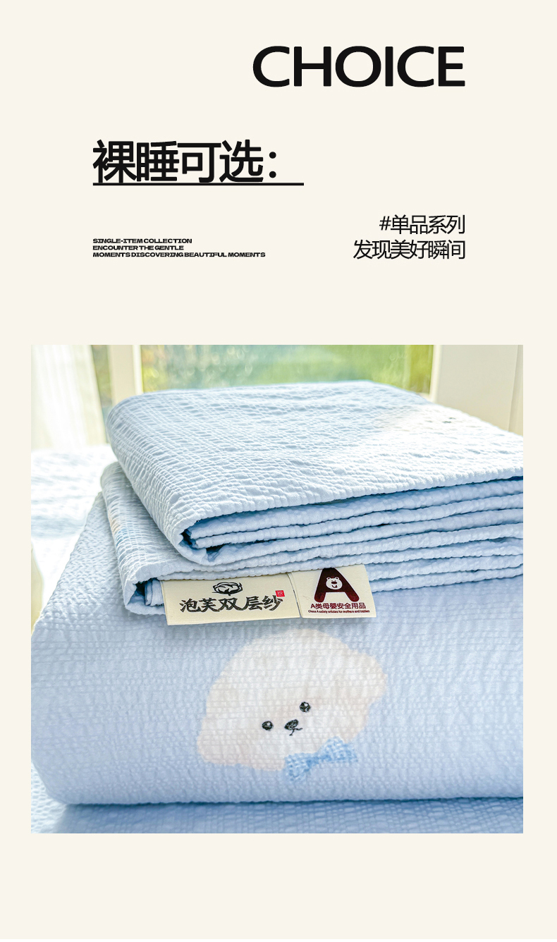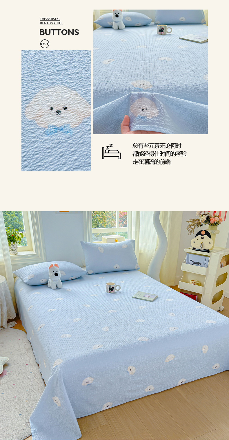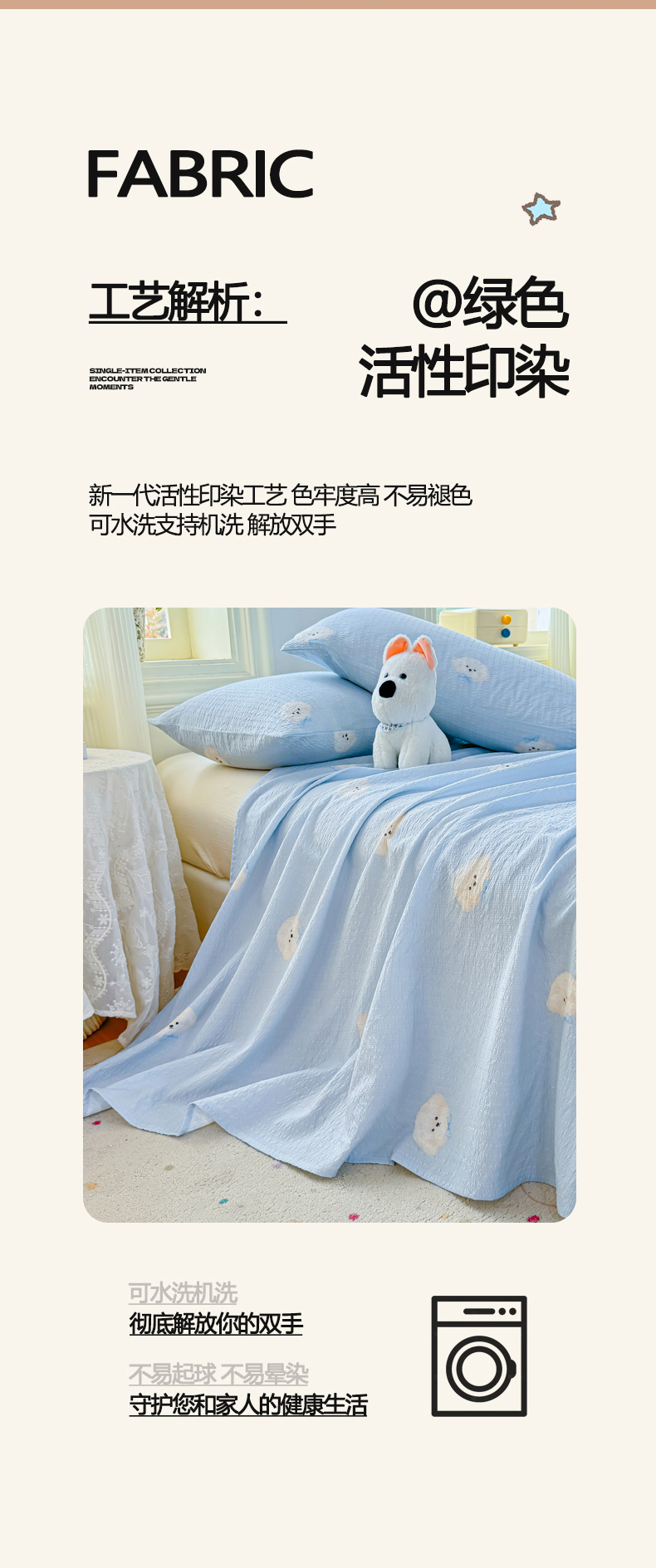 • 91家纺网 家纺一手货源 找家纺 梵朴 2026新款A类泡芙纱云感邹邹纱双层纱单床单 蓝色领结狗