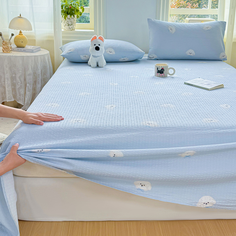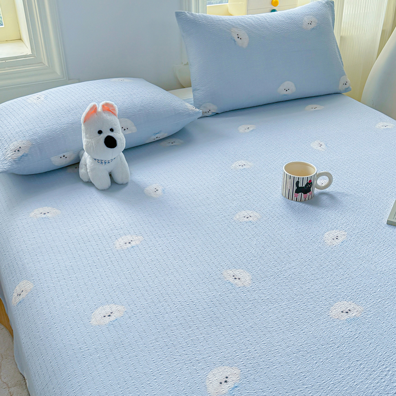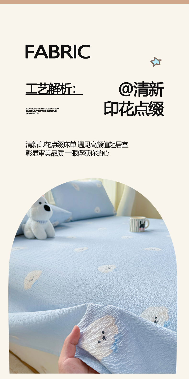 (总)梵朴 2026新款A类泡芙棉云感木棉邹邹纱双层纱床笠三件套,豹纹泡芙狗,花从小兔,花季紫,蝴蝶结小兔,酒渍櫻桃,春日花语,璀璨星空,费尔岛木马,快乐马里奥,快乐小狗,蓝调爱心,蓝色领结狗,猫咪蓝,萌宠,木马小花,暖檣枝,泡芙KT-绿,泡芙KT-紫,甜品萌狗,星星玩偶黄,星星玩偶紫,紫花免