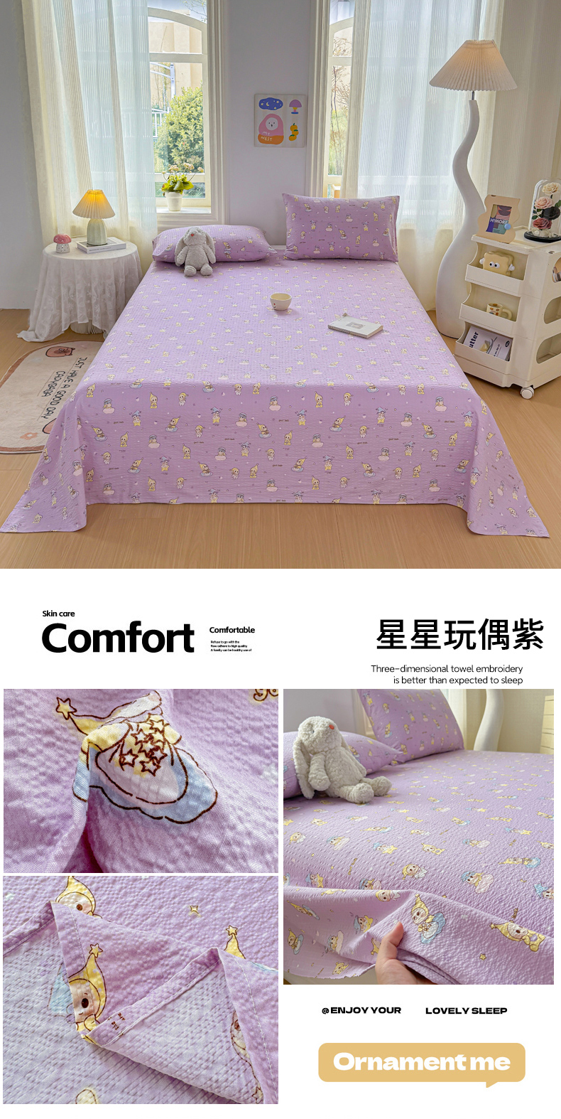• 91家纺网 家纺一手货源 找家纺 梵朴 2026新款A类泡芙纱云感邹邹纱双层纱单床单 紫花兔