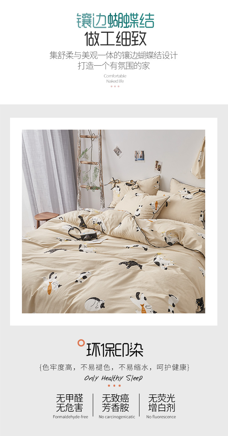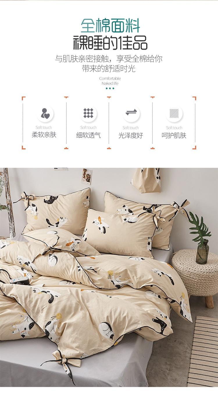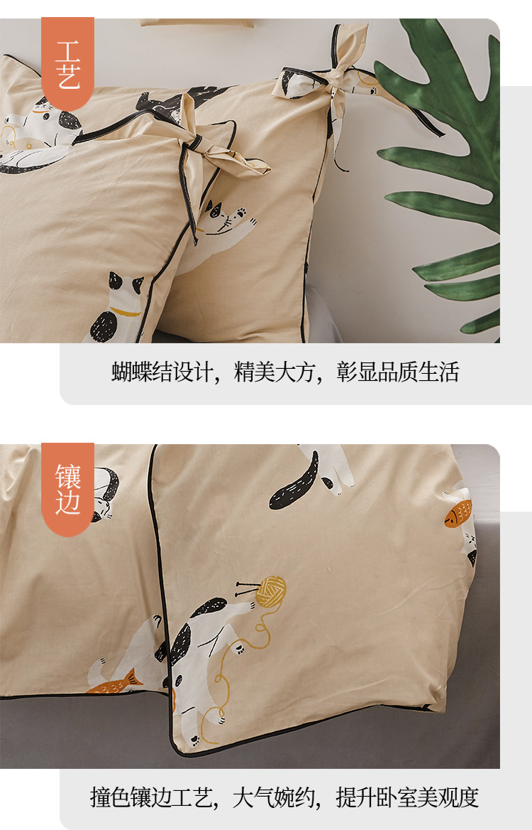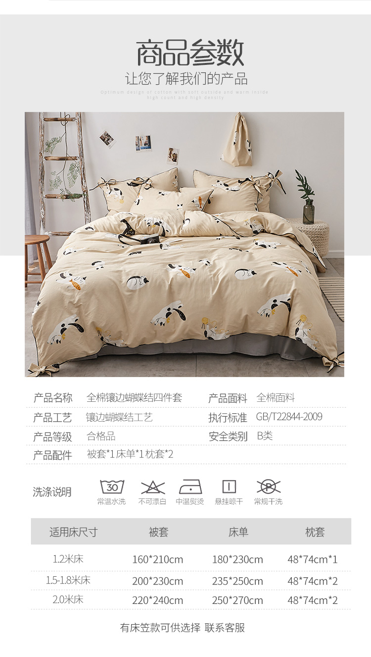 商品名称:棉眠 2019春夏新款全棉镶边蝴蝶结四件套 床单款 肥猫猫