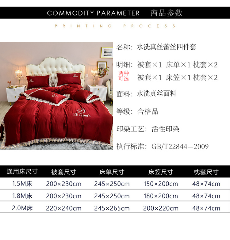 商品名称:米奈家居 2021新款水洗真丝蕾丝花边爱琳四件套 大红