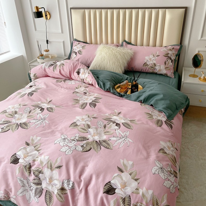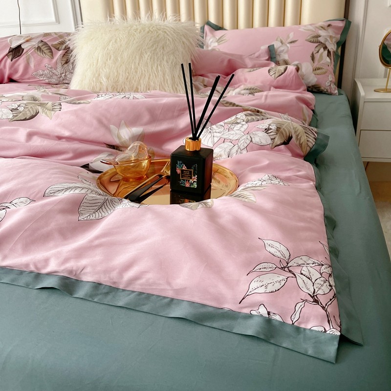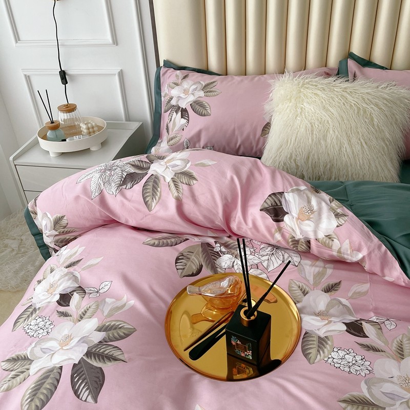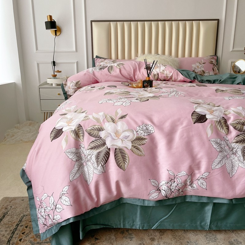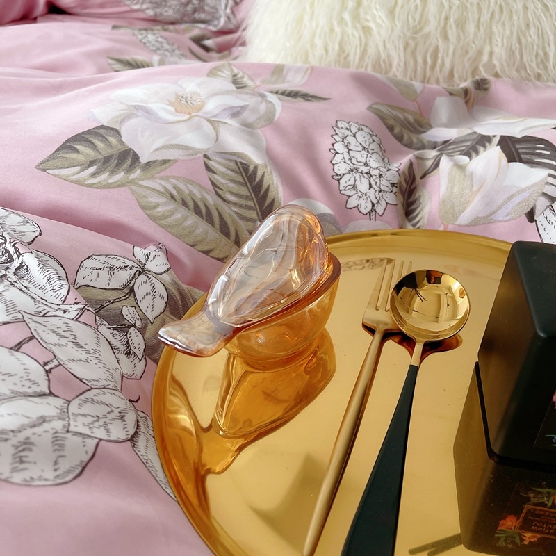 蘭菲2023新款60支贡缎长绒棉印花美式花卉四件套铃兰花梦粉