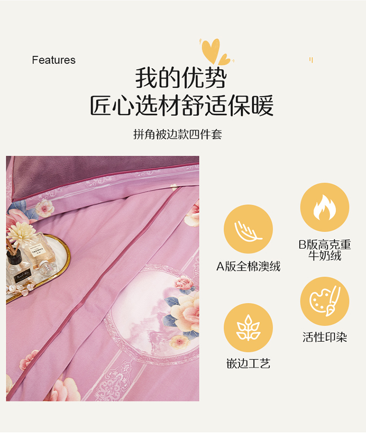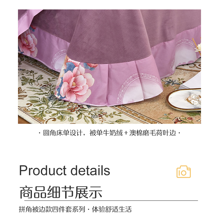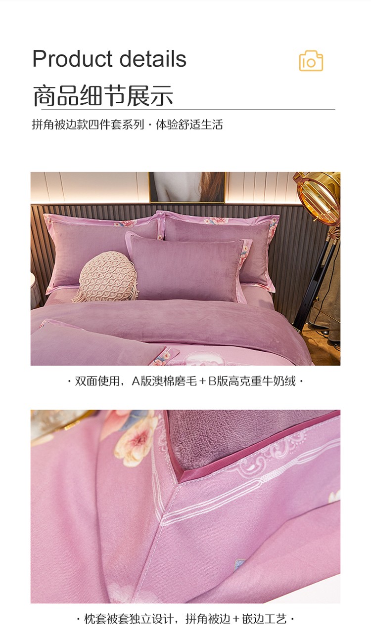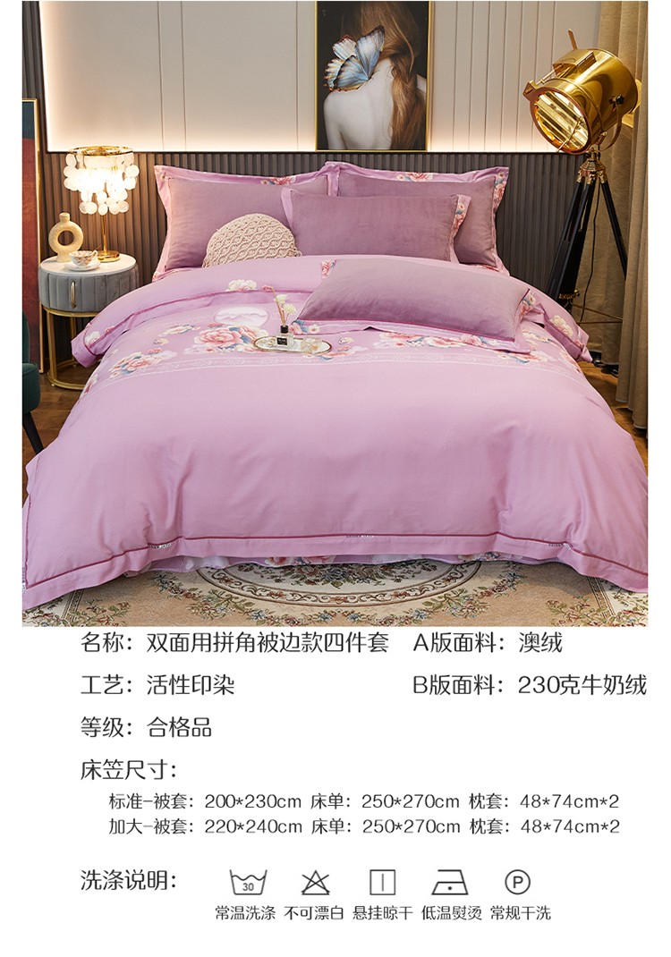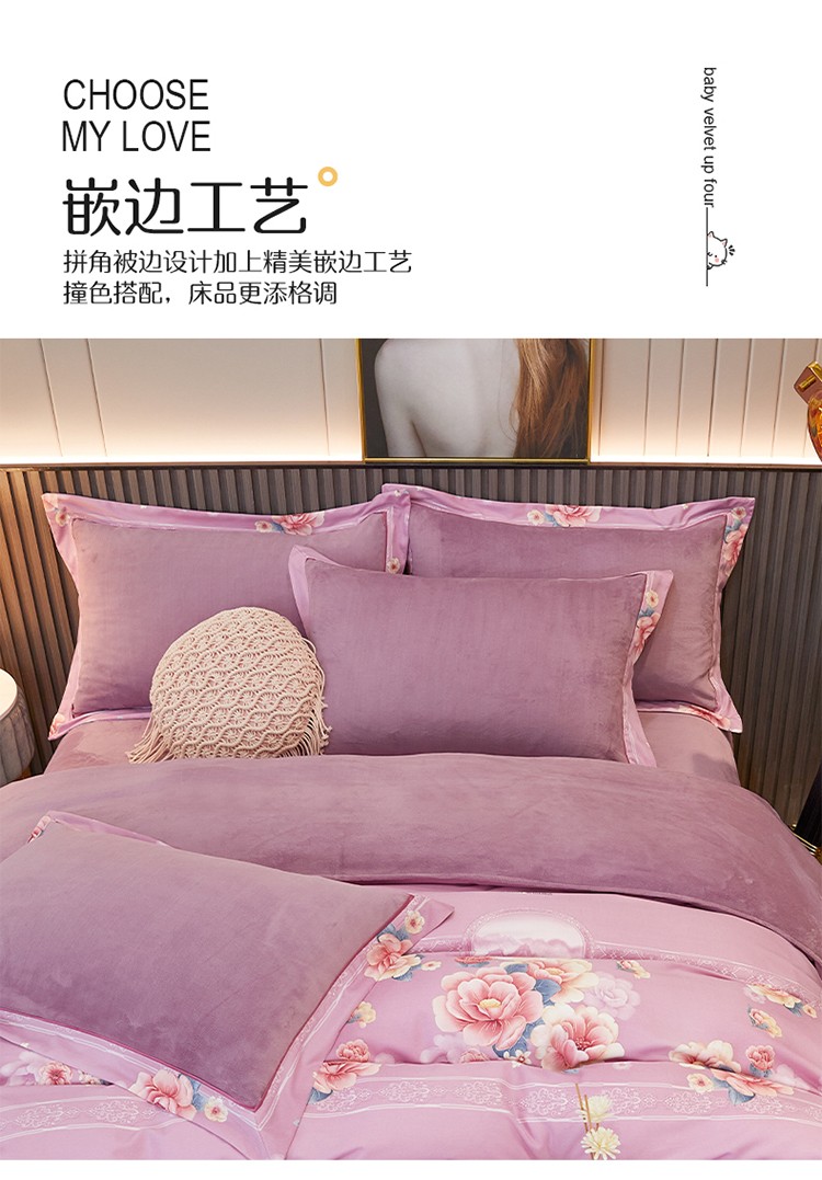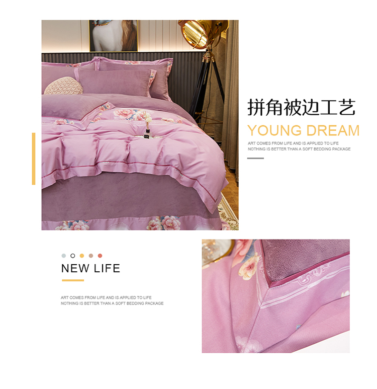 商品名称:杜先生2021新款230克牛奶绒拼角被边款四件套锦绣花期-粉