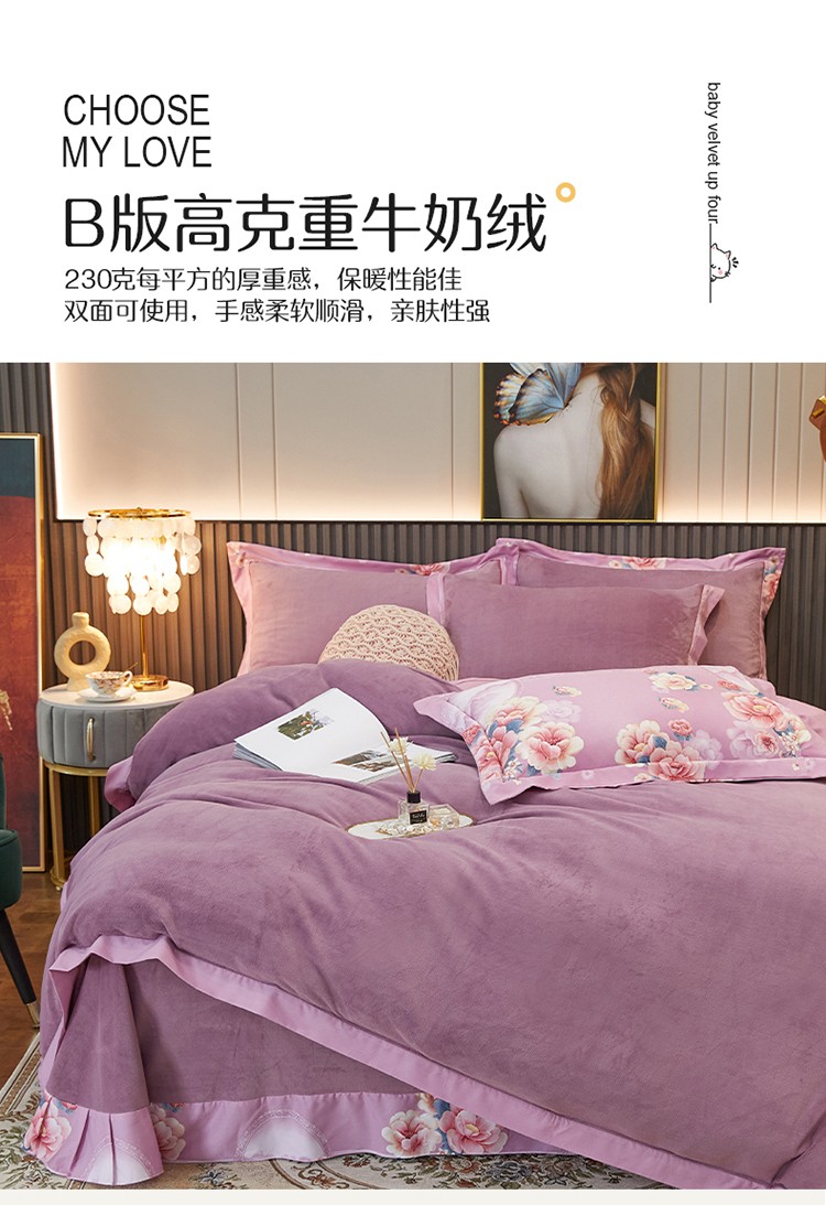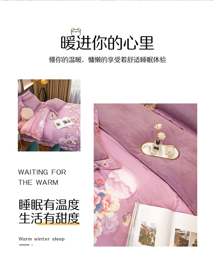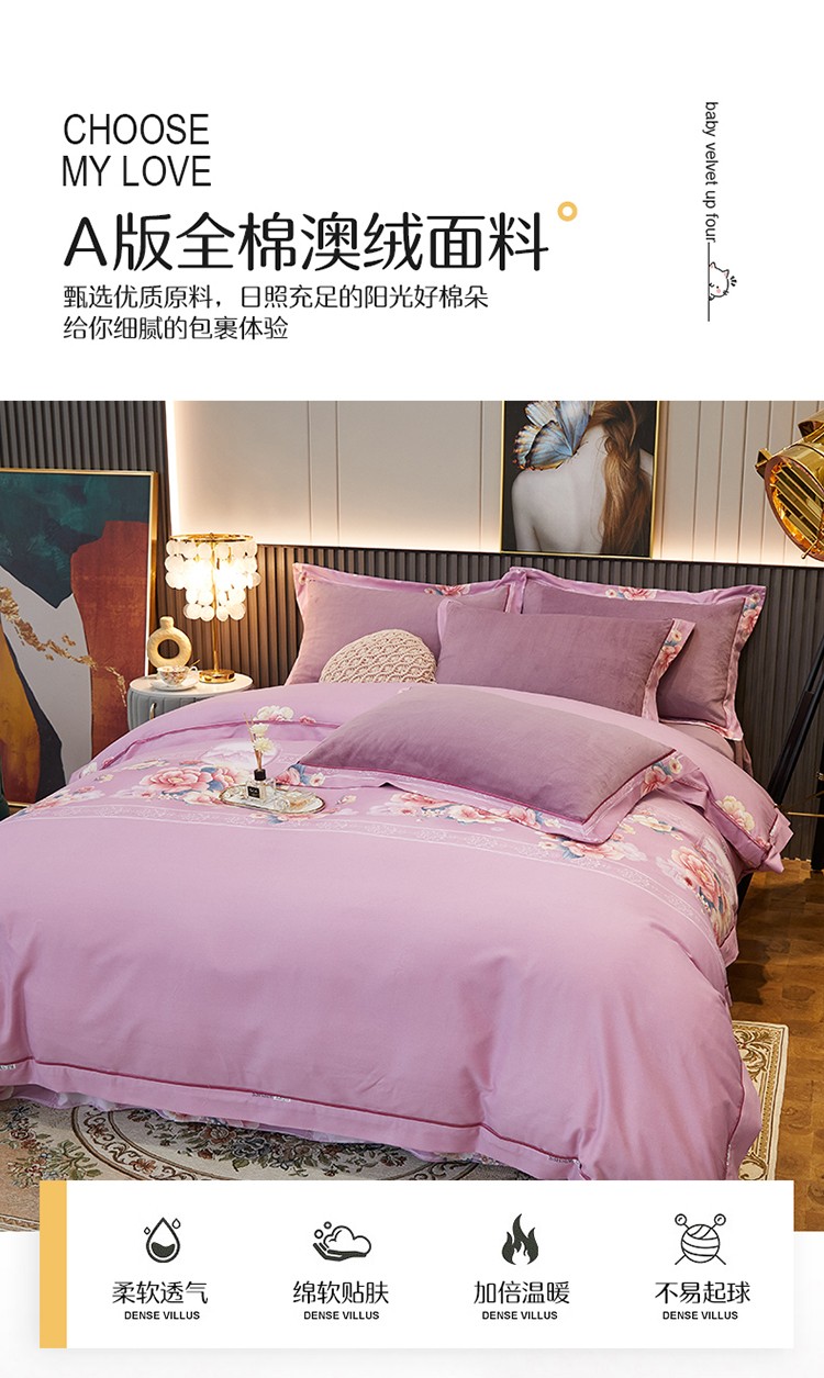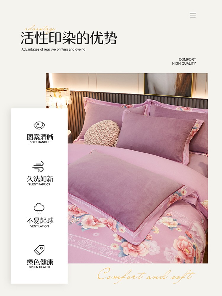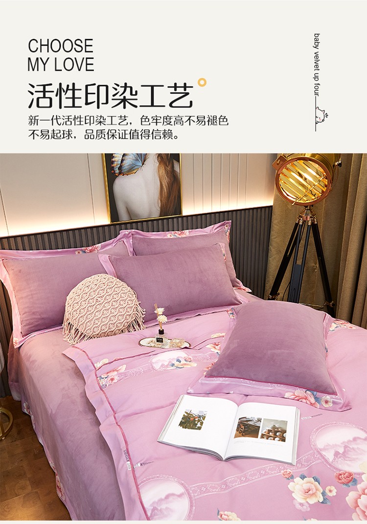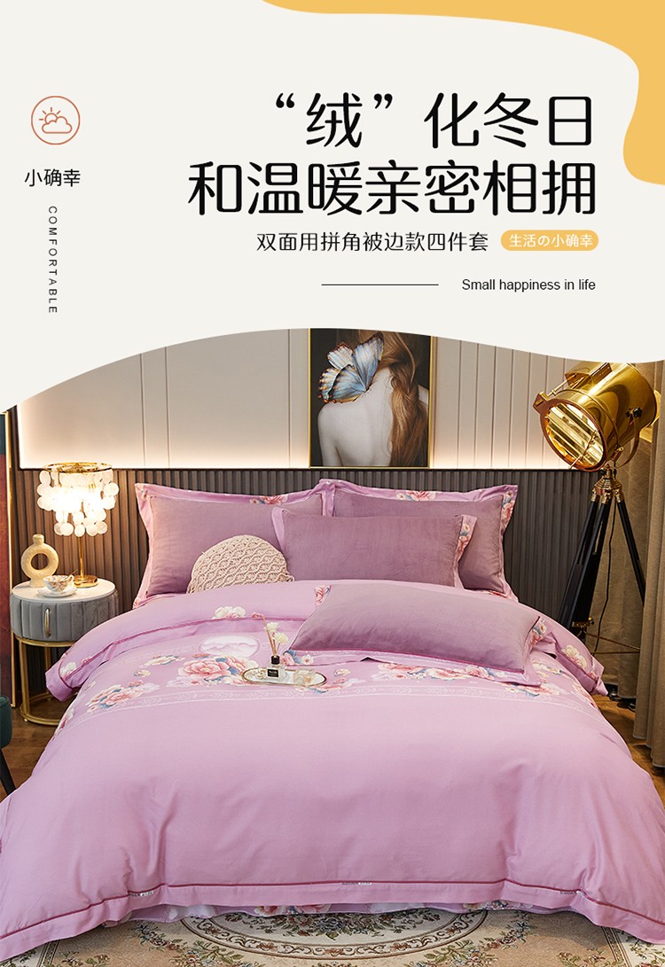 商品名称:杜先生2021新款230克牛奶绒拼角被边款四件套锦绣花期-粉