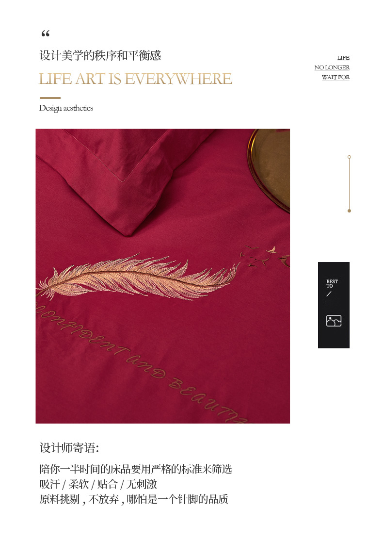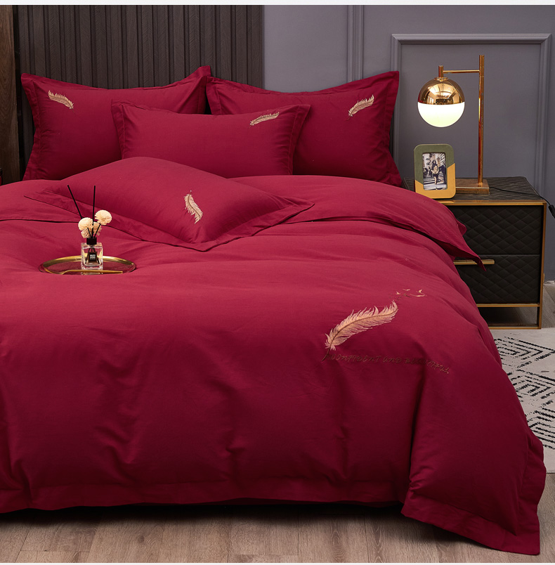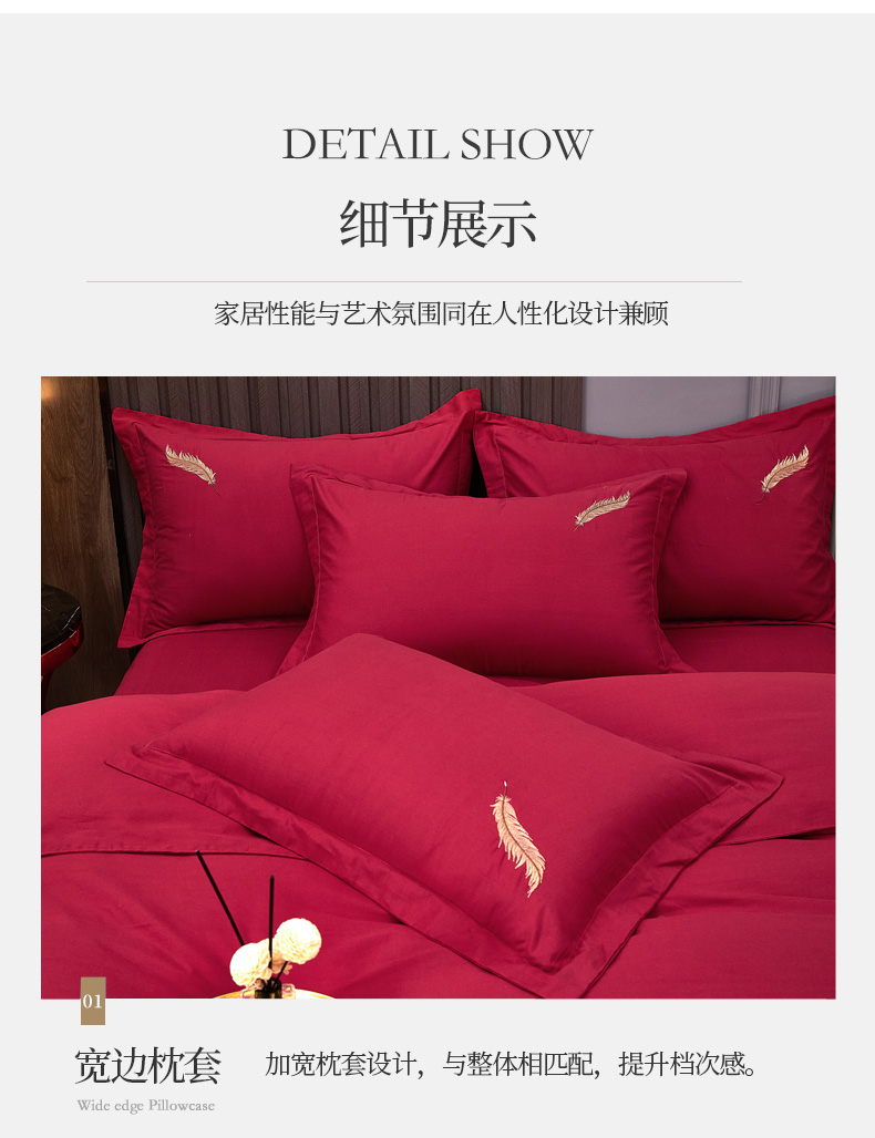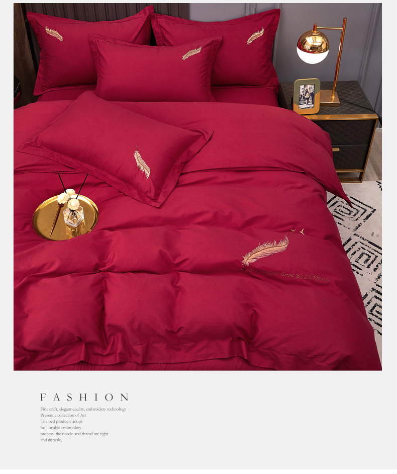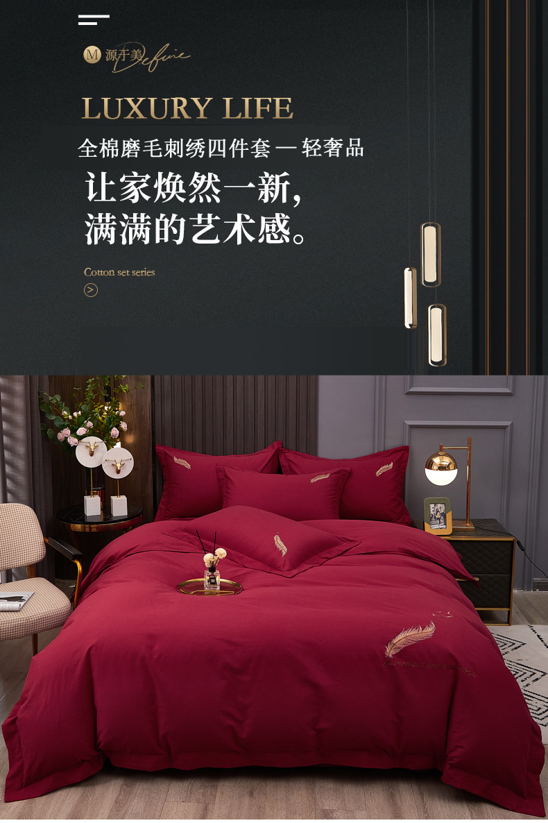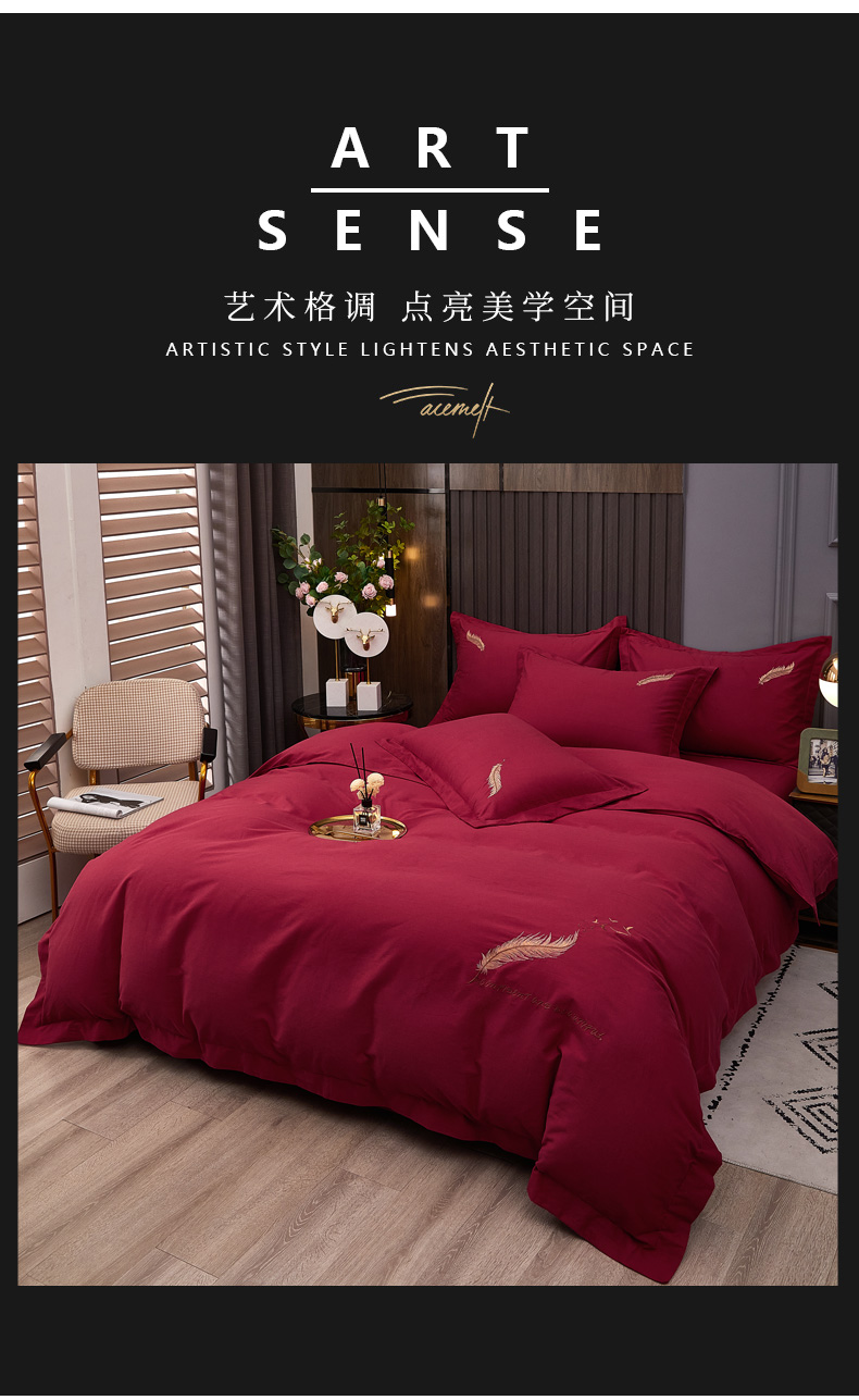 商品名称:芊寻 2024新款60支全棉磨毛绣花四件套 羽墨 古琦红