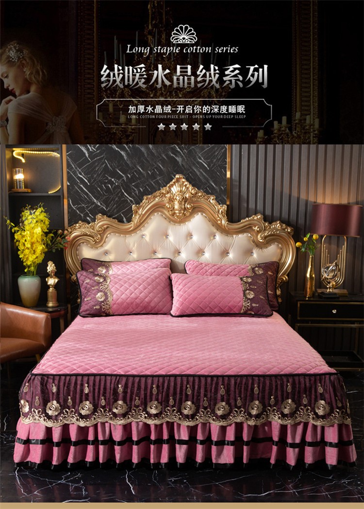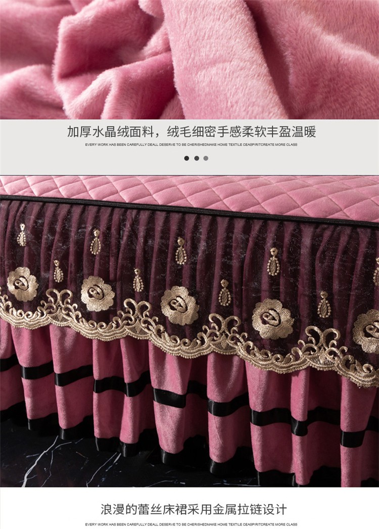 (总)能好家纺 2025新款蕾丝工艺水晶绒夹棉床裙,宝石兰,藏青,豆沙,粉玉,灰,酒红,墨绿,月光蓝