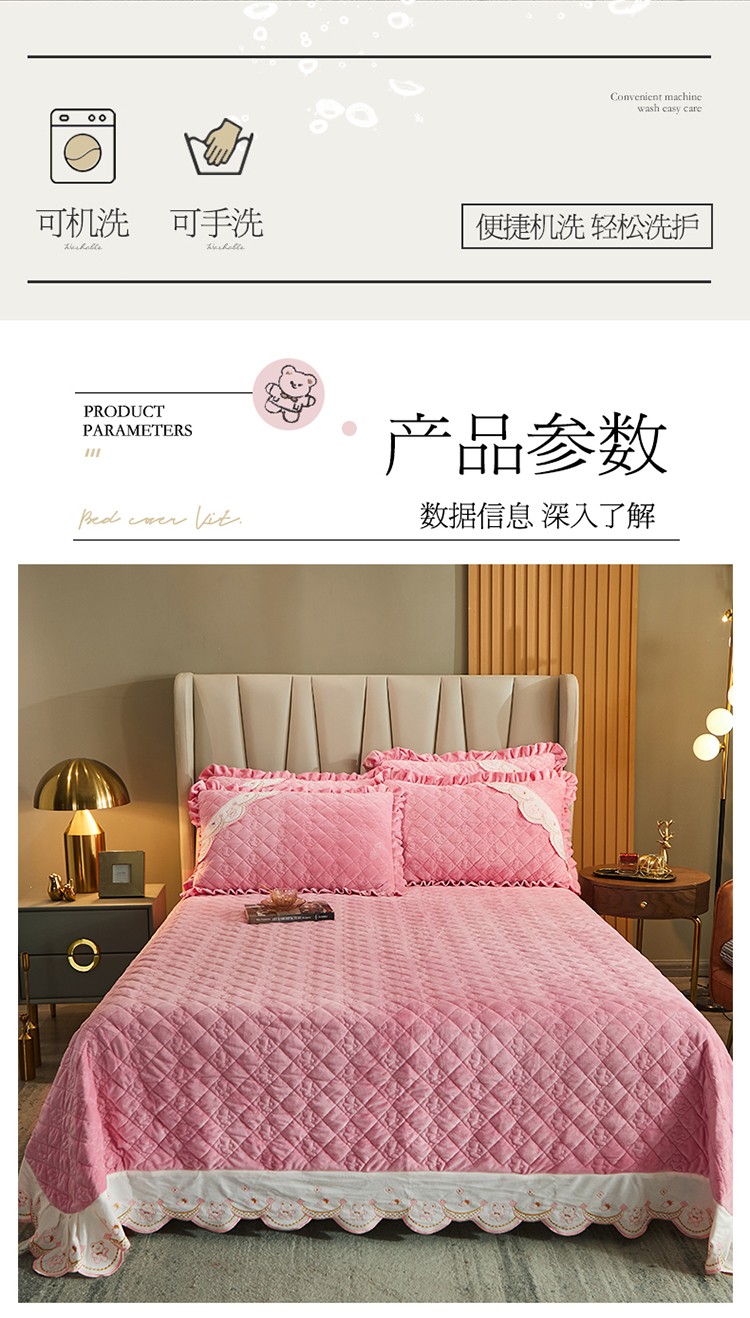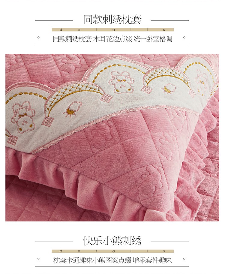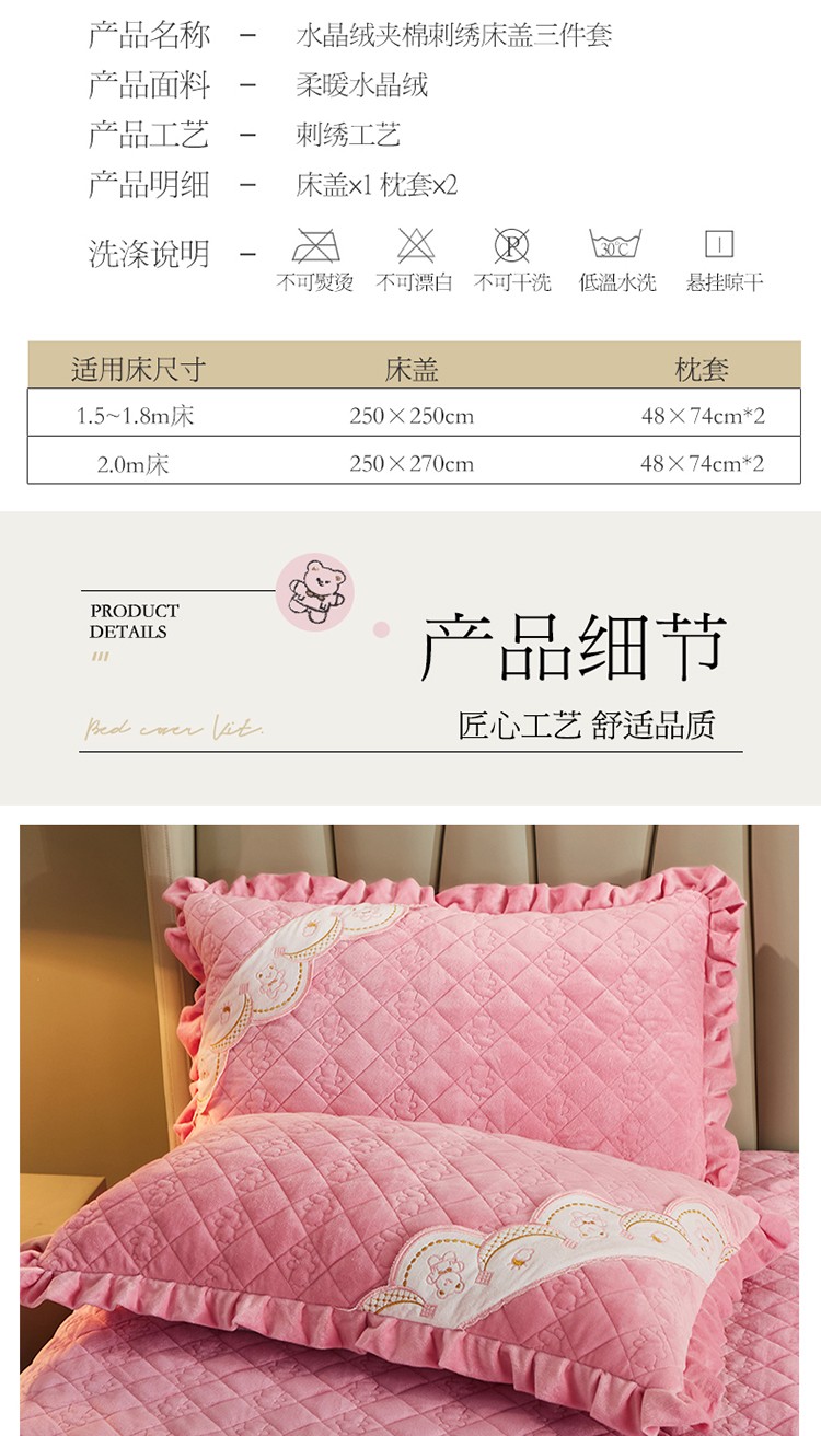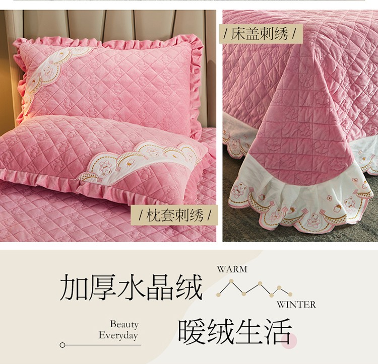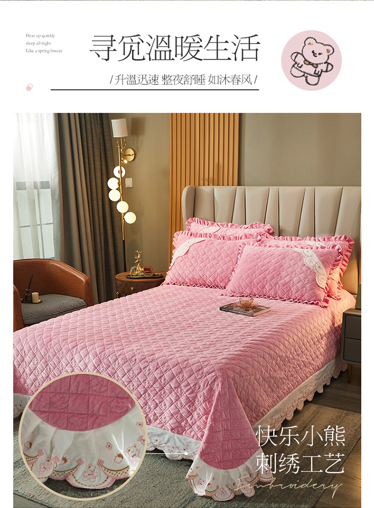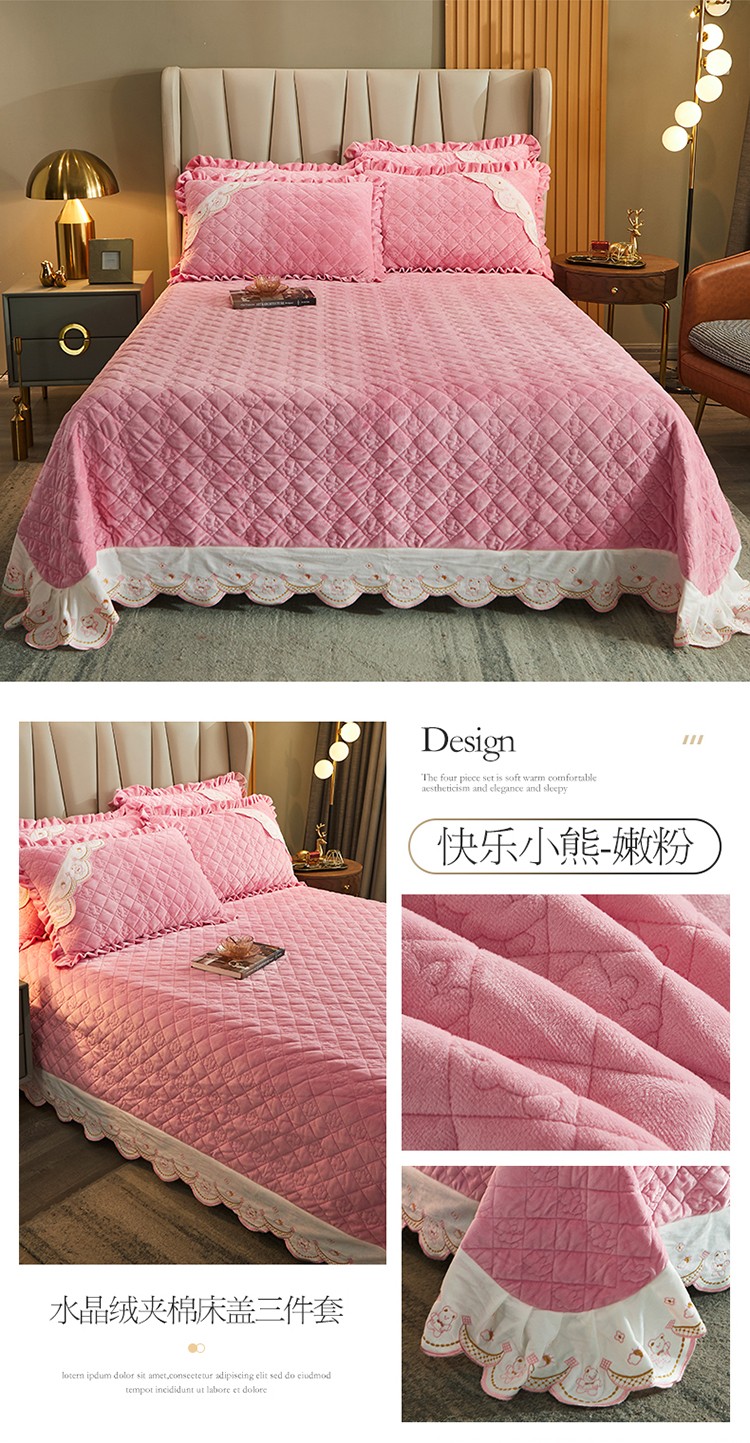 商品名称:宜凡家纺 2021新款水晶绒夹棉绗缝床盖三件套快乐小熊-嫩粉