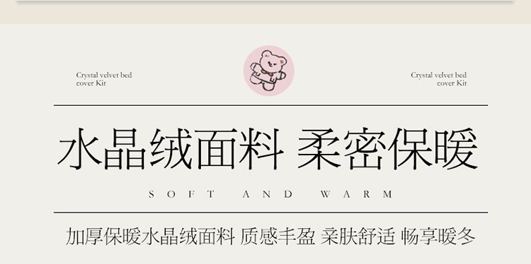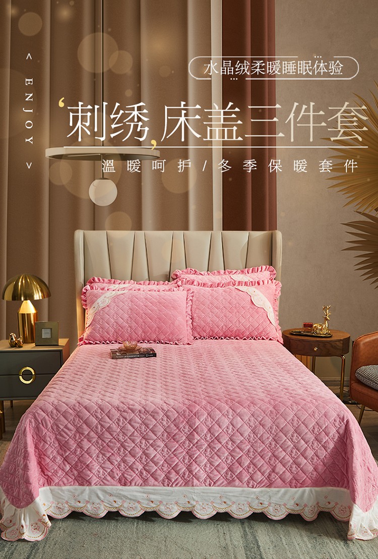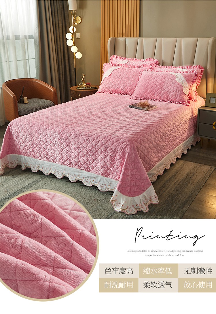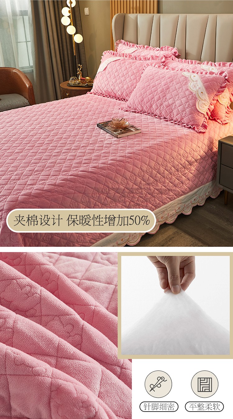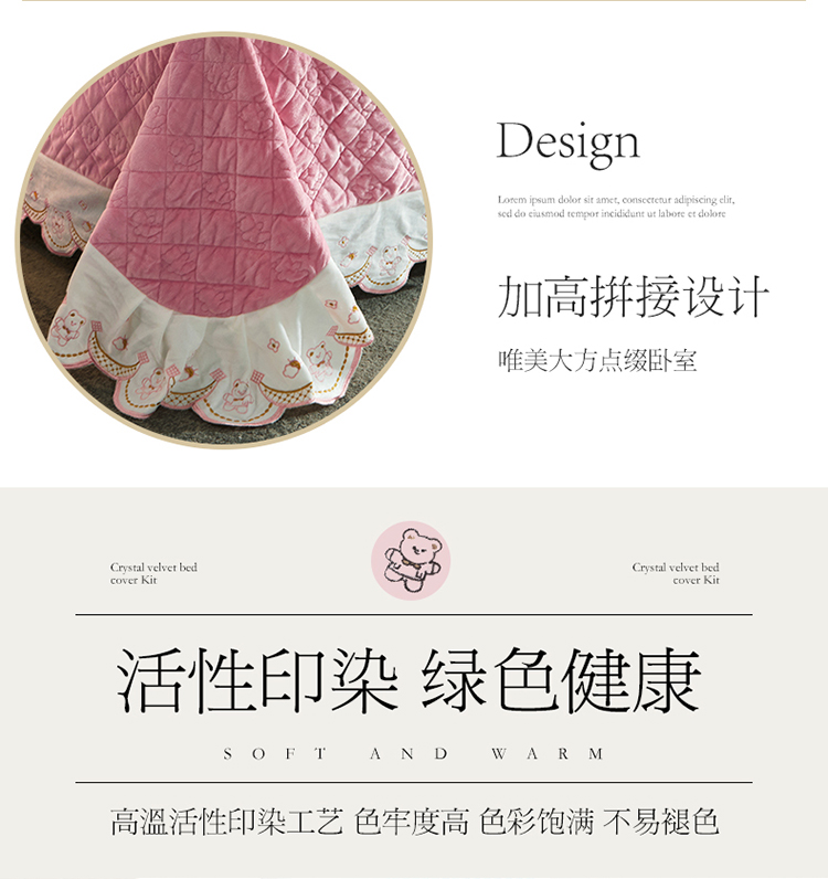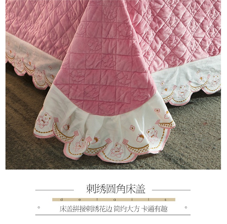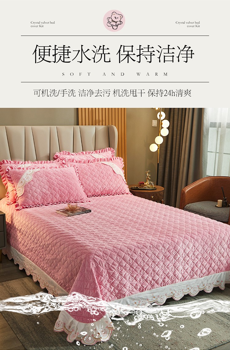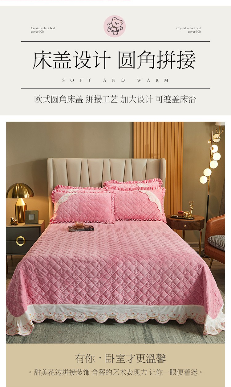 商品名称:宜凡家纺 2021新款水晶绒夹棉绗缝床盖三件套快乐小熊-嫩粉