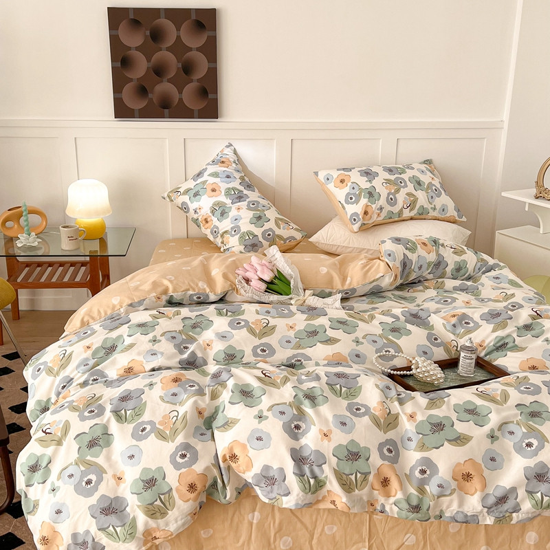昔可家纺 2022新款13372全棉普通款花花系列四件套 百合铃兰绿