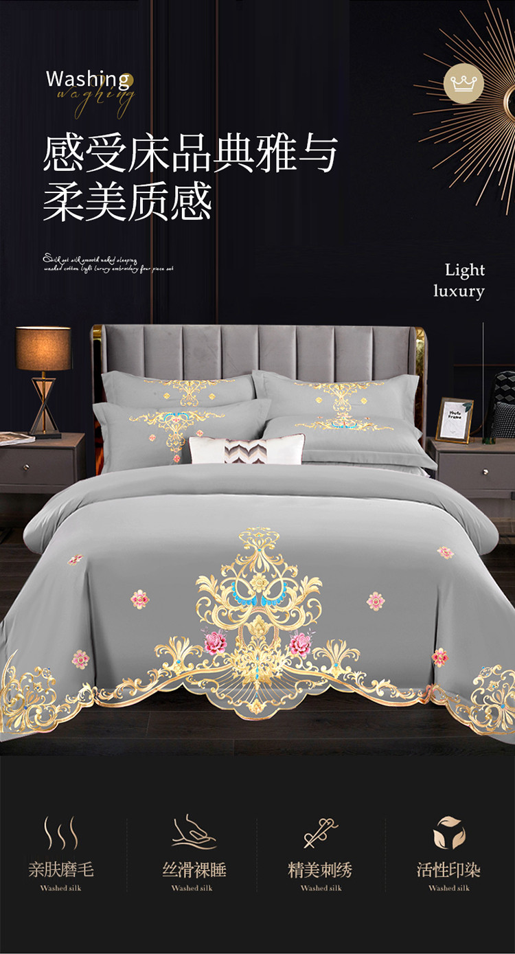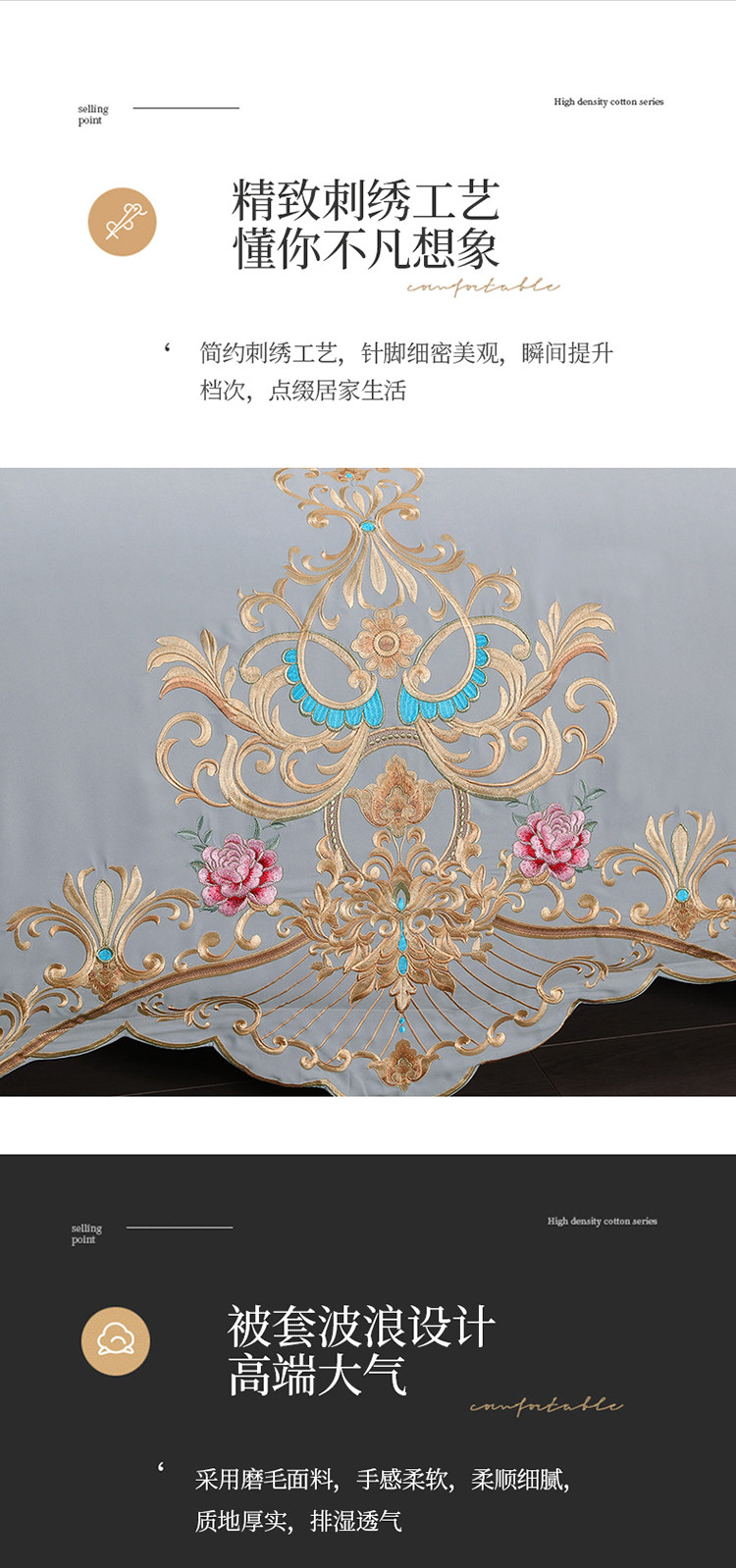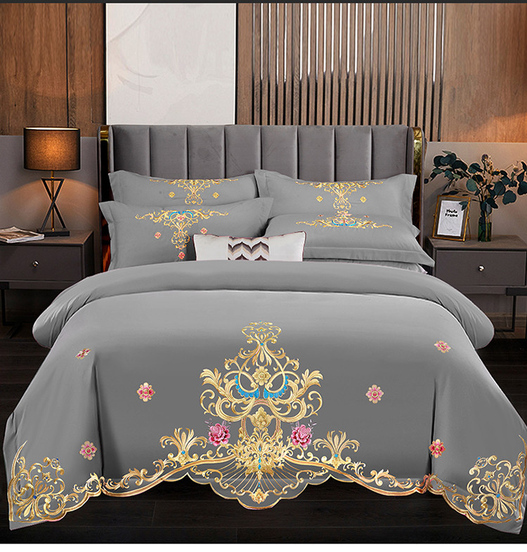 慕她家纺 婚庆四件套大红色刺绣花超柔磨毛结婚床上用品喜庆婚礼 盛世庄园-经典灰