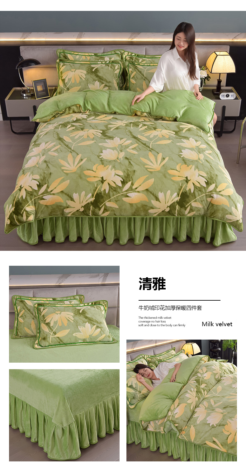 锦铭源2025直播印花7斤牛奶绒金貂水晶法莱珊瑚绒四件套床裙款花恋,花恋