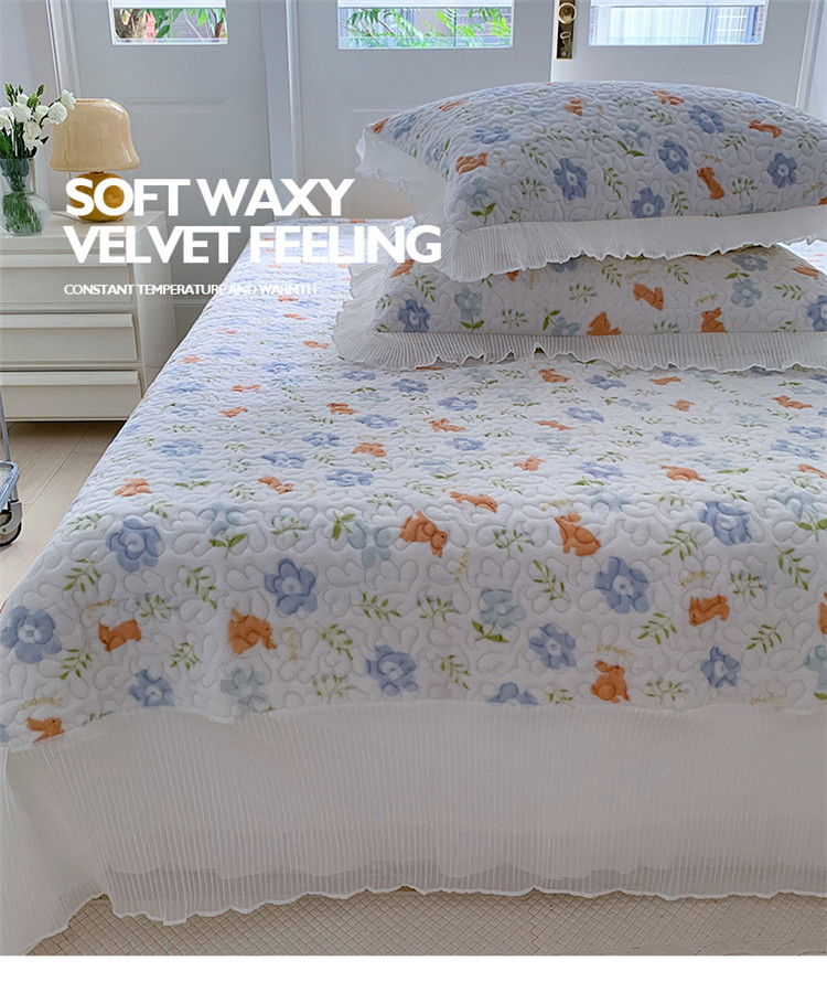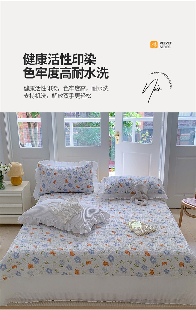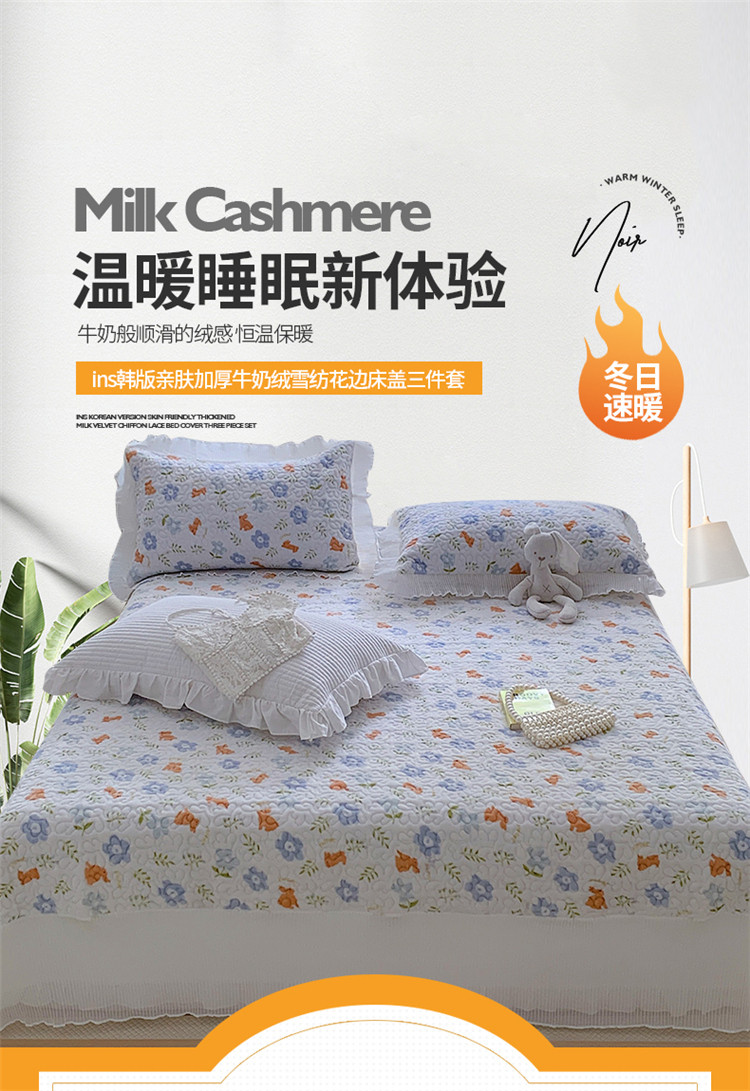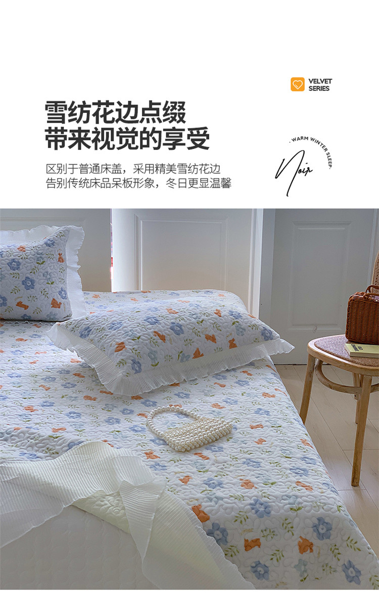 桃子ins韩版亲肤加厚牛奶绒雪纺花边床盖三件套 甜田兔