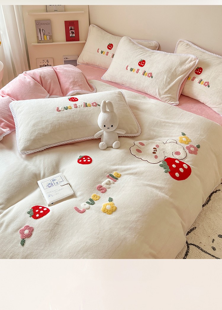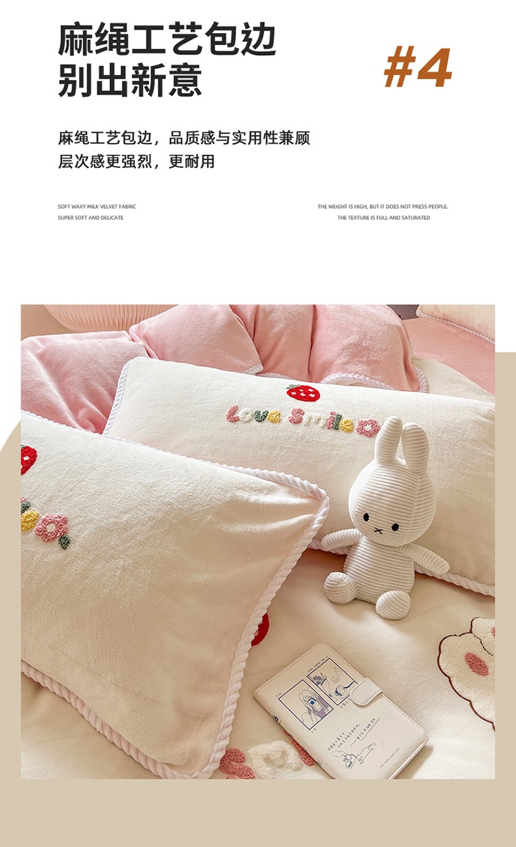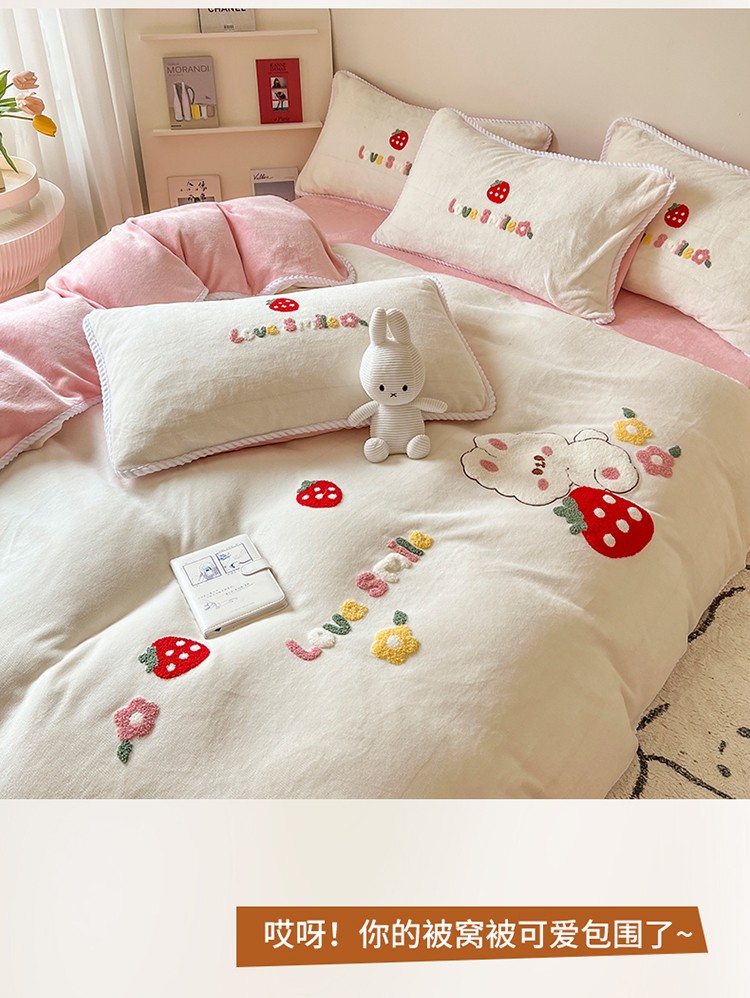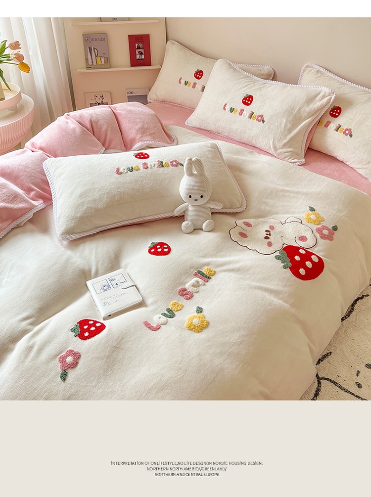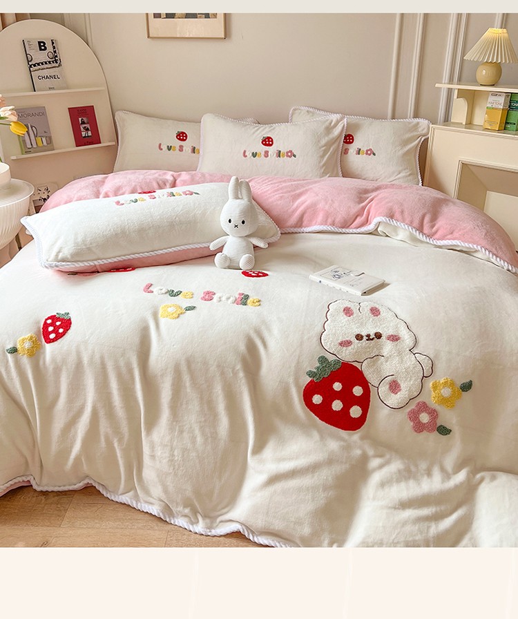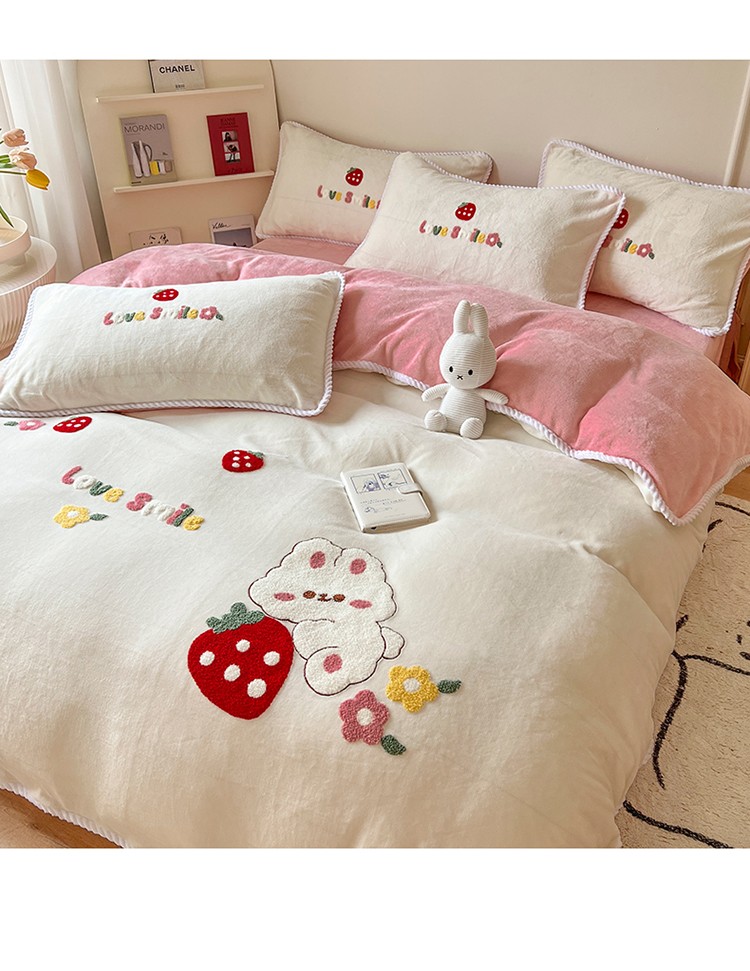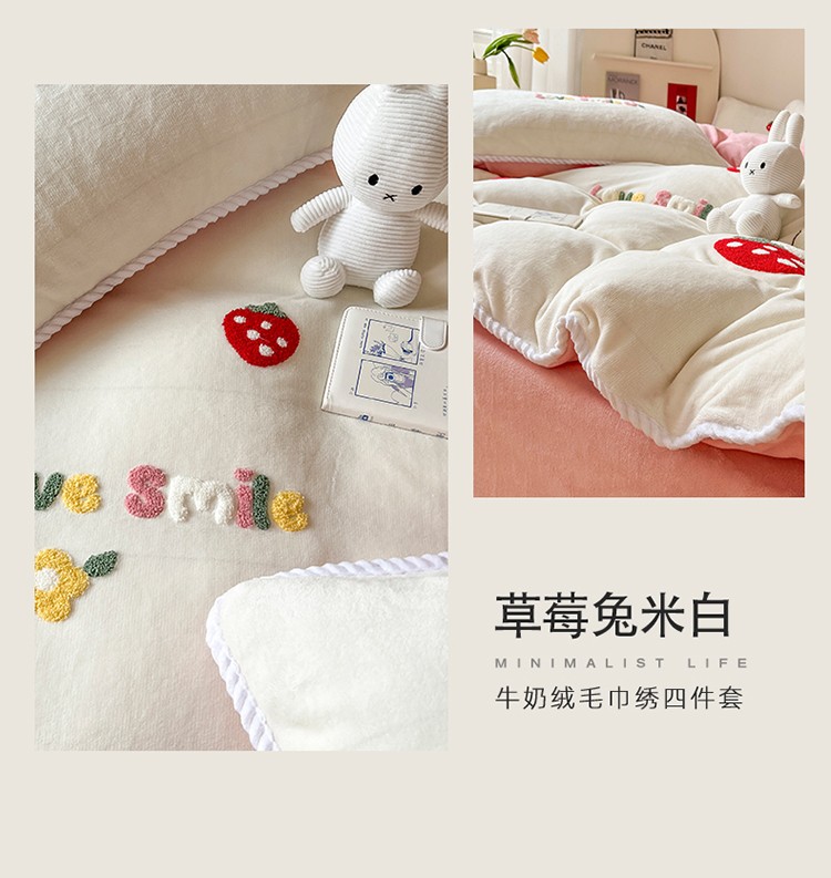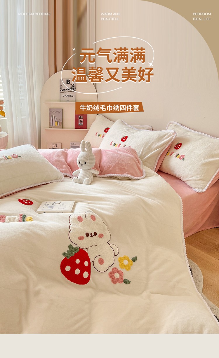 芯贝儿 新款加厚保暖雕花牛奶绒毛巾绣花宝宝法莱绒四件套 草莓兔米白