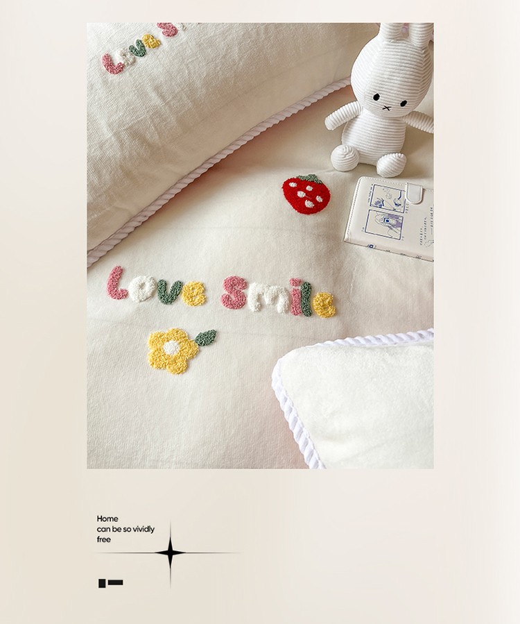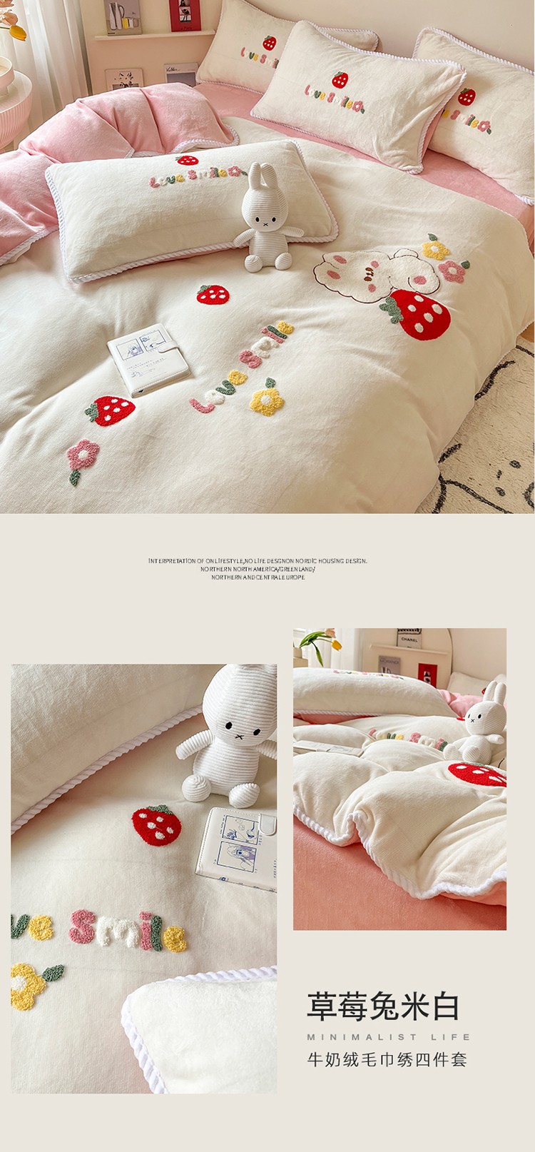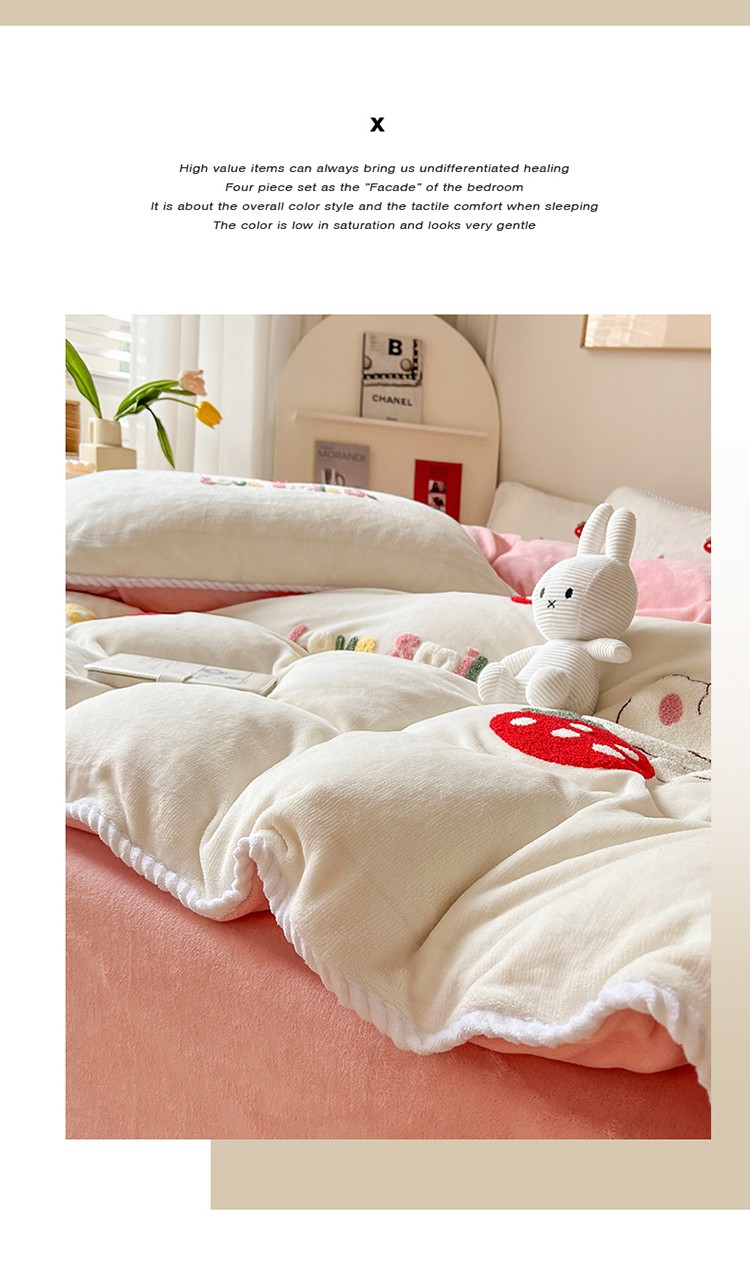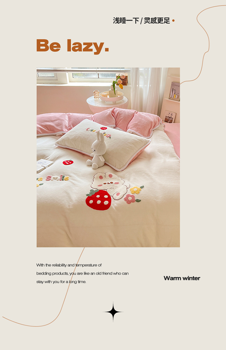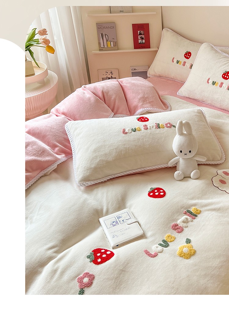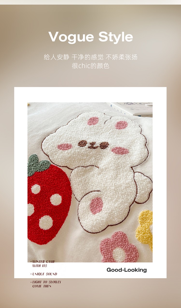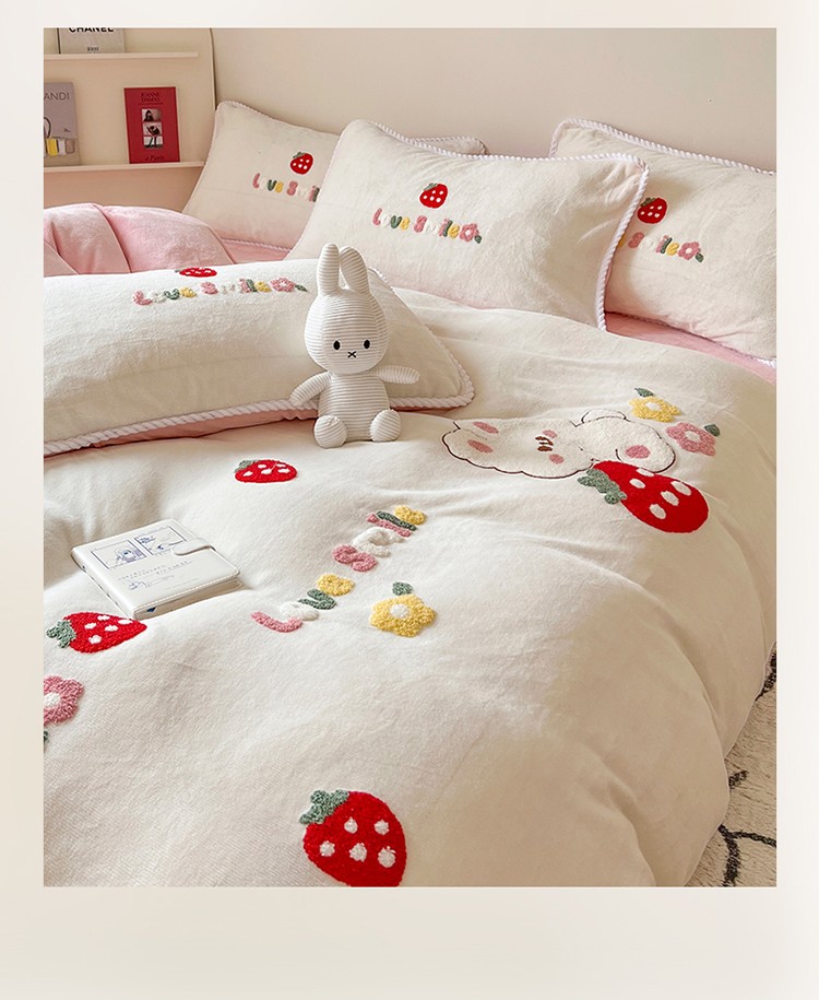 芯贝儿 新款加厚保暖雕花牛奶绒毛巾绣花宝宝法莱绒四件套 草莓兔米白