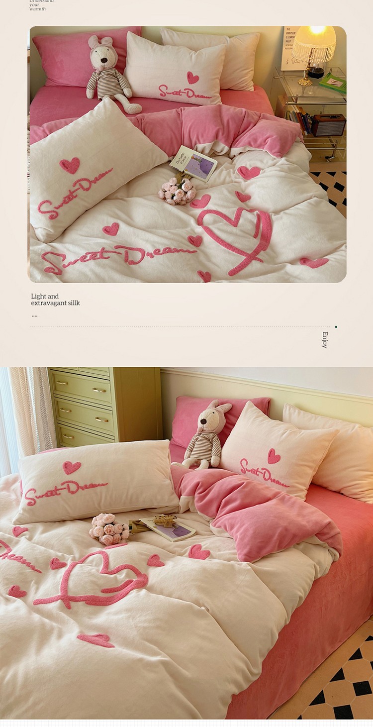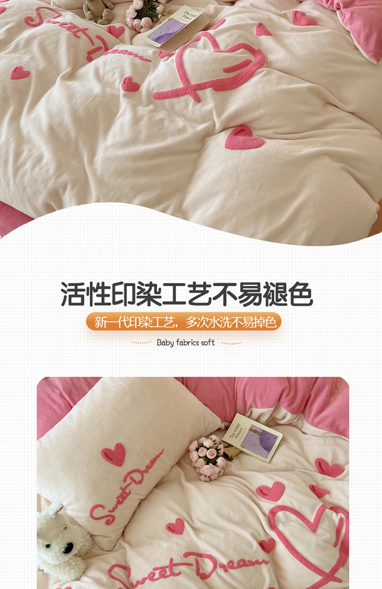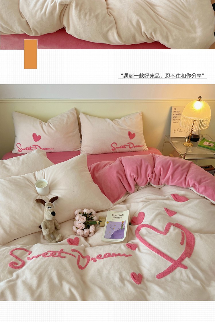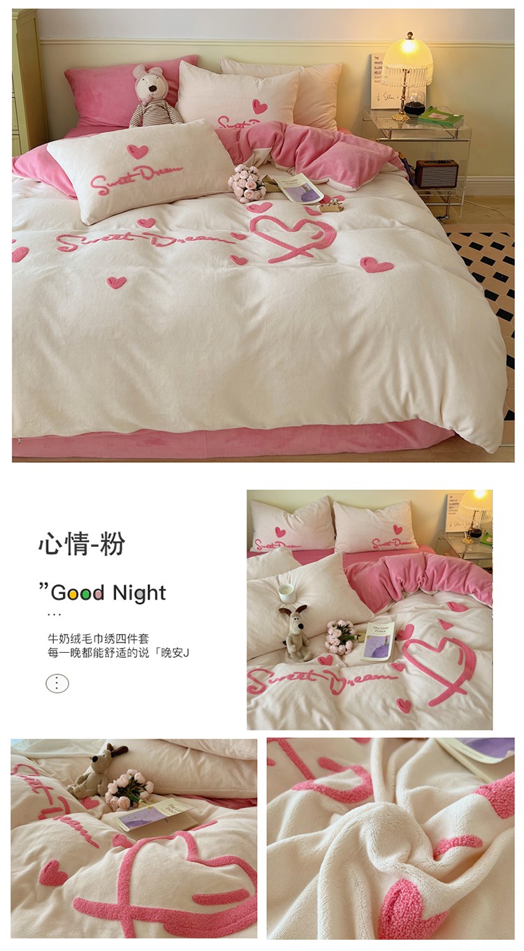 商品名称:三朵2022新款牛奶绒绣花四件套 心情-粉