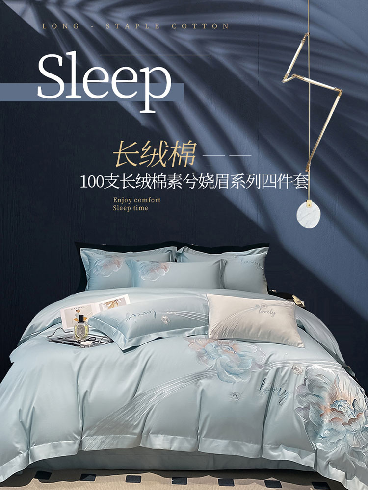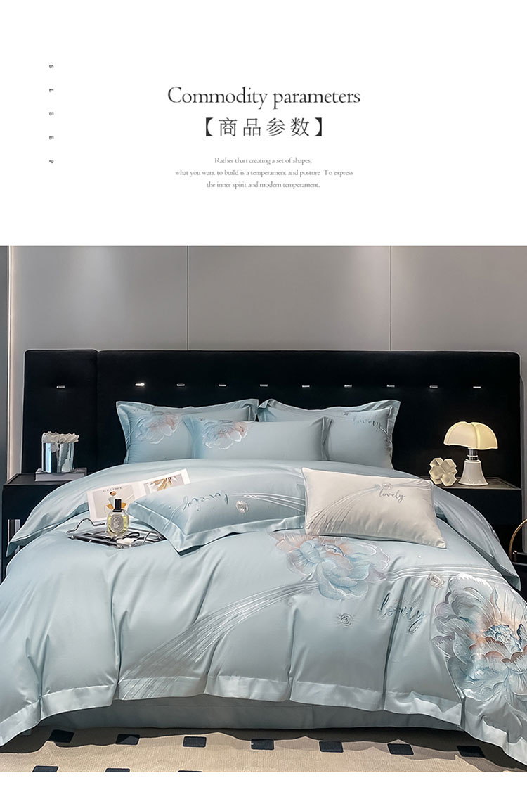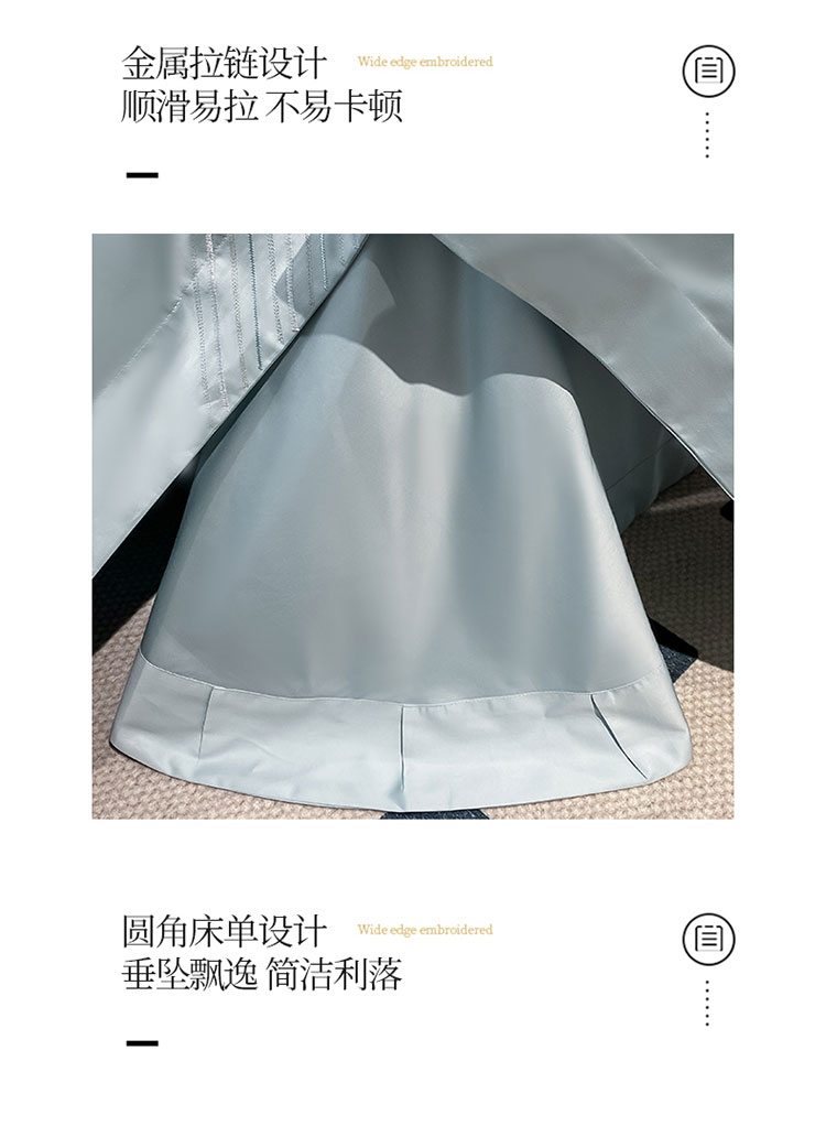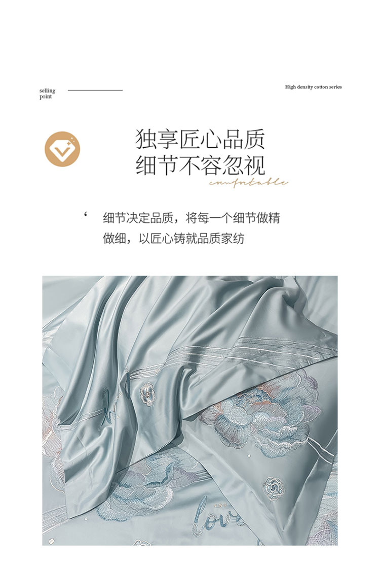 商品名称:魅都100阿克苏长绒棉刺绣四件套-素兮娆眉 素兮娆眉-天空蓝