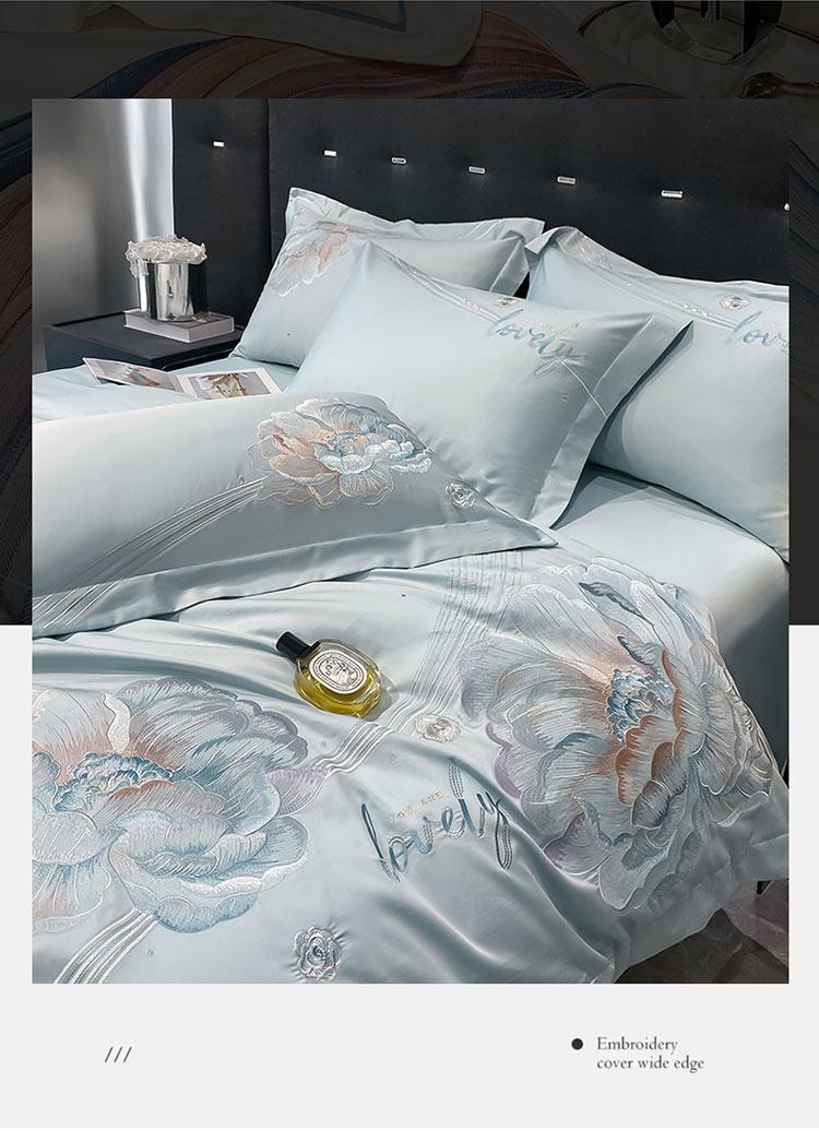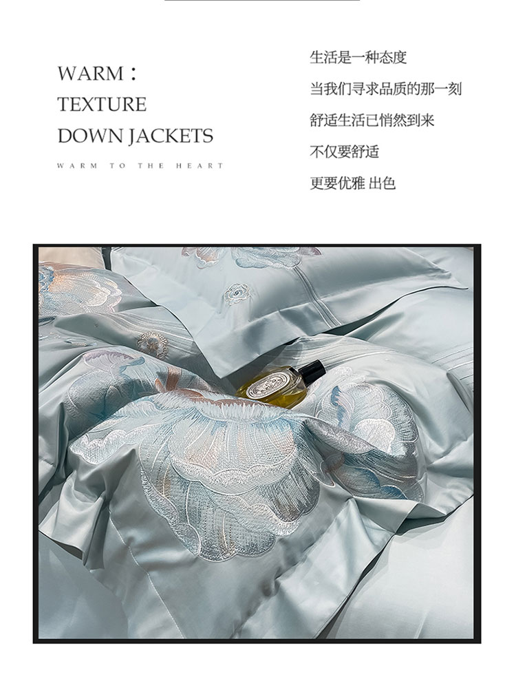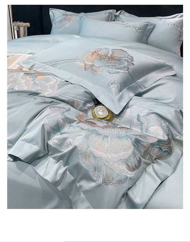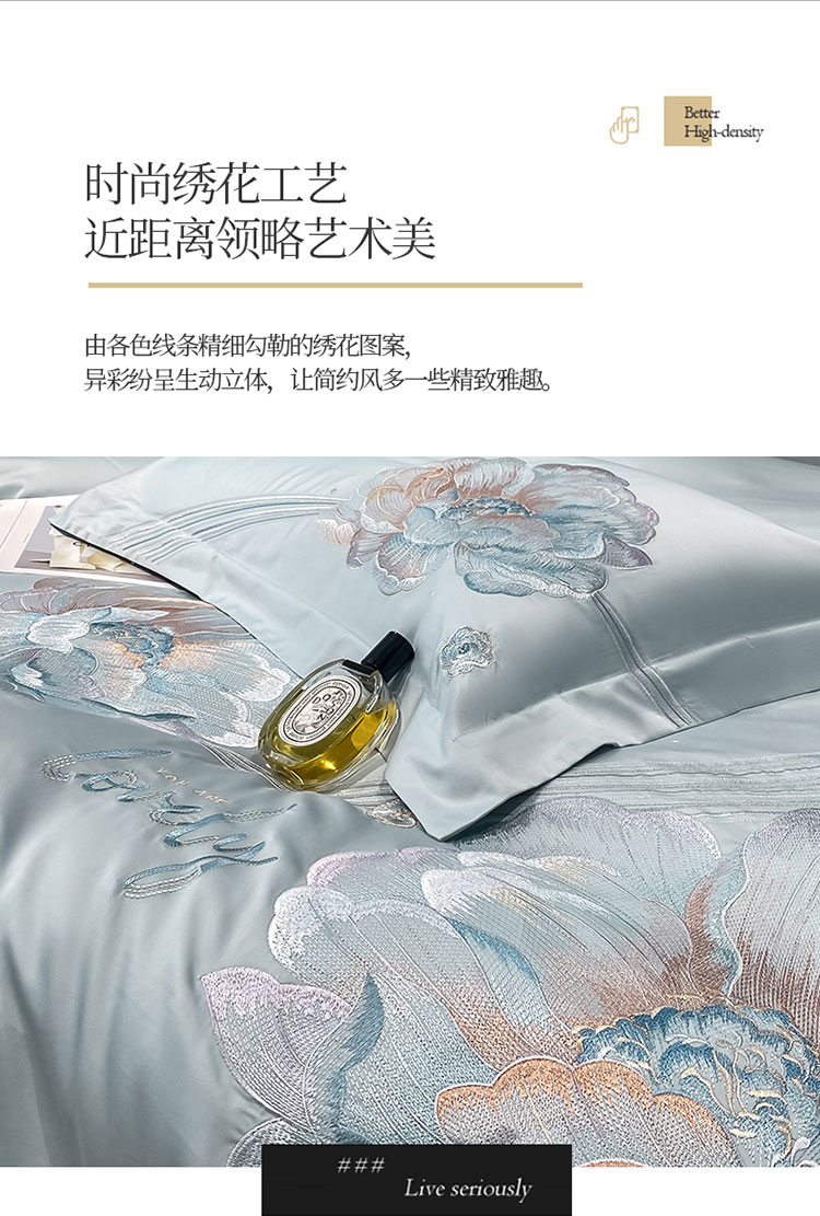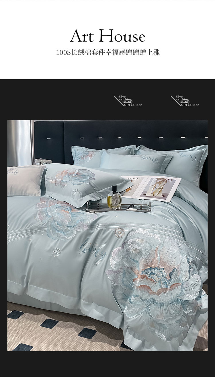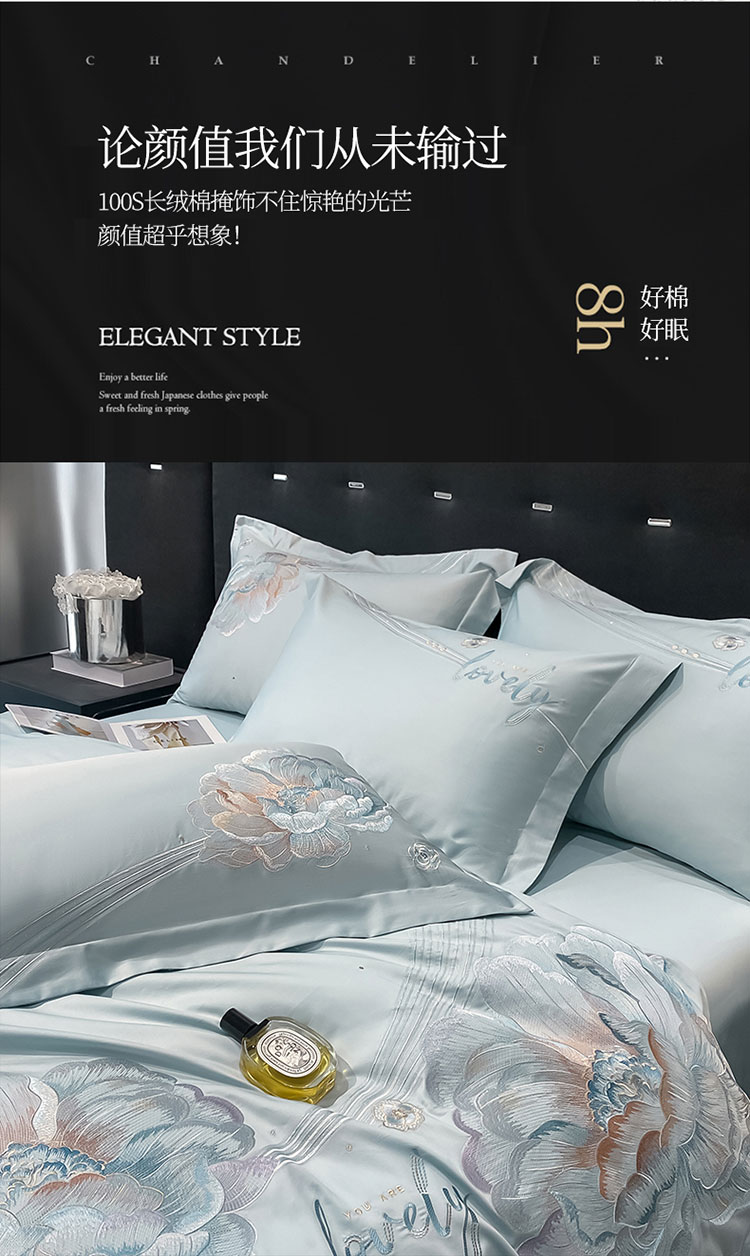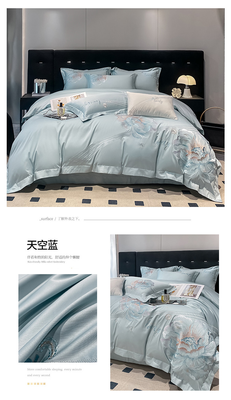 魅都100阿克苏长绒棉刺绣四件套-素兮娆眉 素兮娆眉-天空蓝