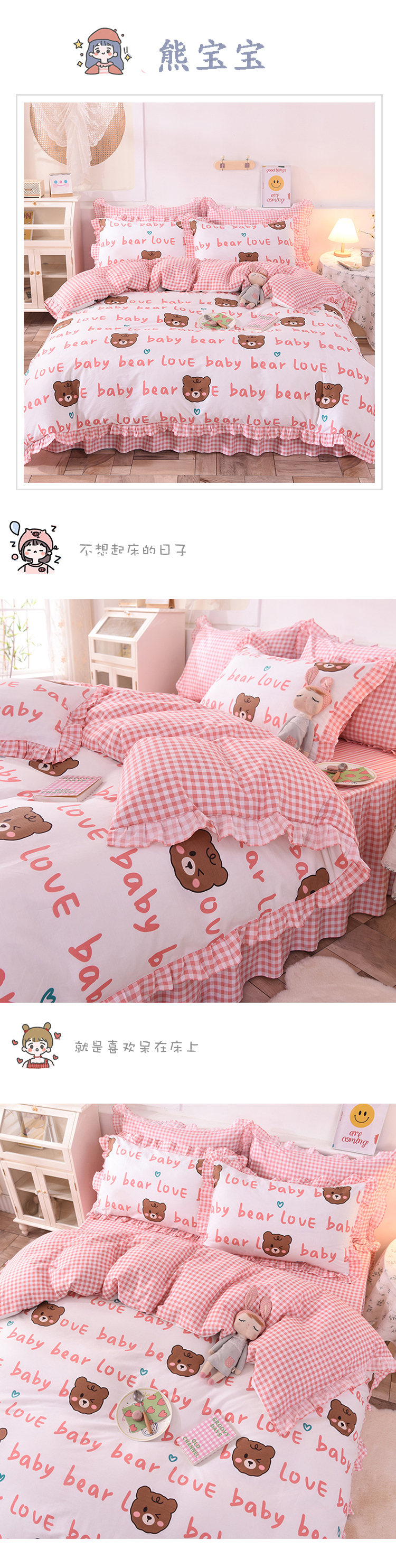 当前位置: 91家纺网 > 商品网购 > 床品套件 > 四件套 > 全棉普通四件套 > 玉元坊 少女心全棉公主风花边被套床单式床裙款四件套三件套 熊宝宝