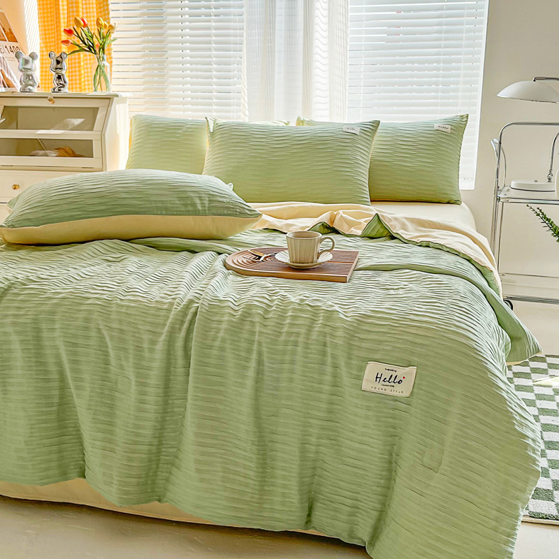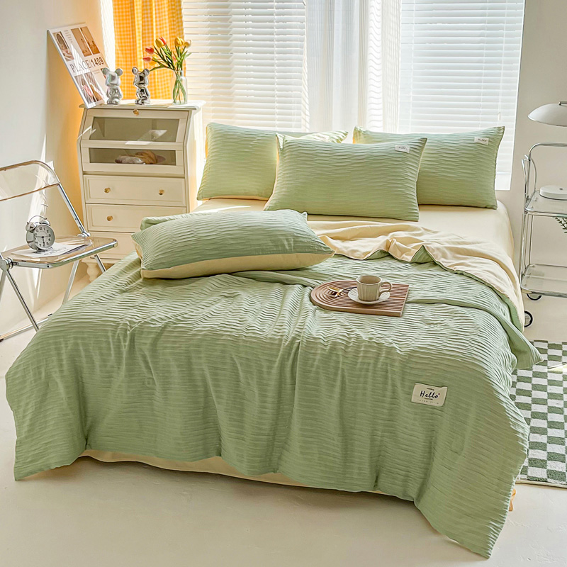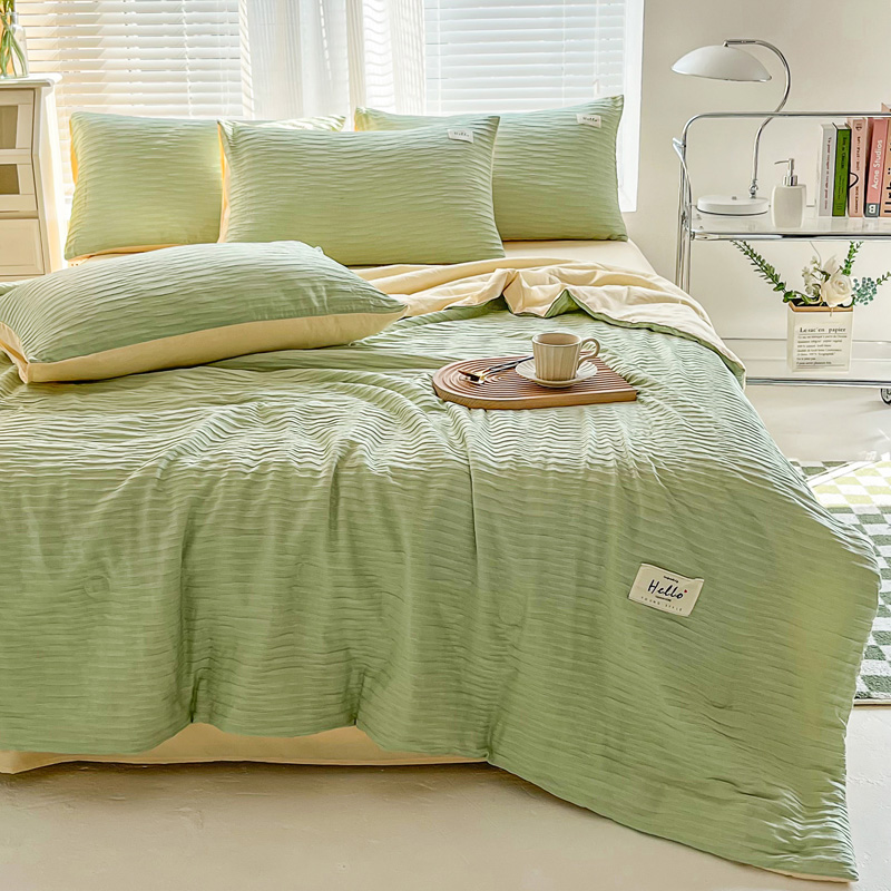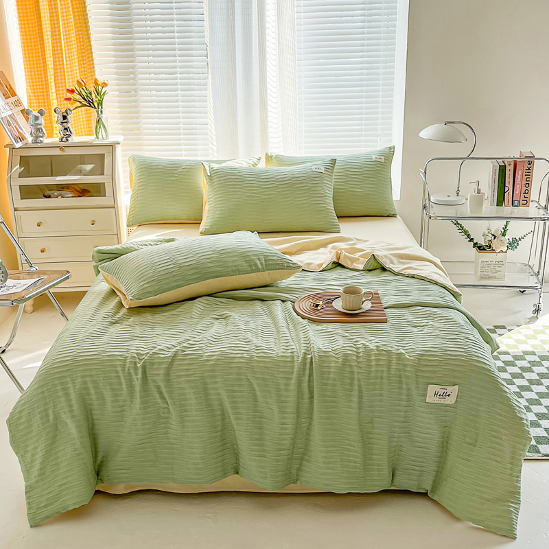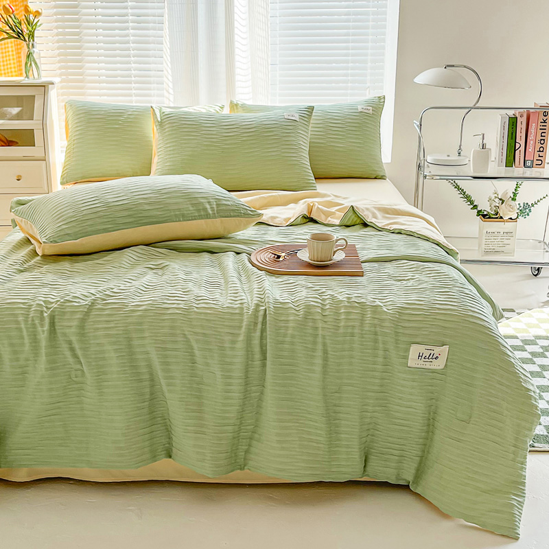 商品名称:斯卡诺 2025针织泡泡纱夏被四件套简约纯色夏被空调被水洗棉夏被四件套 绿加黄