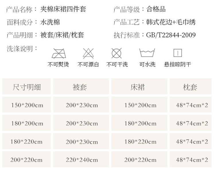 床裙180*200cm 被套200*230cm 枕套一对 | ¥150.00 |