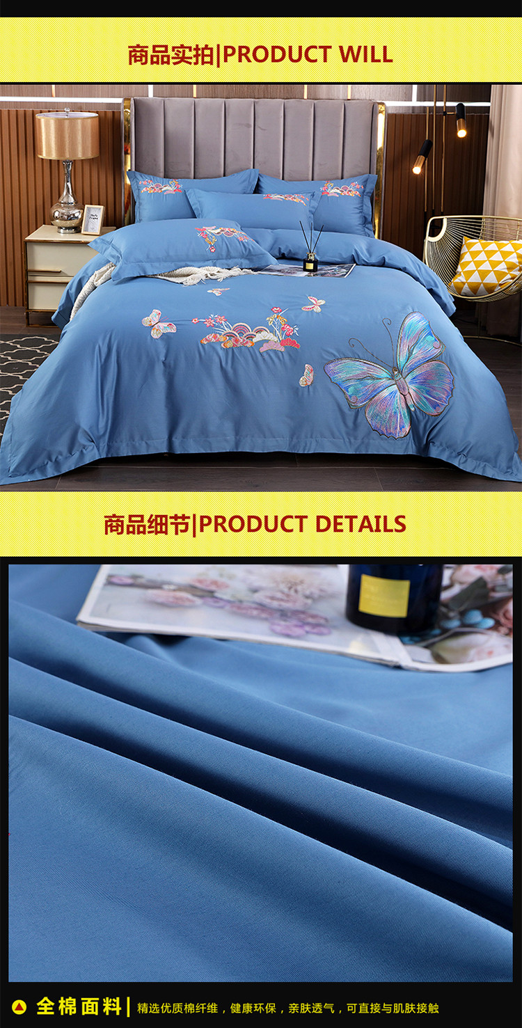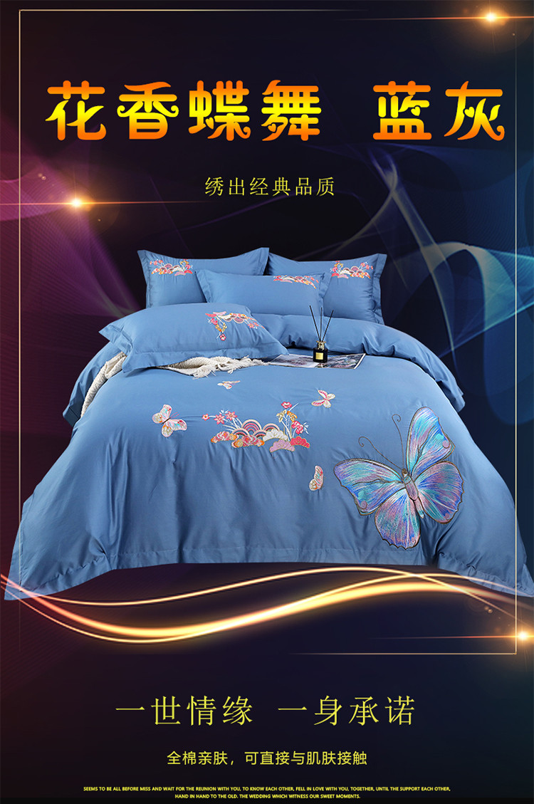 商品名称:慕她婚庆四件套大红色结婚全棉纯棉刺绣花多件套直播 花香蝶舞蓝灰
