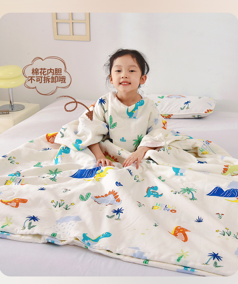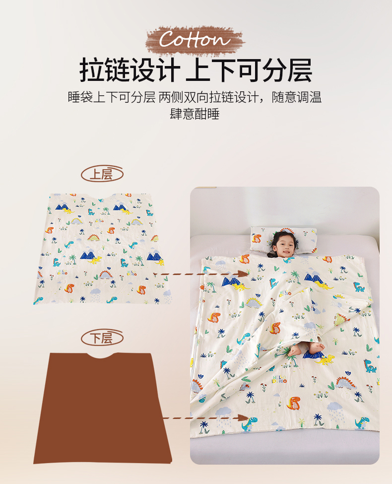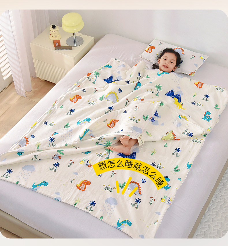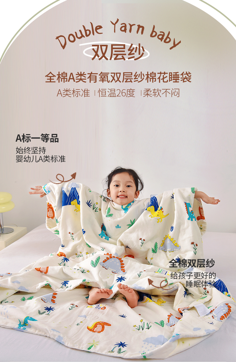 A类夏季纯棉睡袋双层纱棉花薄款春秋宝宝中大童儿童防踢被神器 恐龙世纪