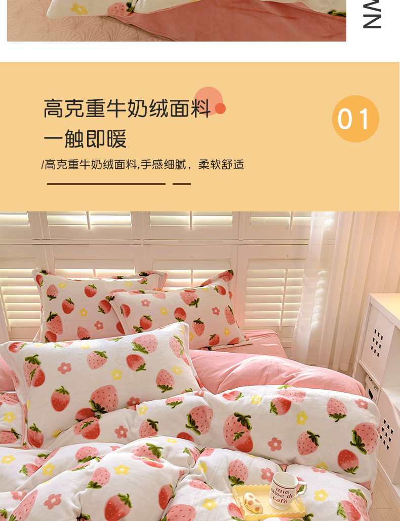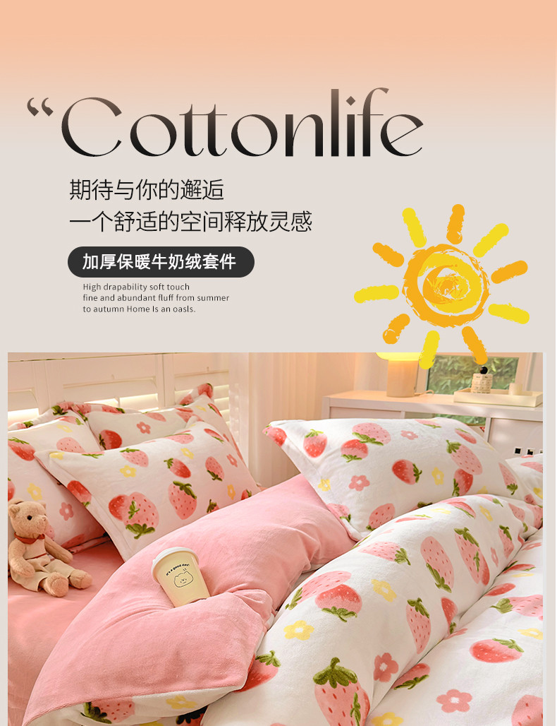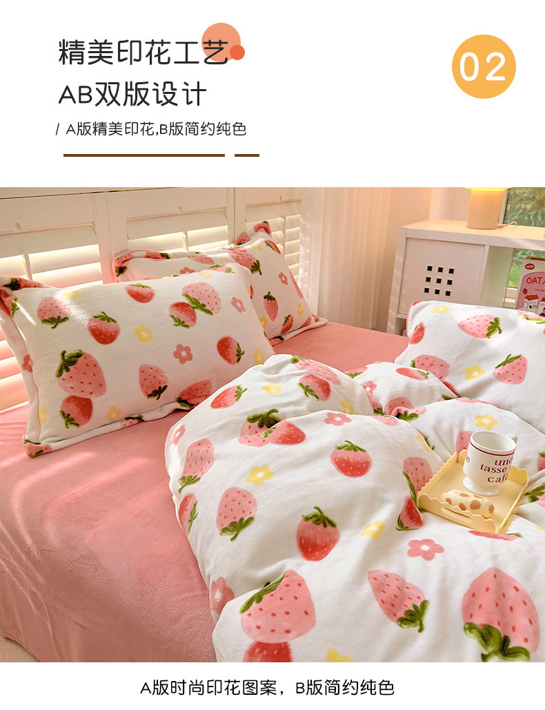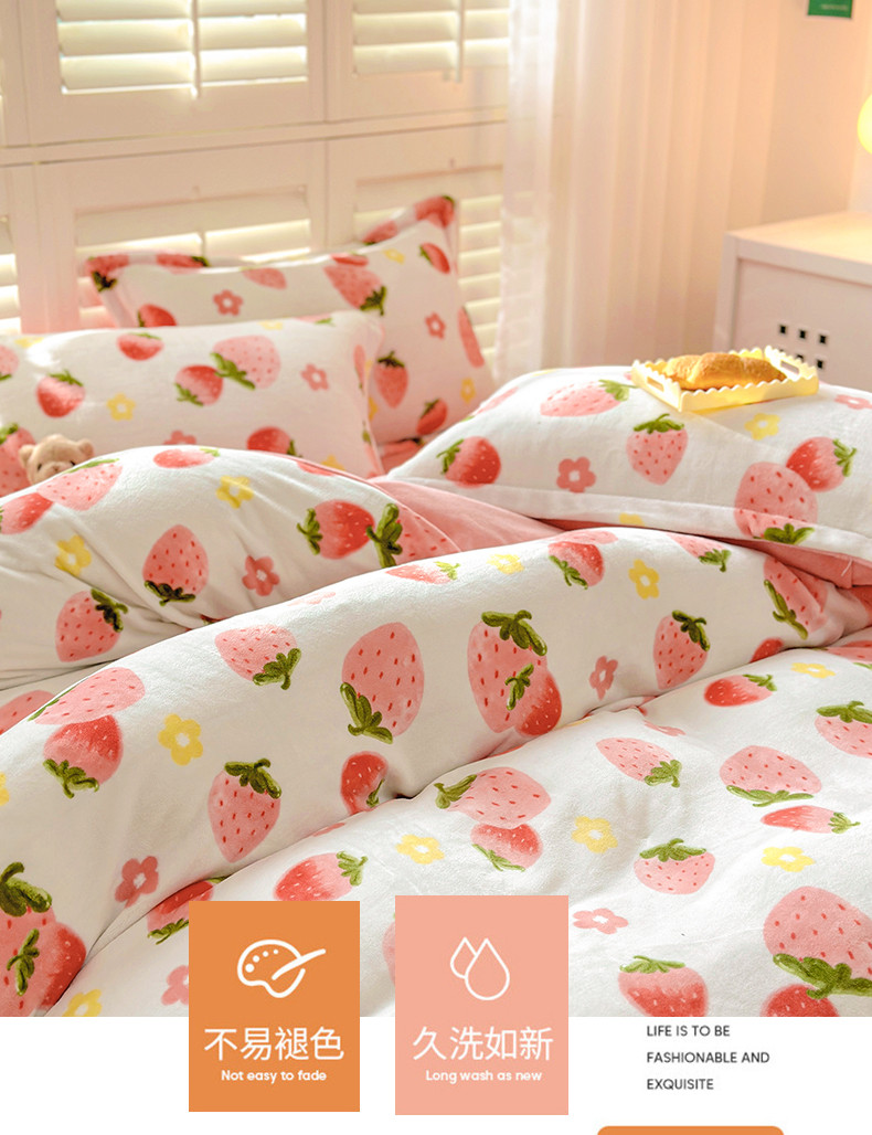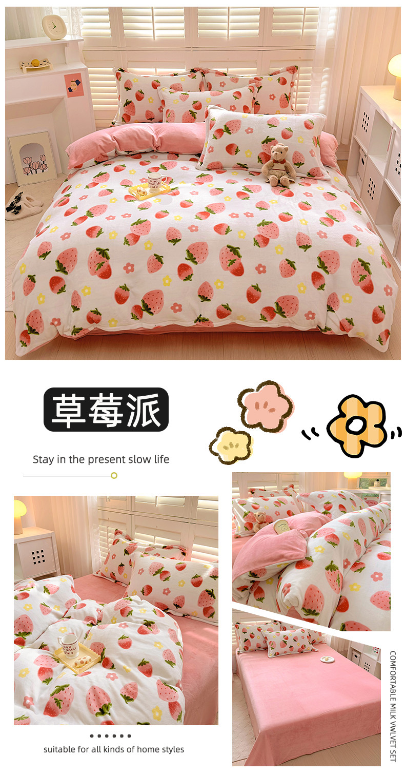 当前位置: 91家纺网 > 商品网购 > 床品套件 > 四件套 > 牛奶绒四件套 > 百寐 2023新款加厚牛奶绒小清新可爱花卉卡通保暖学生三四件套 草莓派