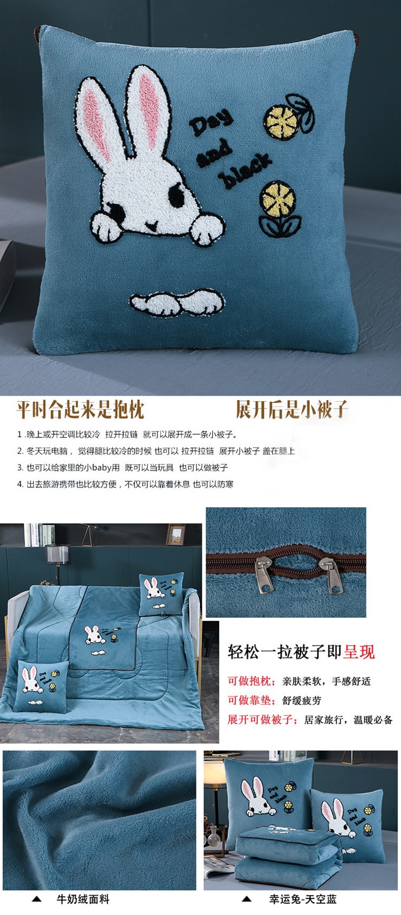 商品名称:伊可爱抱枕被 2023新款牛奶绒绣花抱枕被 幸运兔-天空蓝