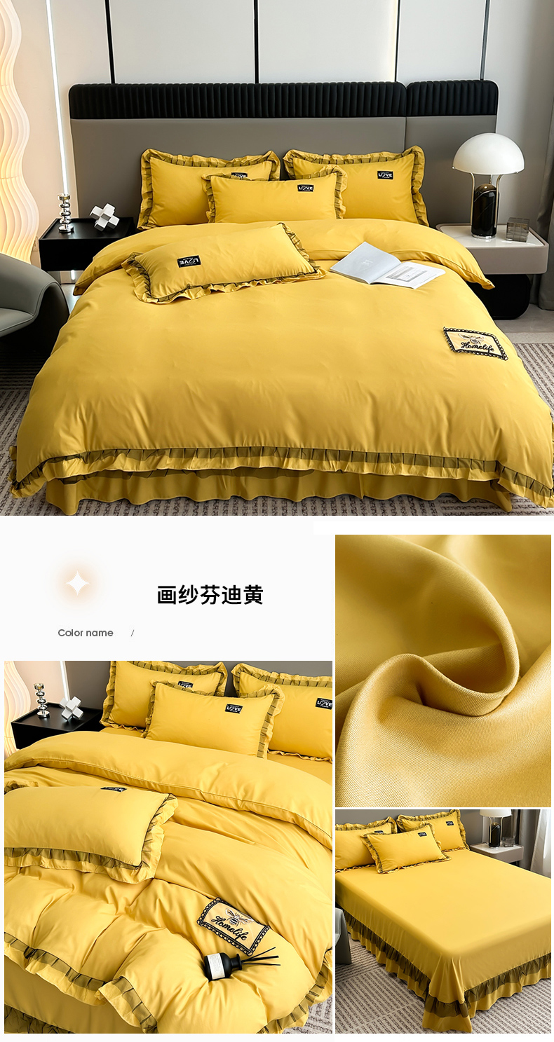 商品名称:小主驾到 2023新款韩版公主风荷叶边少女心四件套黑色蕾丝纱-画纱 画纱芬迪黄