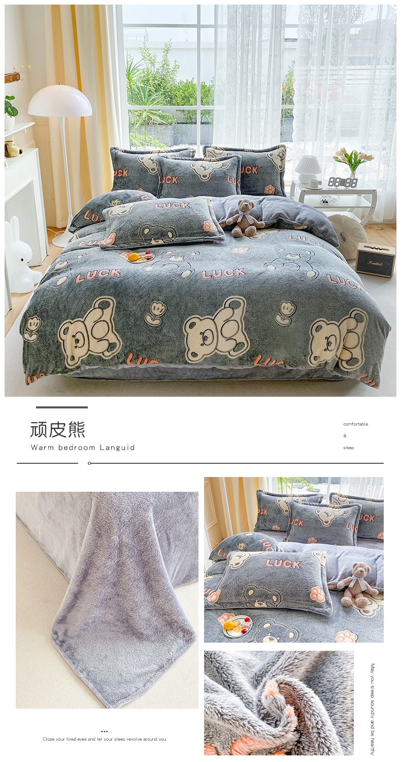 当前位置: 91家纺网 > 商品网购 > 床品套件 > 四件套 > 牛奶绒四件套 > 宜家坊 2023新款高克重立体雪花绒四件套 系列二 顽皮熊