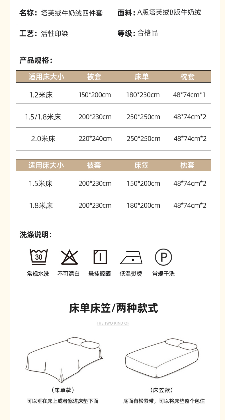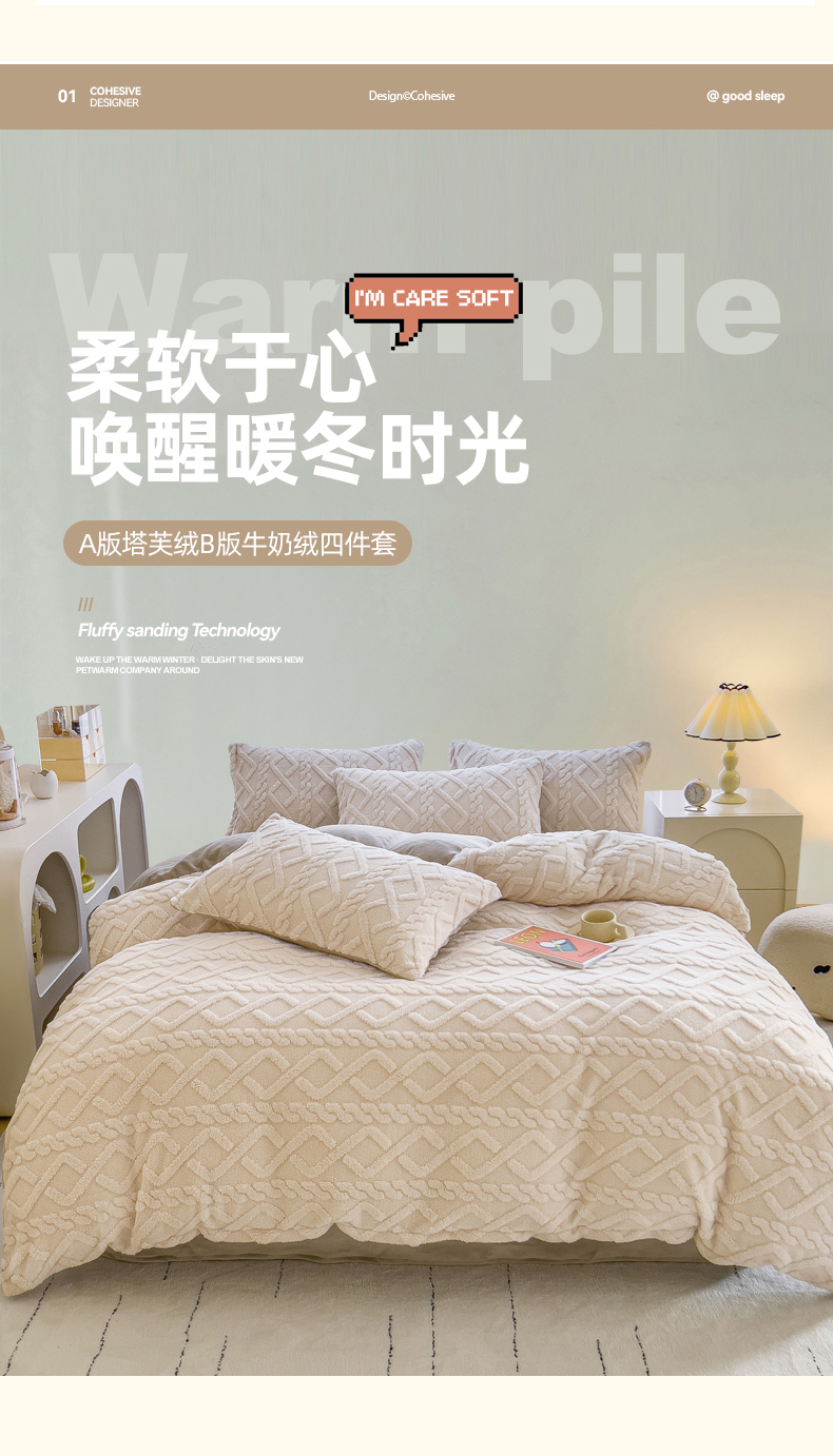 商品名称:丝印良品 2023秋冬新款加厚塔芙绒简约款牛奶绒四件套 奶白灰