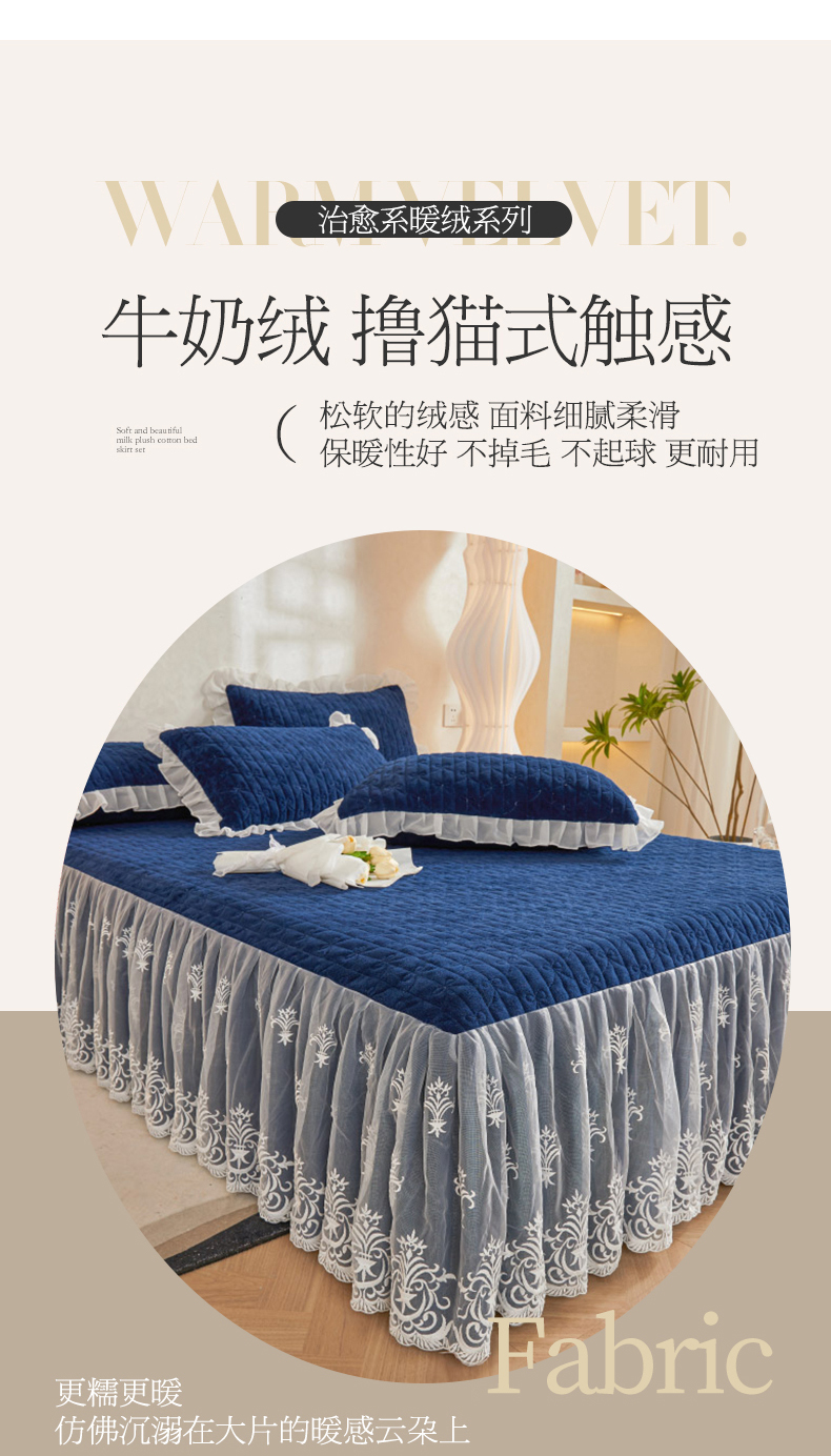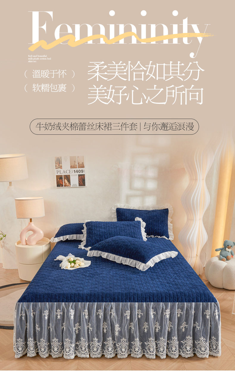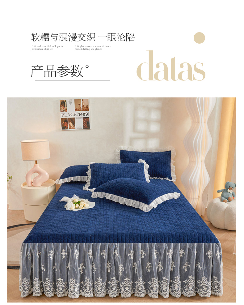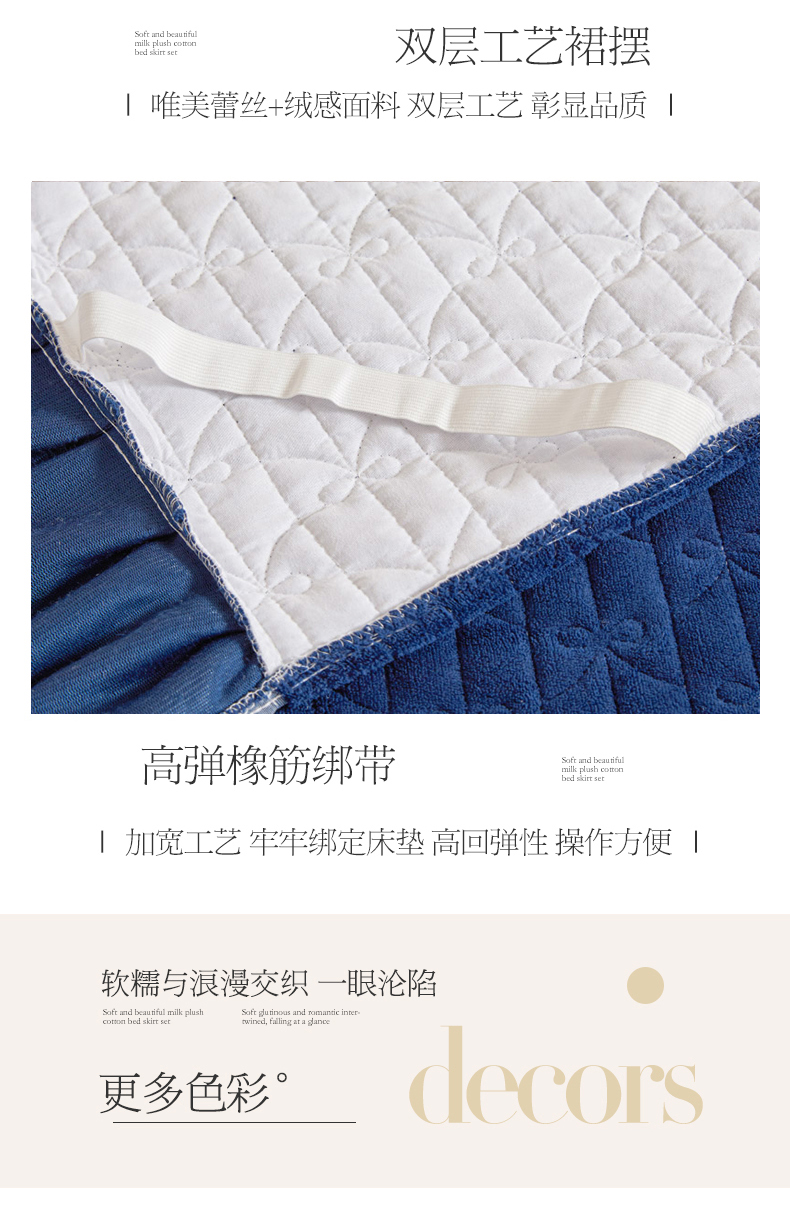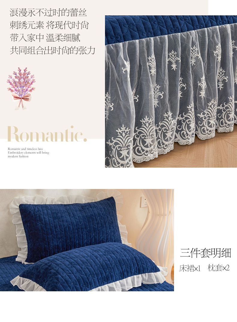 商品名称:虹星家纺 2023新款牛奶绒夹棉床裙套件清新系列-床裙款单床裙 清新-藏青