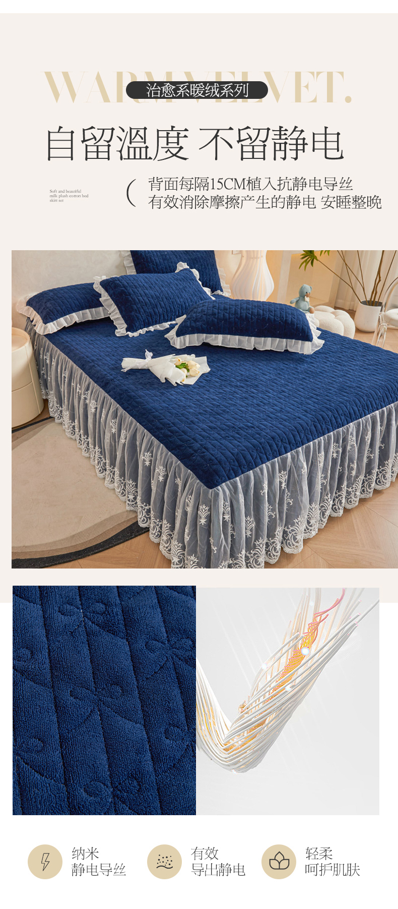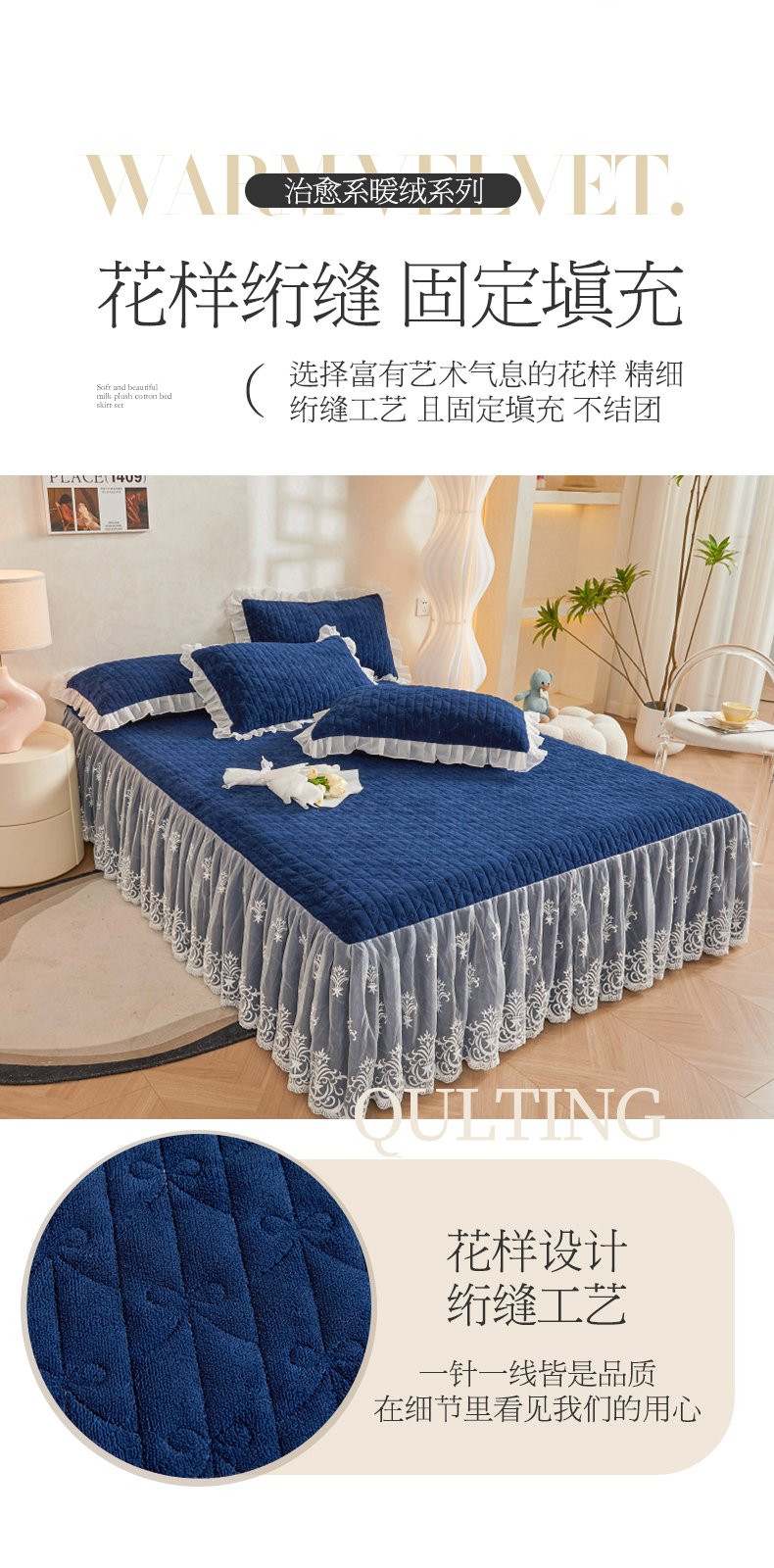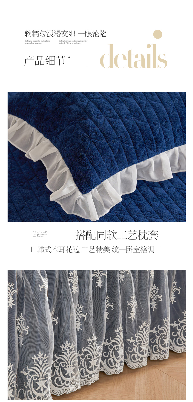 商品名称:虹星家纺 2023新款牛奶绒夹棉床裙套件清新系列-床裙款单床裙 清新-藏青