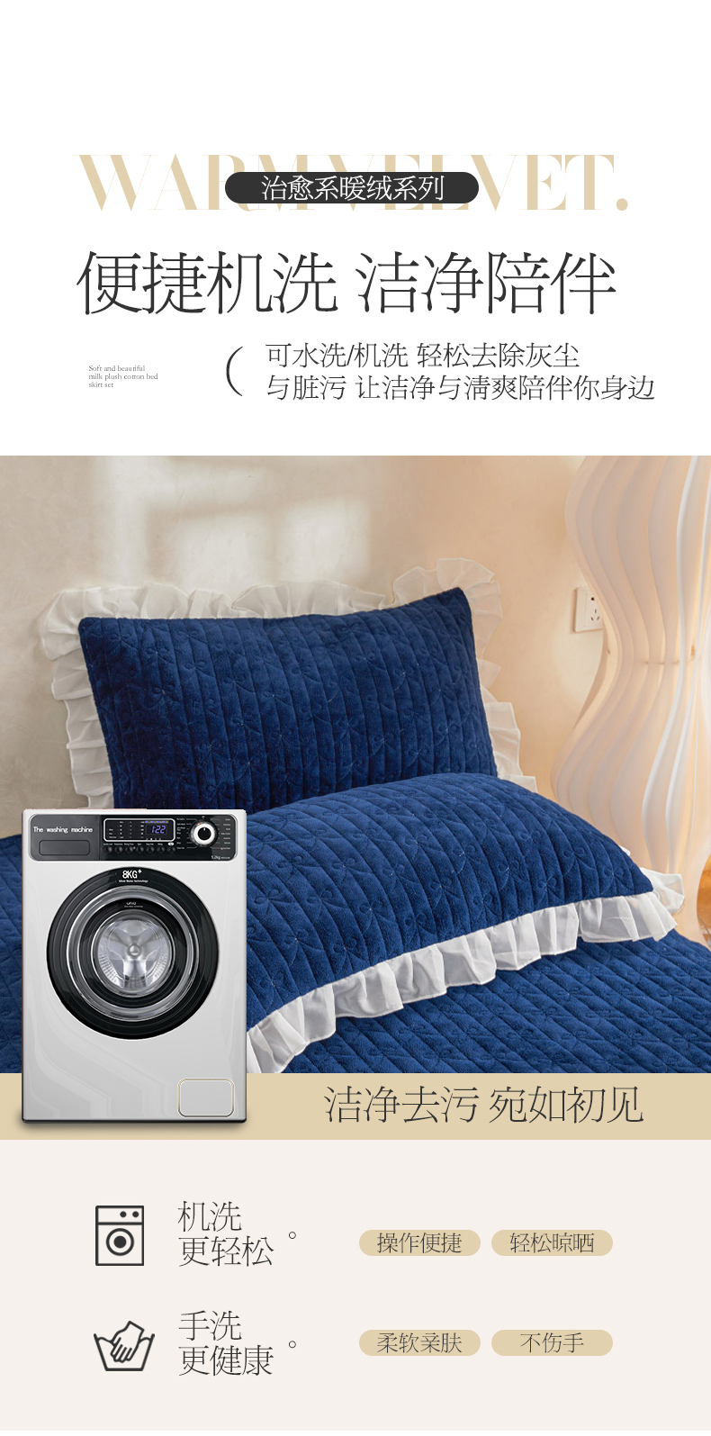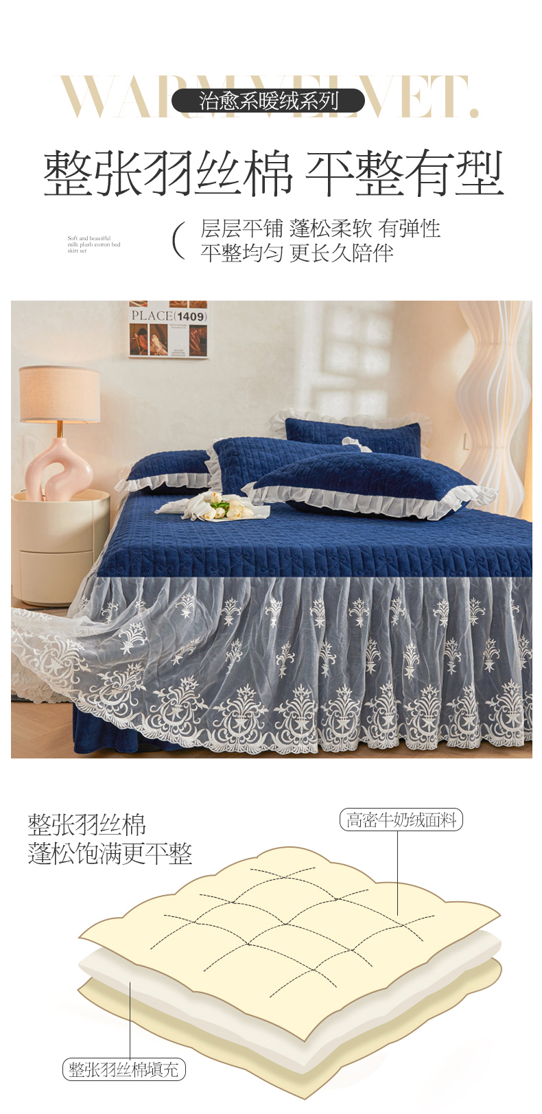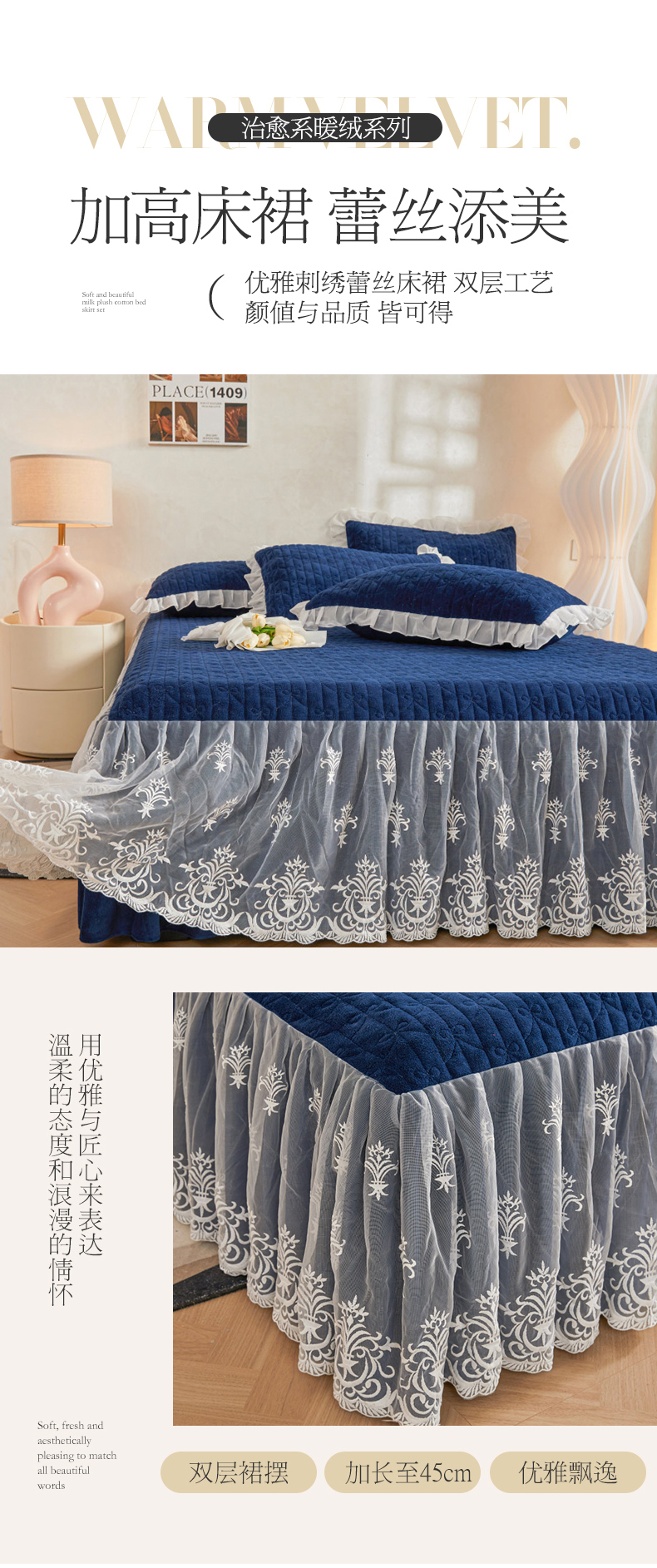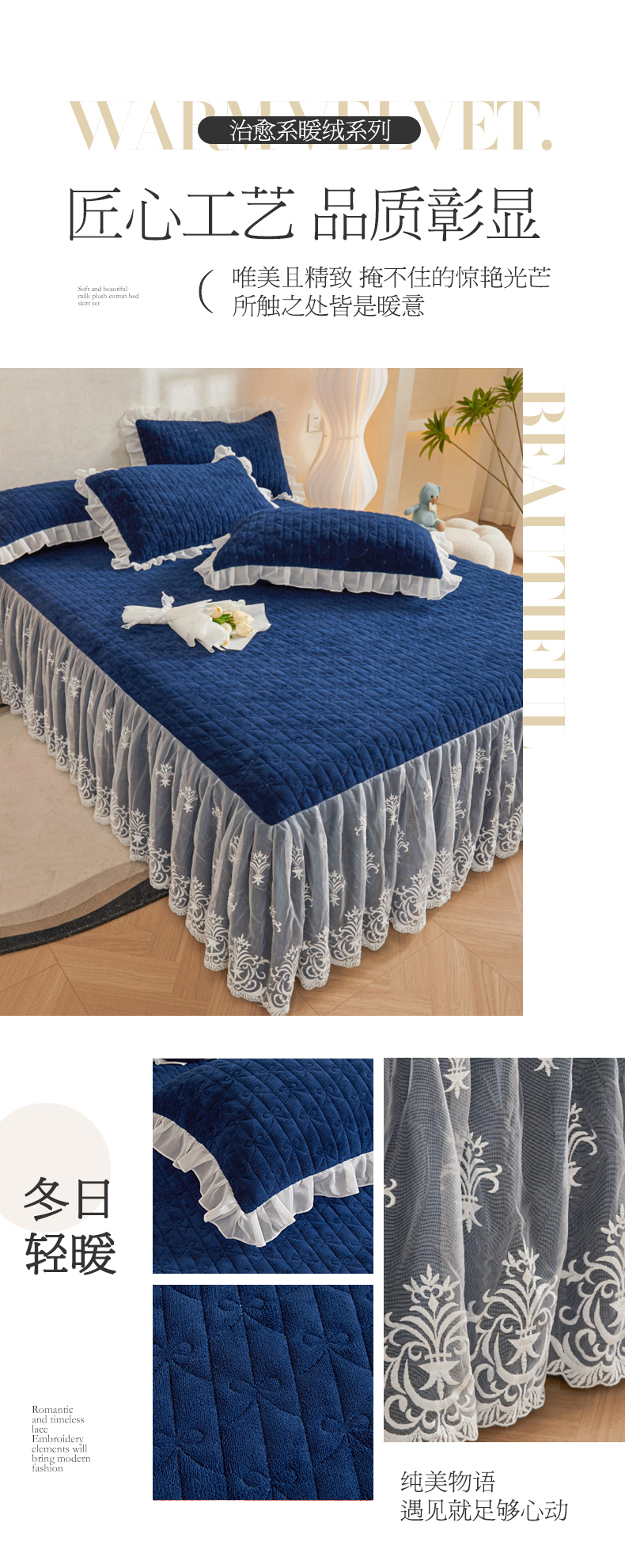 商品名称:虹星家纺 2023新款牛奶绒夹棉床裙套件清新系列-床裙款单床裙 清新-藏青