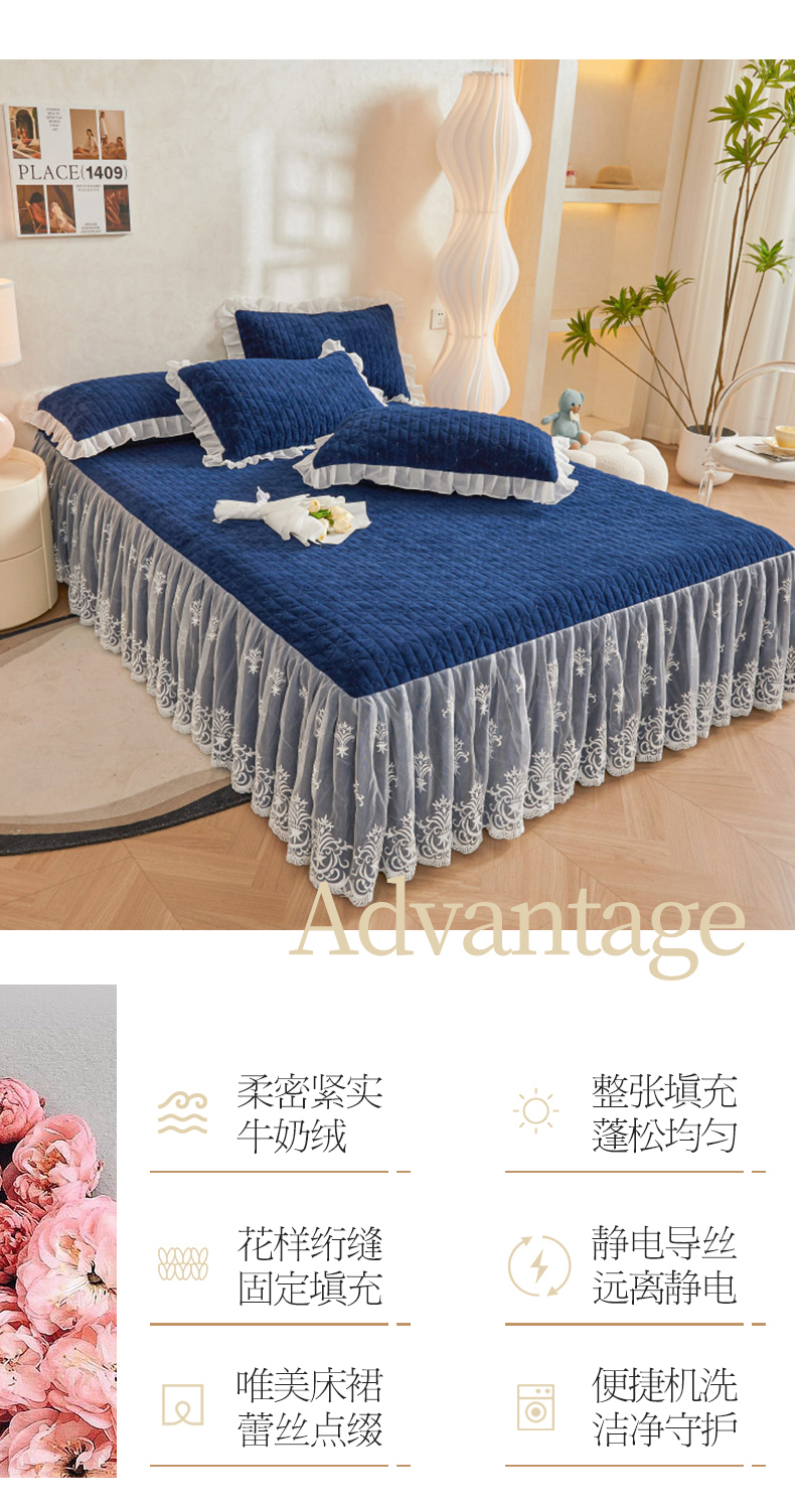 虹星家纺 2023新款牛奶绒夹棉床裙套件清新系列-床裙款单床裙 清新-藏青