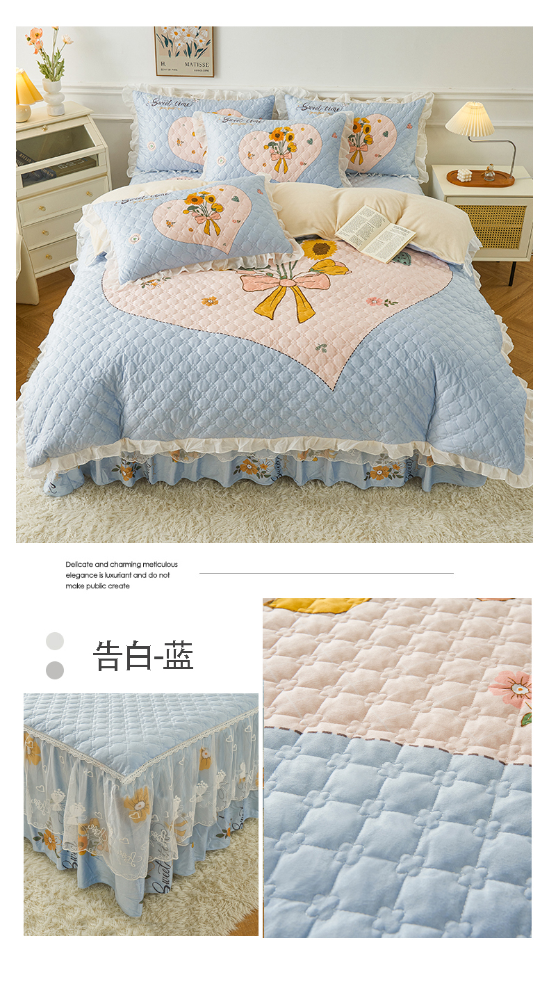 当前位置: 91家纺网 > 商品网购 > 床品套件 > 四件套 > 水晶绒四件套 > 爱思佳 2023新款180g水晶绒印花夹棉床裙款四件套卡通系列告白-蓝