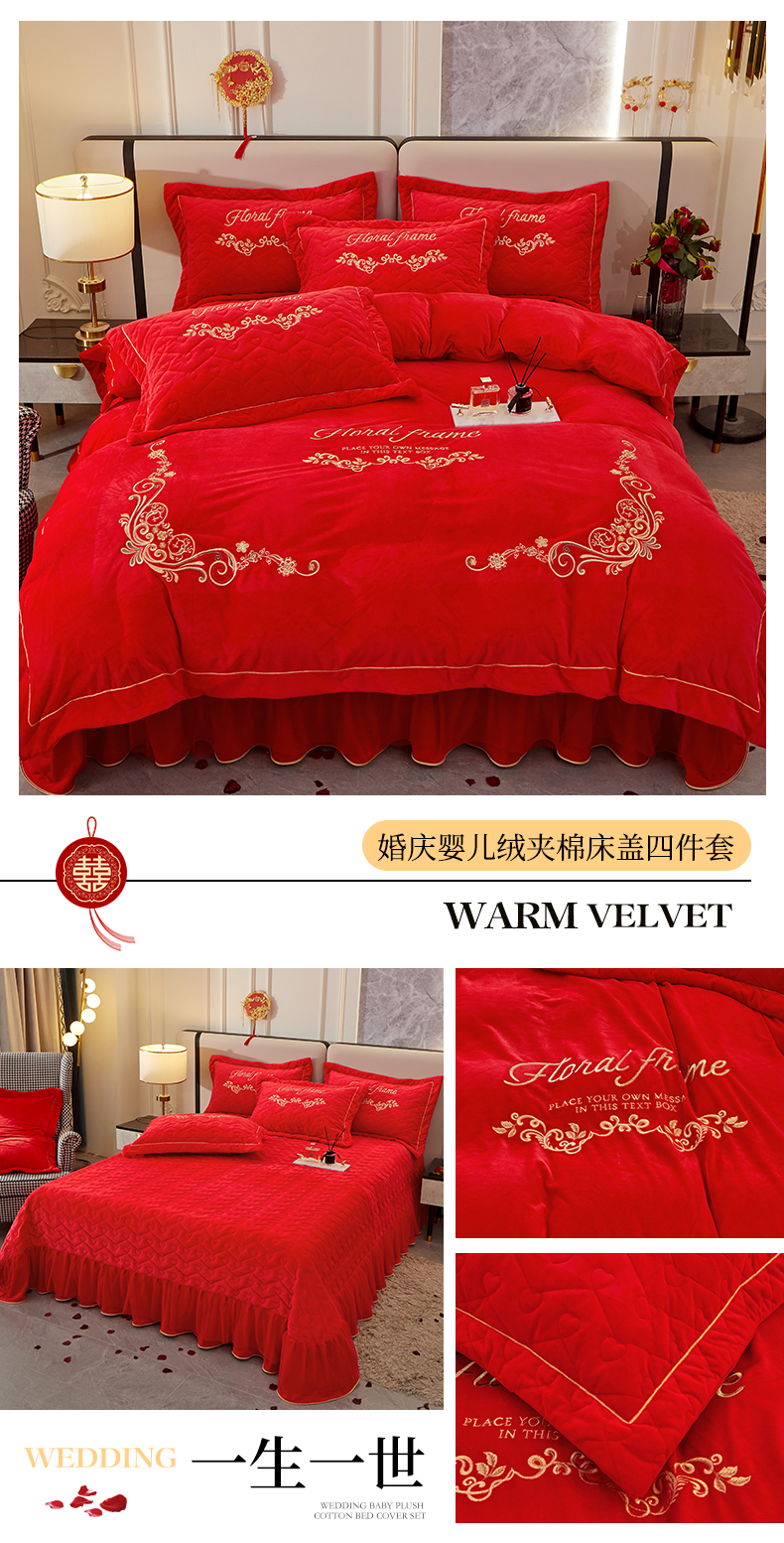 当前位置: 91家纺网 > 商品网购 > 床品套件 > 四件套 > 婚庆四件套 > 宜凡家纺 2023秋冬新品婴儿绒婚庆床盖四件套 一生一世