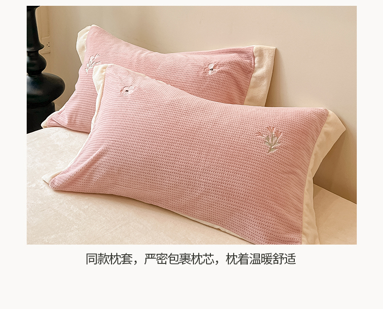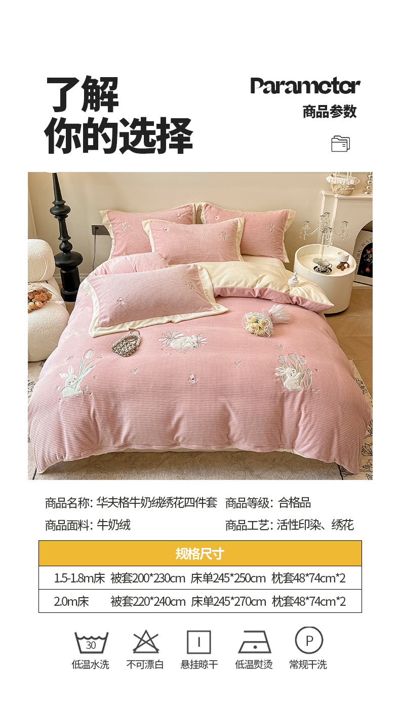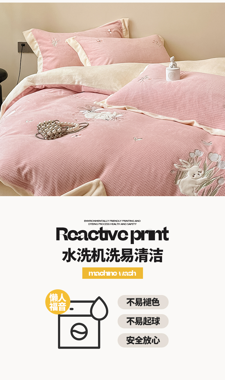 商品名称:懒猫家纺 2024新款【华夫格绣花】牛奶绒四件套 甜心小兔