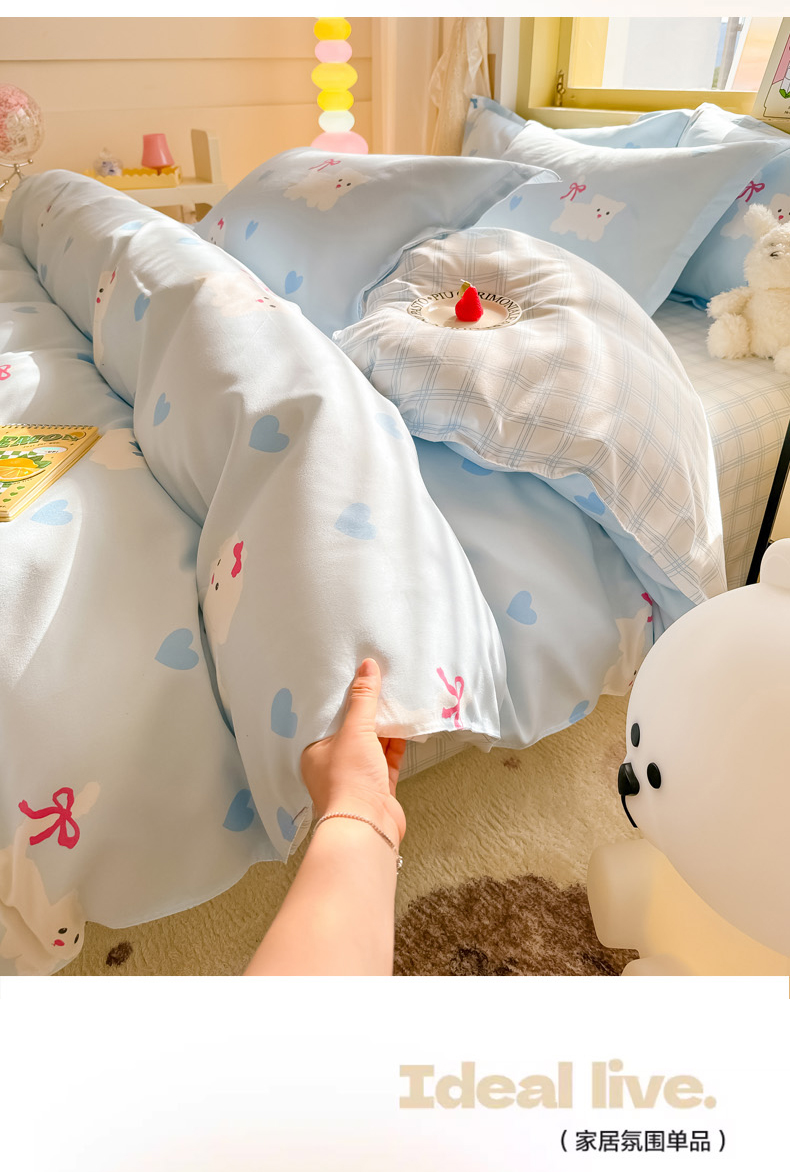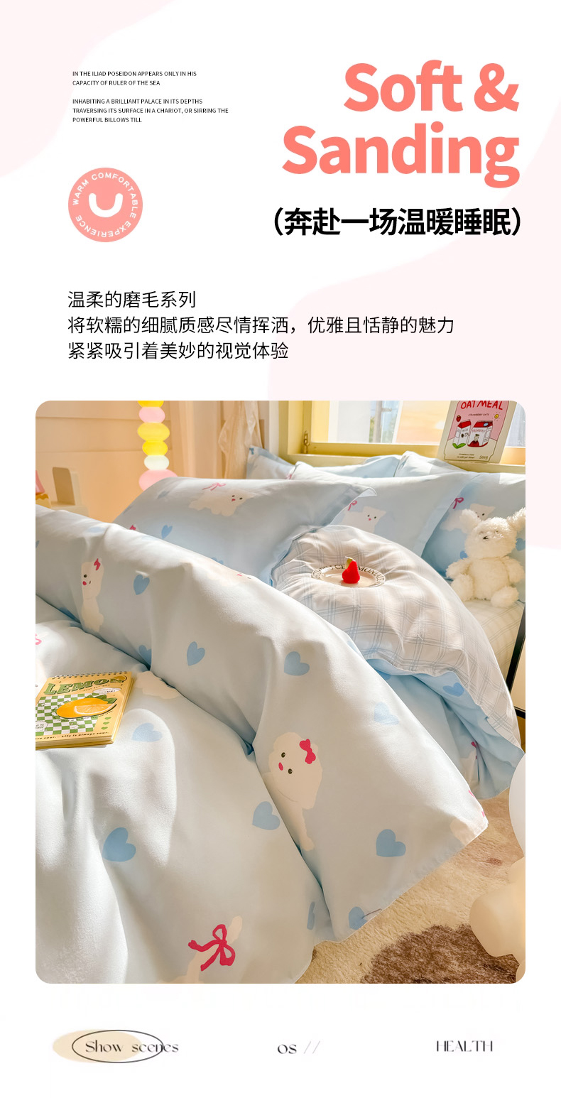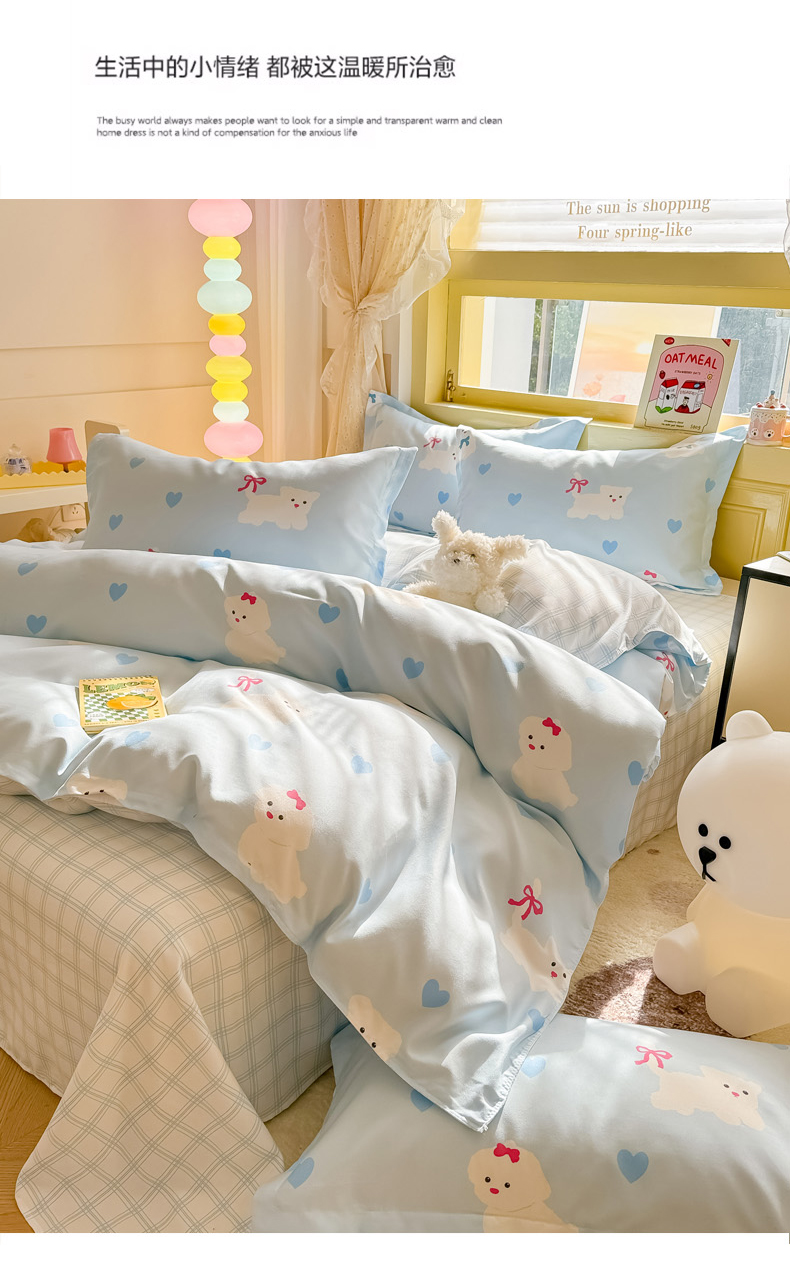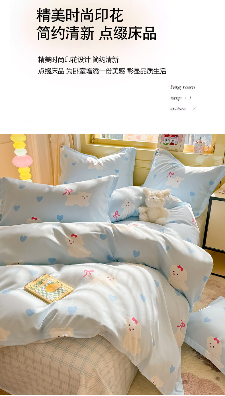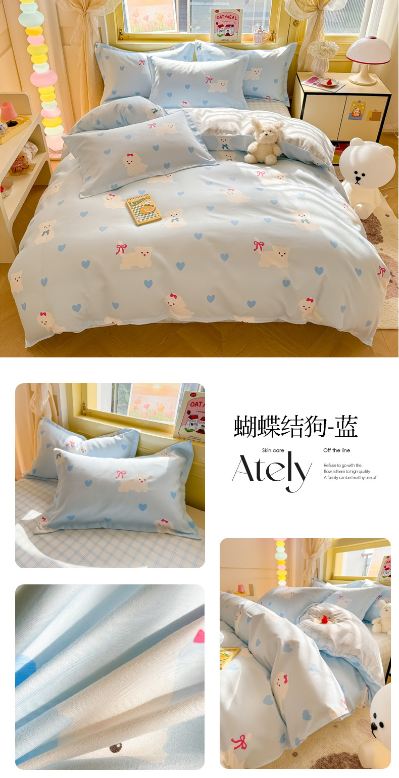 商品名称:花伞家居 2024直播网销斜纹加厚磨毛印花植物羊绒四件套-蝴蝶结狗-蓝