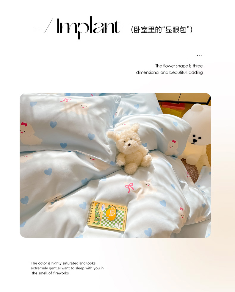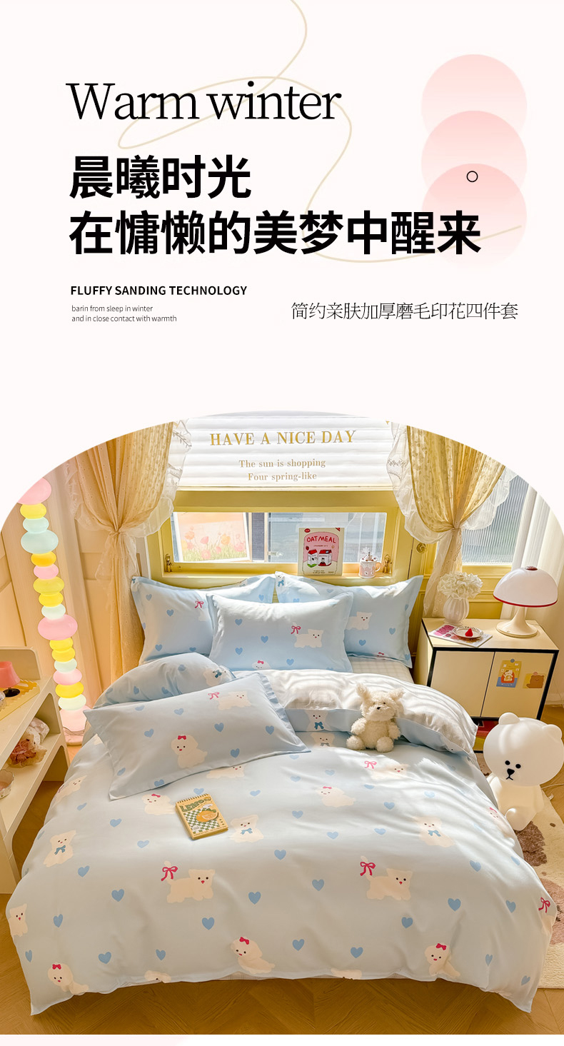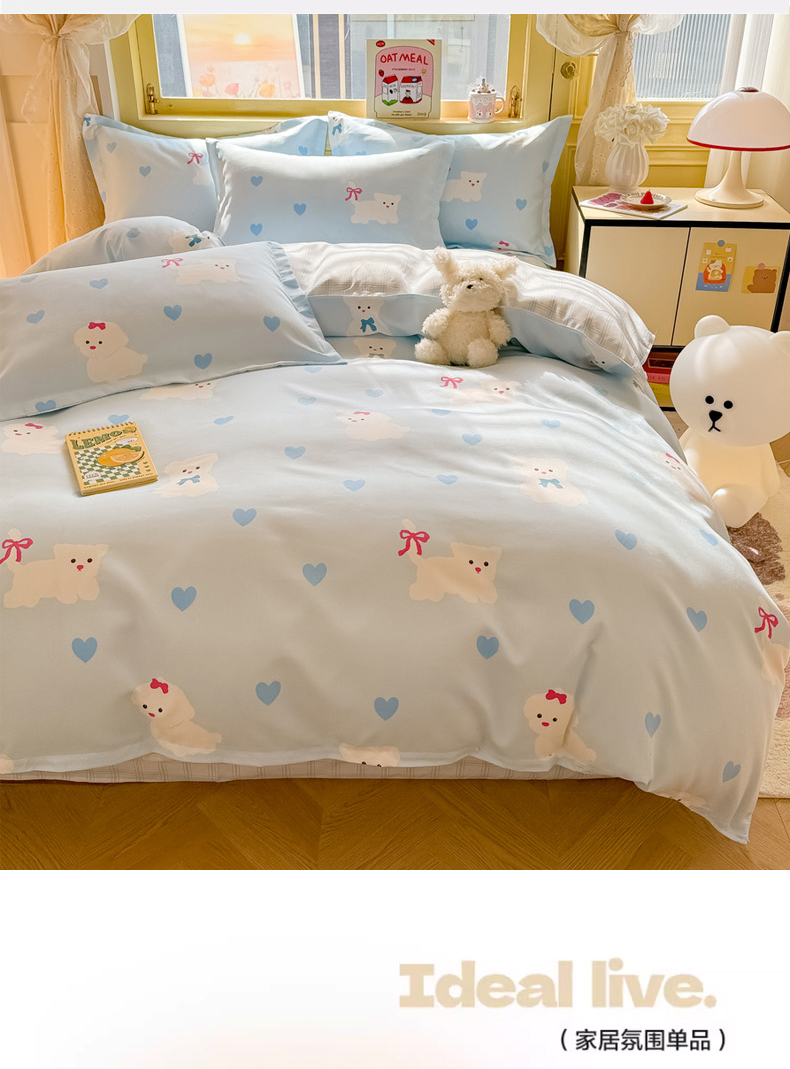 花伞家居 2024直播网销斜纹加厚磨毛印花植物羊绒四件套-蝴蝶结狗-蓝