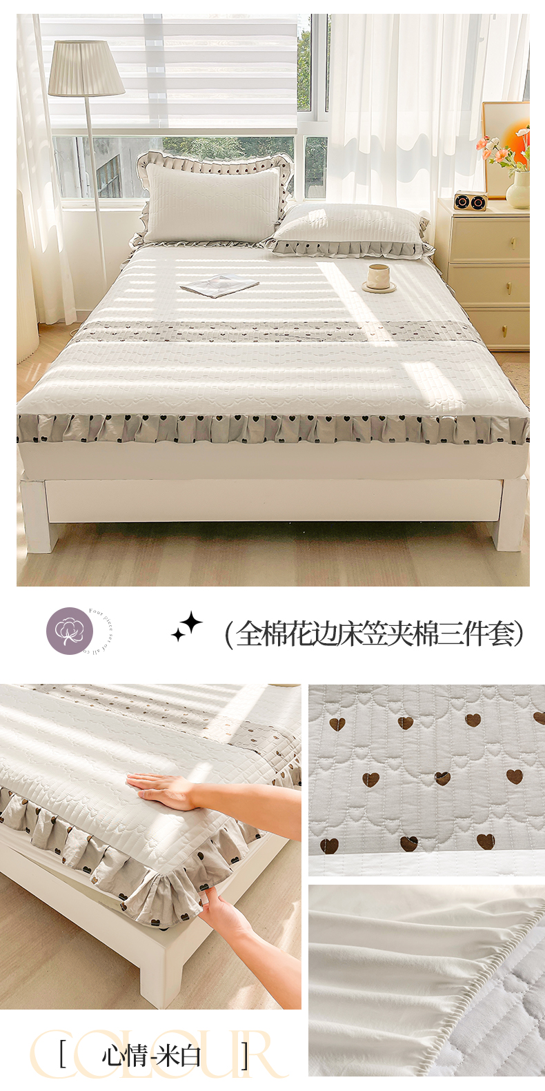宜凡家纺 2024新品全棉夹棉花边床笠三件套-心情 心情 米白