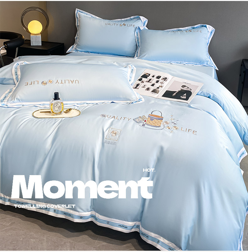 丝印良品 2024新款大牌风60S水洗真丝刺绣床笠被套四件套香奈系列 香奈-风铃蓝