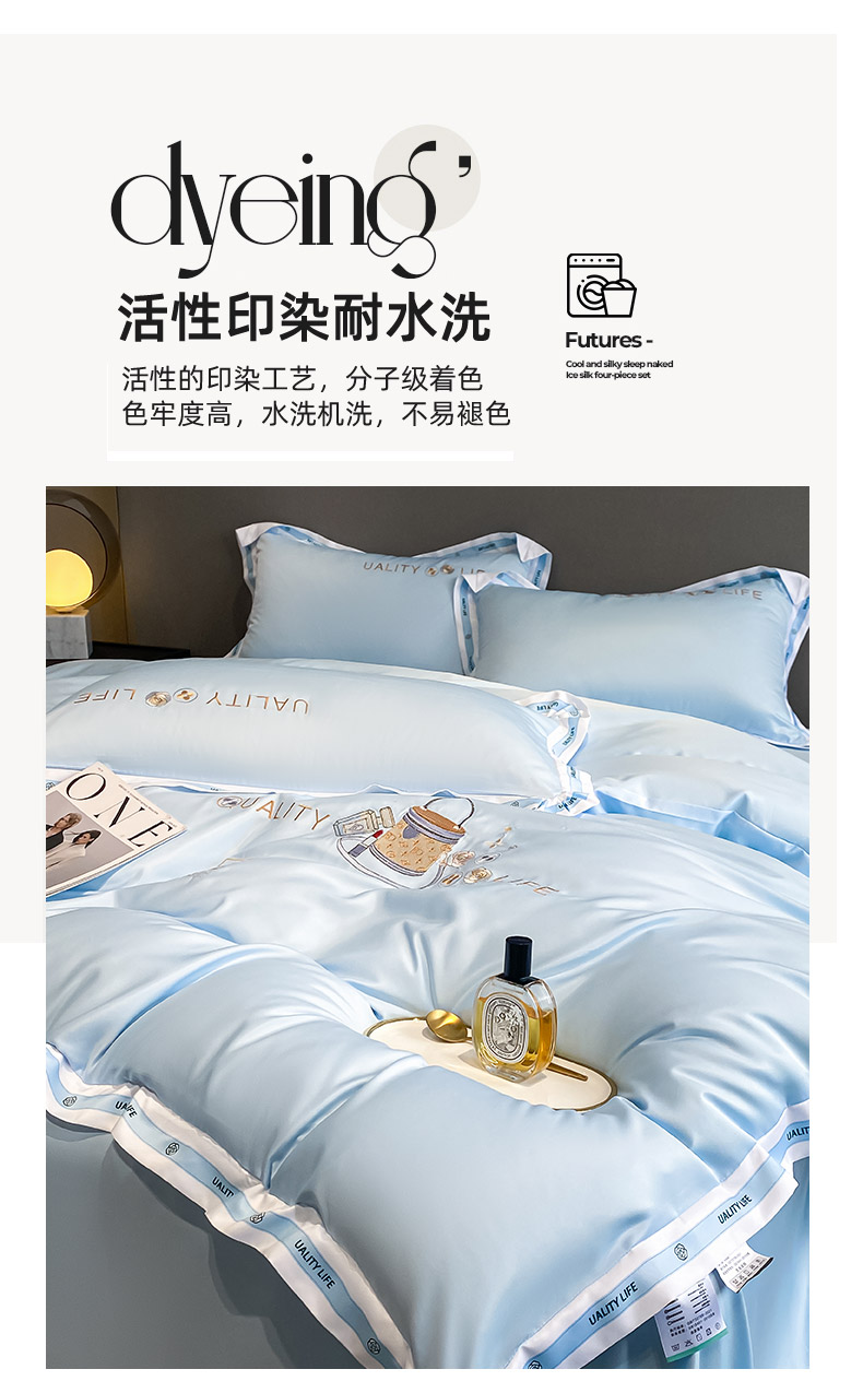 商品名称:丝印良品 2024新款大牌风60S水洗真丝刺绣床笠被套四件套香奈系列 香奈-风铃蓝